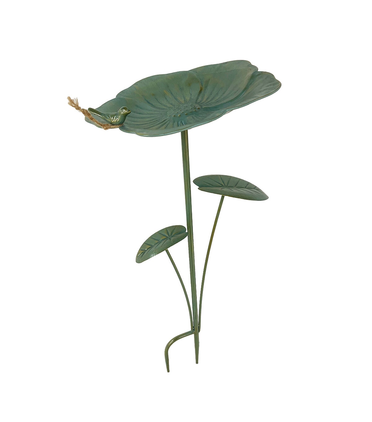 Attract beautiful birds to your patio or front yard using the Spring Lily Pad Birdbath Yard Stake by Place & Time This birdbath is shaped like a lily pad with a bird on it for added visual charm. Accents resembling leaves add to its charm. It will also make the perfect gift for your birder friend.