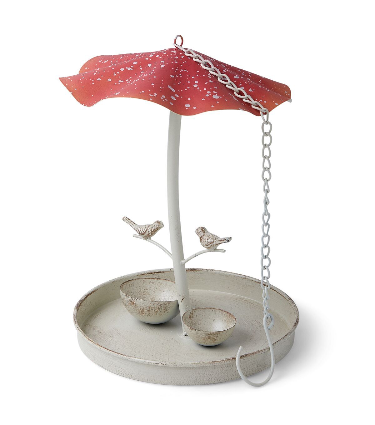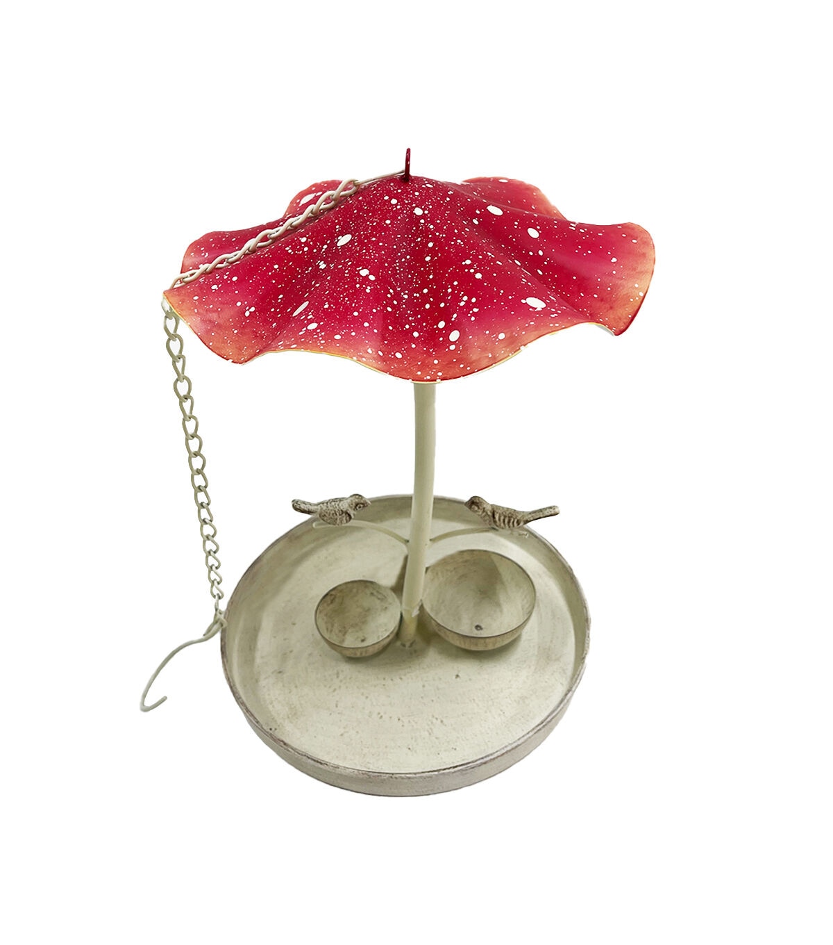 The Spring Red Iron Mushroom Bird Feeder by Place & Time will make the perfect addition to your garden decor. This bird feeder is shaped like a mushroom and decorated with accents resembling birds. Two small containers for seeds and water complete this feeder. You can use the chain and hook on top to hang it.