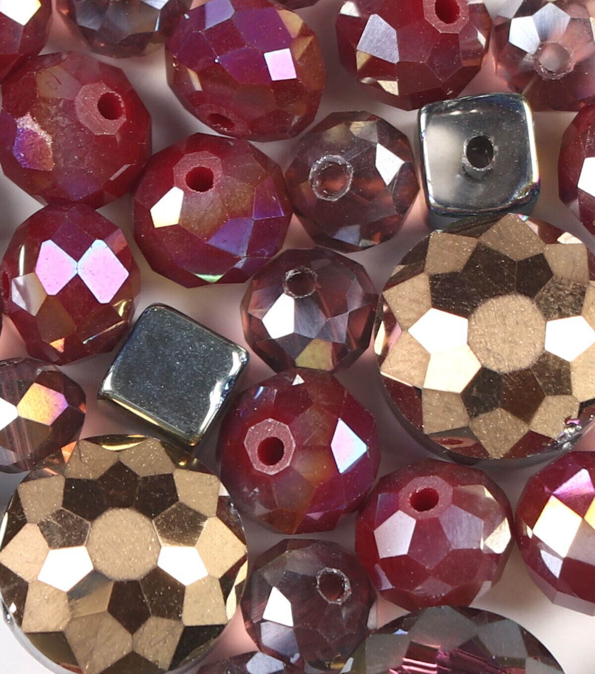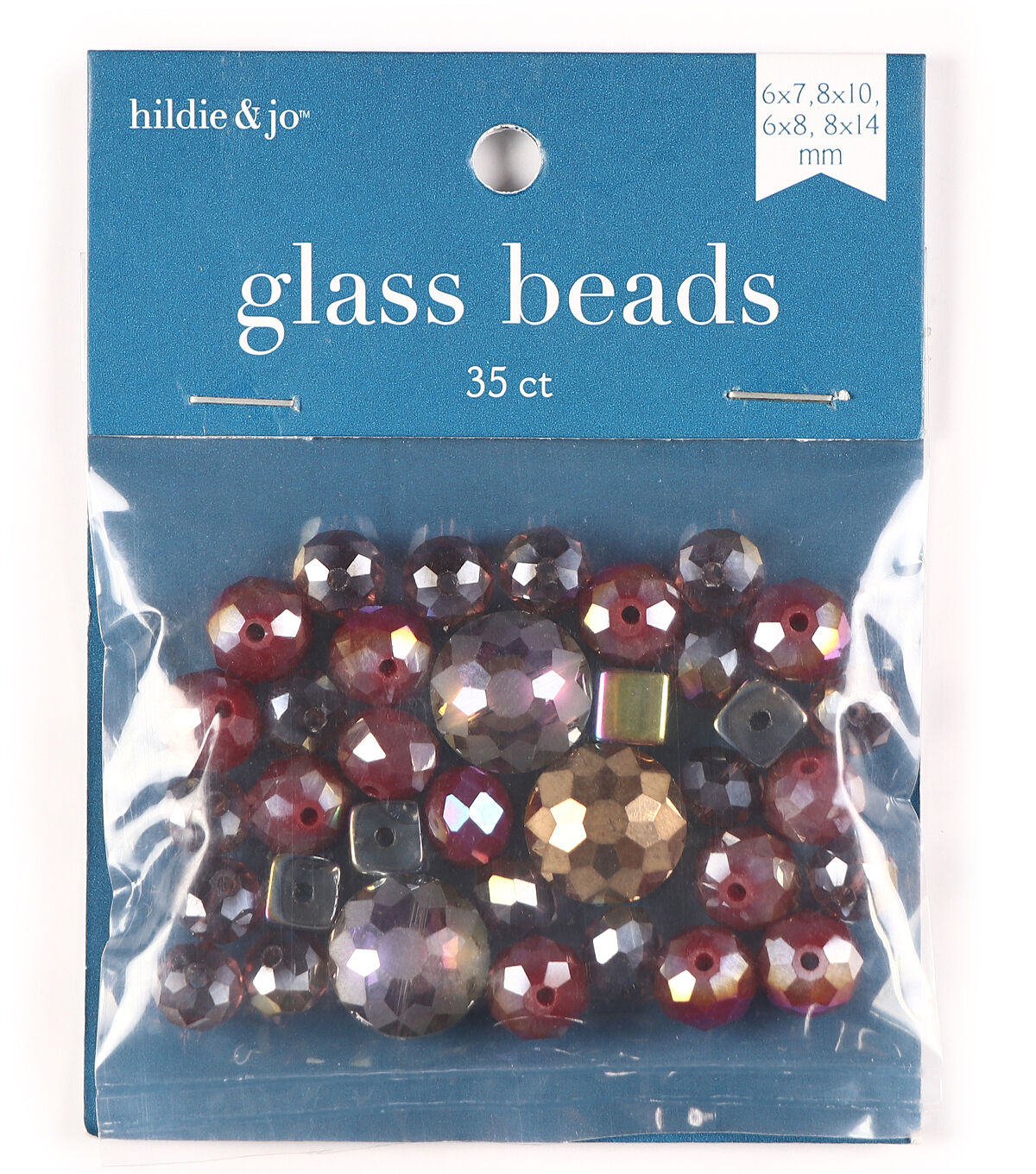 Use the hildie & jo Boulevard Mixed Glass Beads - Iridescent Burgundy & Blue to design stunning handmade necklaces, bracelets and earrings. This pack includes 35 glass beads in assorted sizes. These beads have facets including round, square and oval. You can also string these dazzling glass beads together to accentuate clothing and accessories.