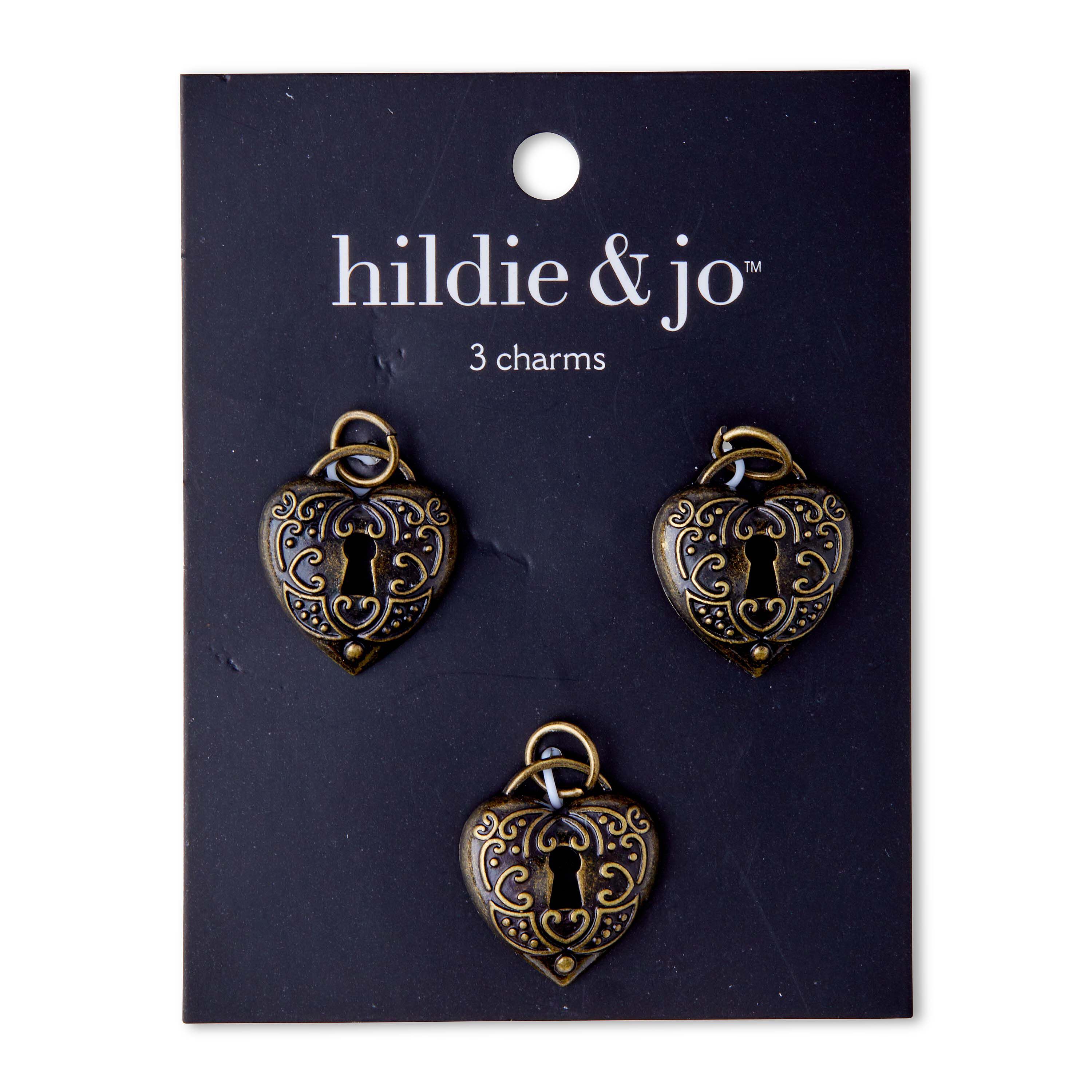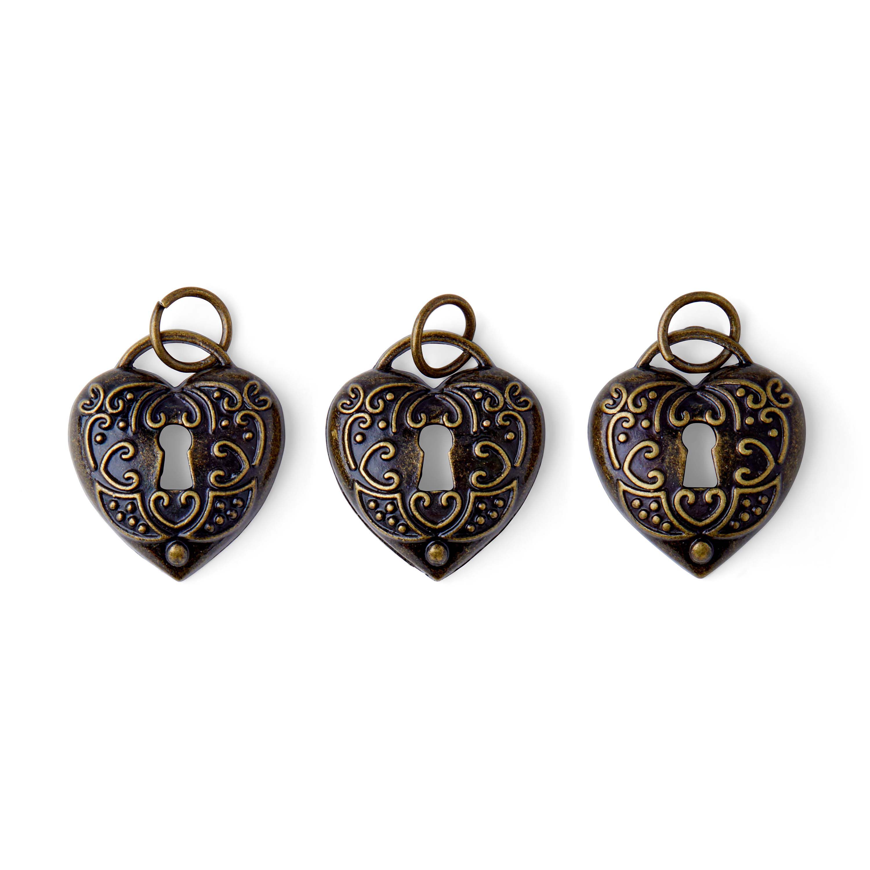 Personalize a DIY craft project using these hildie & jo Antiquist Heart Antique Gold Charms. These vintage-inspired charms come in a pack of three and are in a heart shape. The center of the heart is an open keyhole, which is artistically surrounded by a scroll pattern. At the top lies an arch in antique gold that smoothly links the two sides of the heart. Add these charms to your favorite bracelets, necklaces, key chains and more.