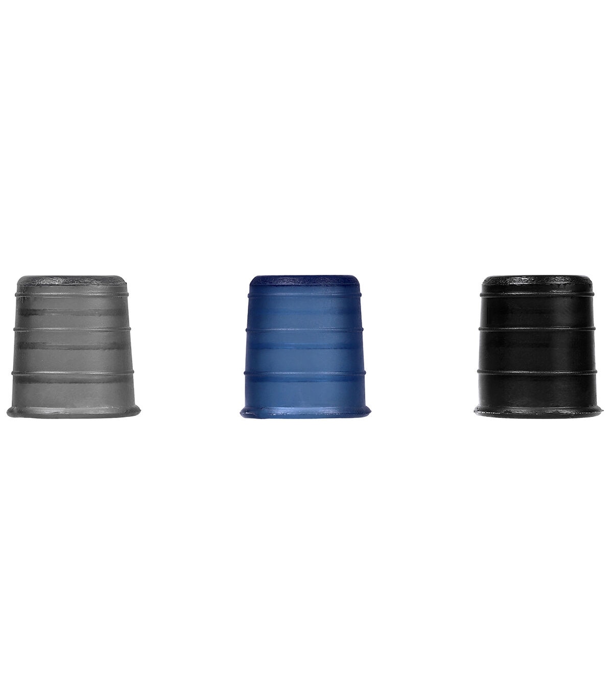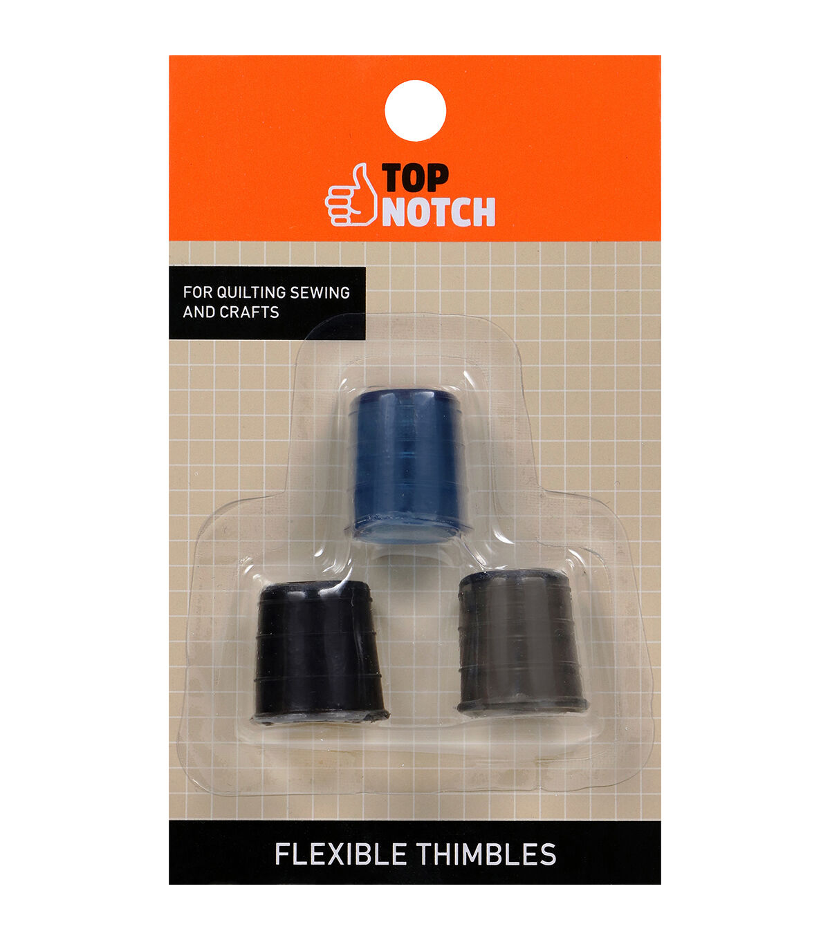 - The Top Notch Flexible Thimble Set contains three soft thimbles for hand sewing, quilting, crafts, and needlework. Made from flexible PVC plastic for better fit, these thimbles feature a thick rubber tip for added protection when pushing needles through heavier weight fabrics. With these attractive finger protectors, hand sewing and needlework projects become easier and more comfortable. The set includes three thimbles in light grey, dark grey, and navy blue. Each thimble measures ¾” in diameter and ¾” in length, which will comfortably fit most fingers. The flexible material also conforms to the shape of your finger, giving you a more natural feel when hand sewing while still comfortably protecting your fingertips. With the Top Notch Flexible Thimble set, you can easily and effectively guide needles through fabrics of all weights, making sewing and quilting projects simple, fast, and comfortable. Attractive and functional, these flexible thimbles are a great addition to any sewing kit.