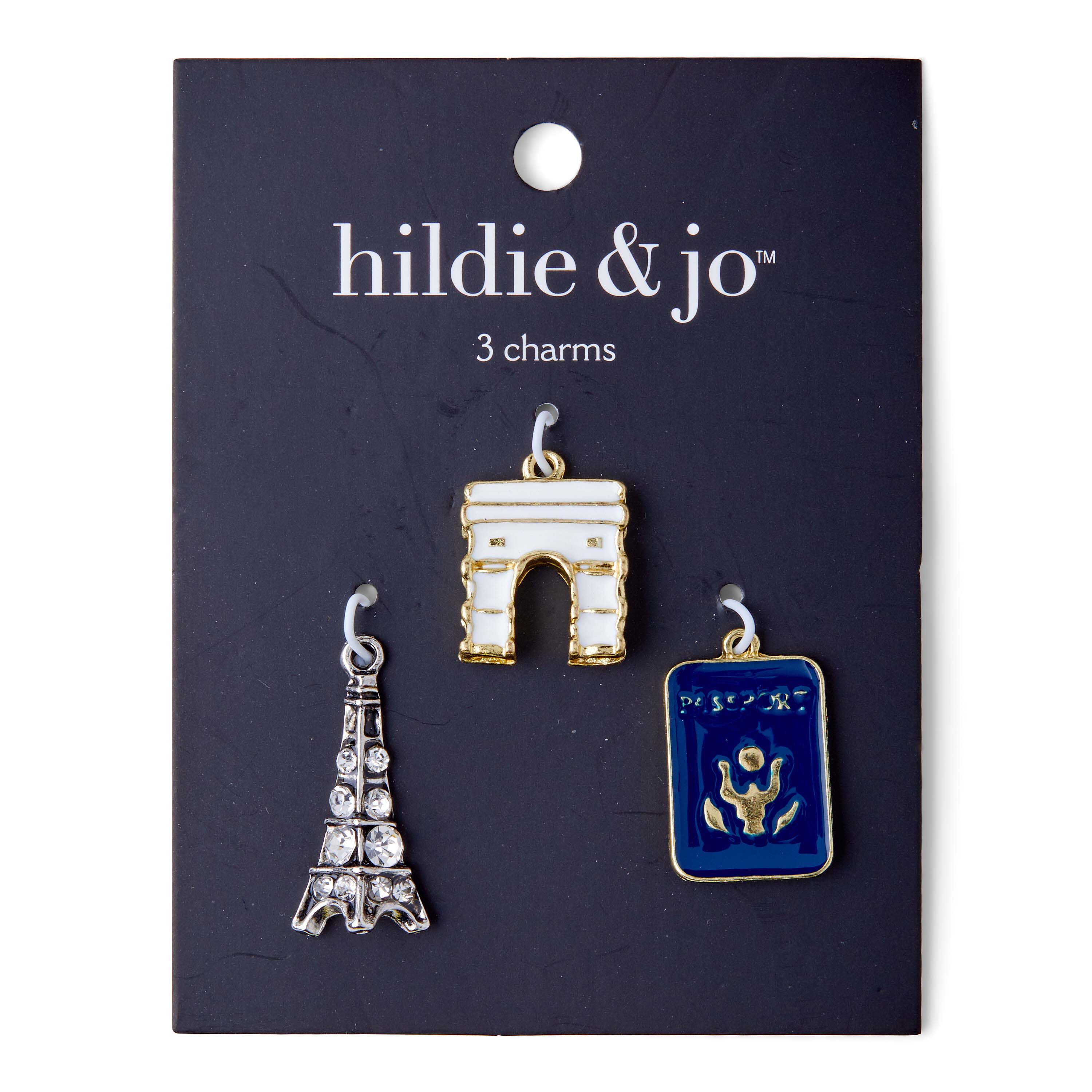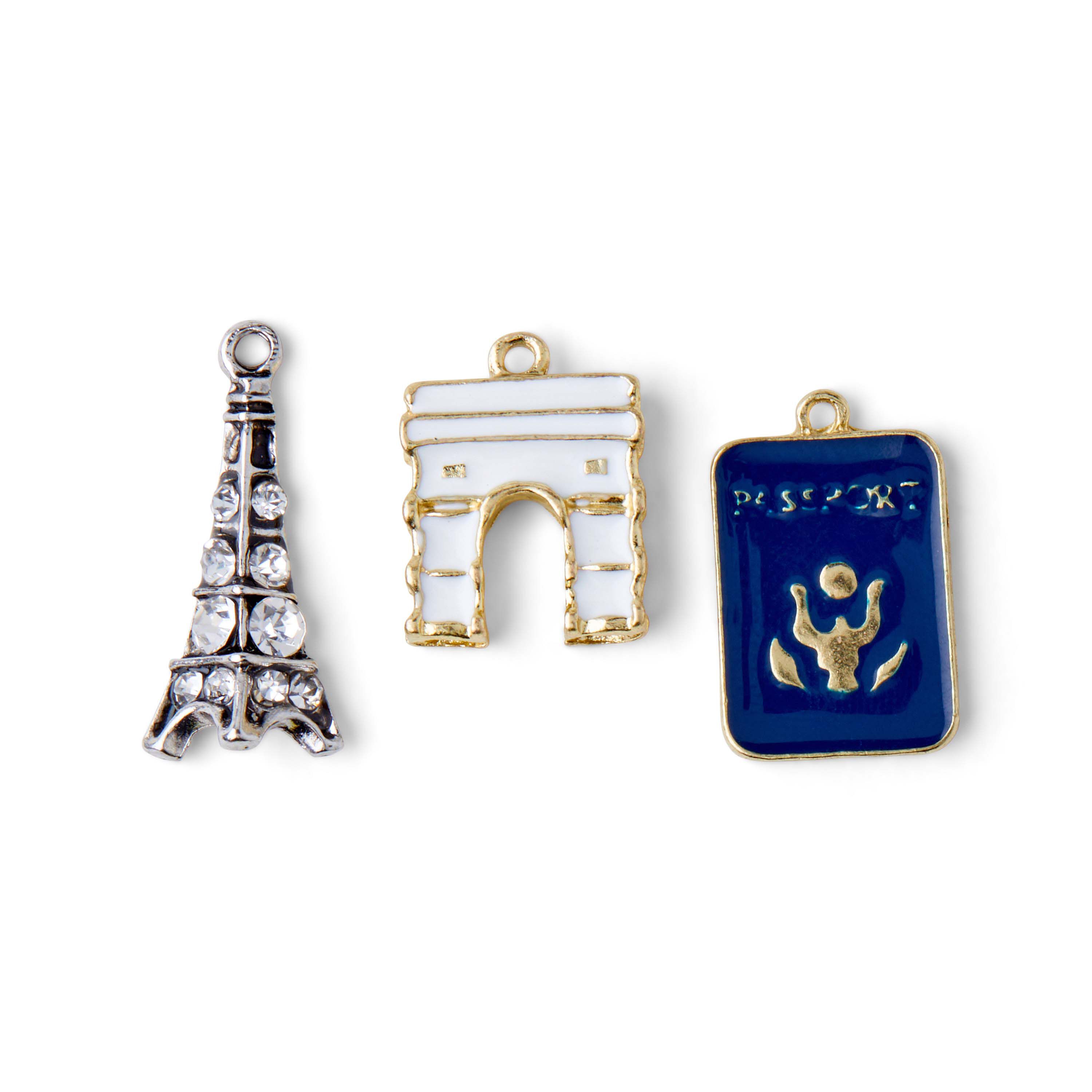 Oo la la! Add these Paris charms to your charm bracelet for a little French flair. Features the Eiffel Tower, L' Arc de Triomphe and of course, your passport!