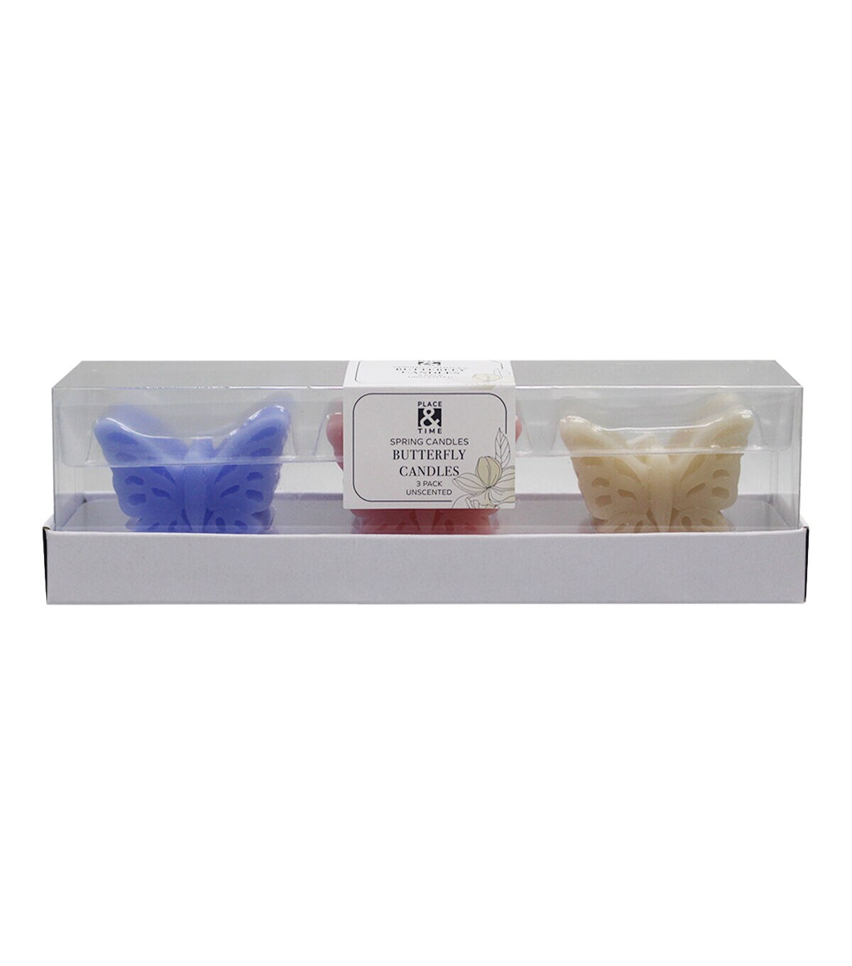 Add a warm glow to your spring home decor with the Spring Butterfly Unscented Tealight Candles by Place & Time. This pack contains three tealight candles shaped like butterflies. They are unscented and flaunt beautiful hues. Use them to add a finishing touch to a seasonal centerpiece. You can also add these tealight candles to a housewarming gift basket.