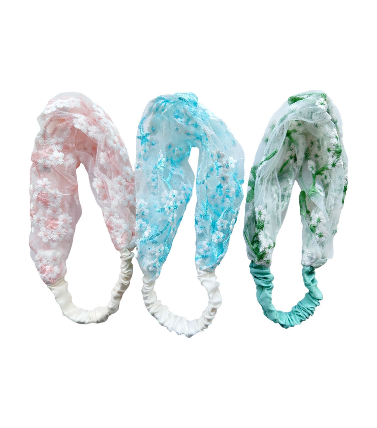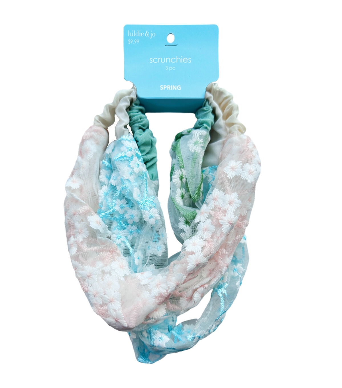 Spruce up a simple hairdo with the Spring Multicolor Lace Soft Scrunchies by hildie & jo. This pack includes three lace headbands sporting a floral pattern. Each of them flaunts blue, green or pink shades to match your different seasonal outfits. They will be perfect to accessorize your dress for a spring gathering.