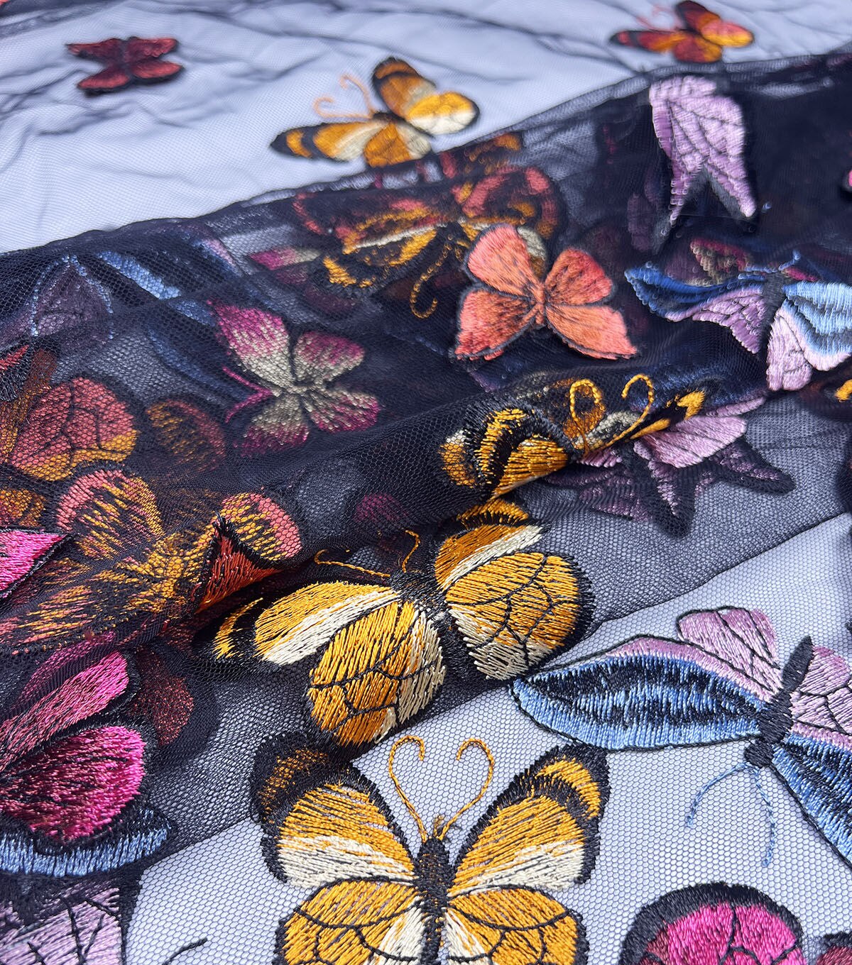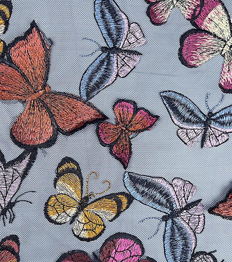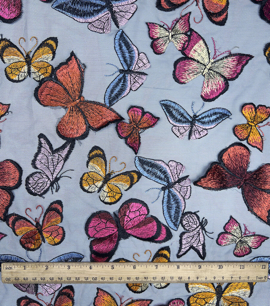 Our 3D Butterflies on Blue Mesh Fabric is made with 100% polyester, ensuring durability and longevity. It is easy to care for, simply hand wash separately in cold water and line dry. Do not iron or bleach. Imported for your convenience.
