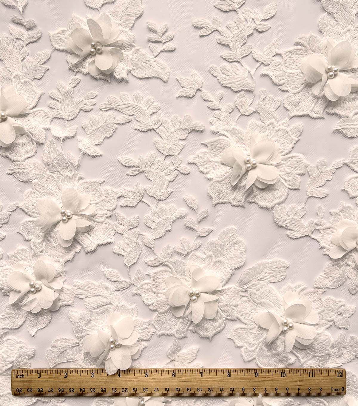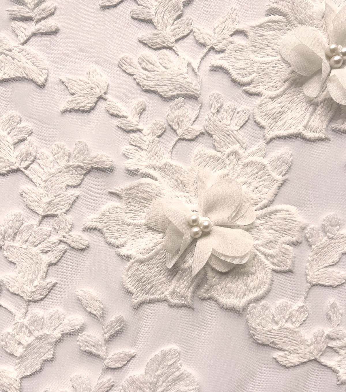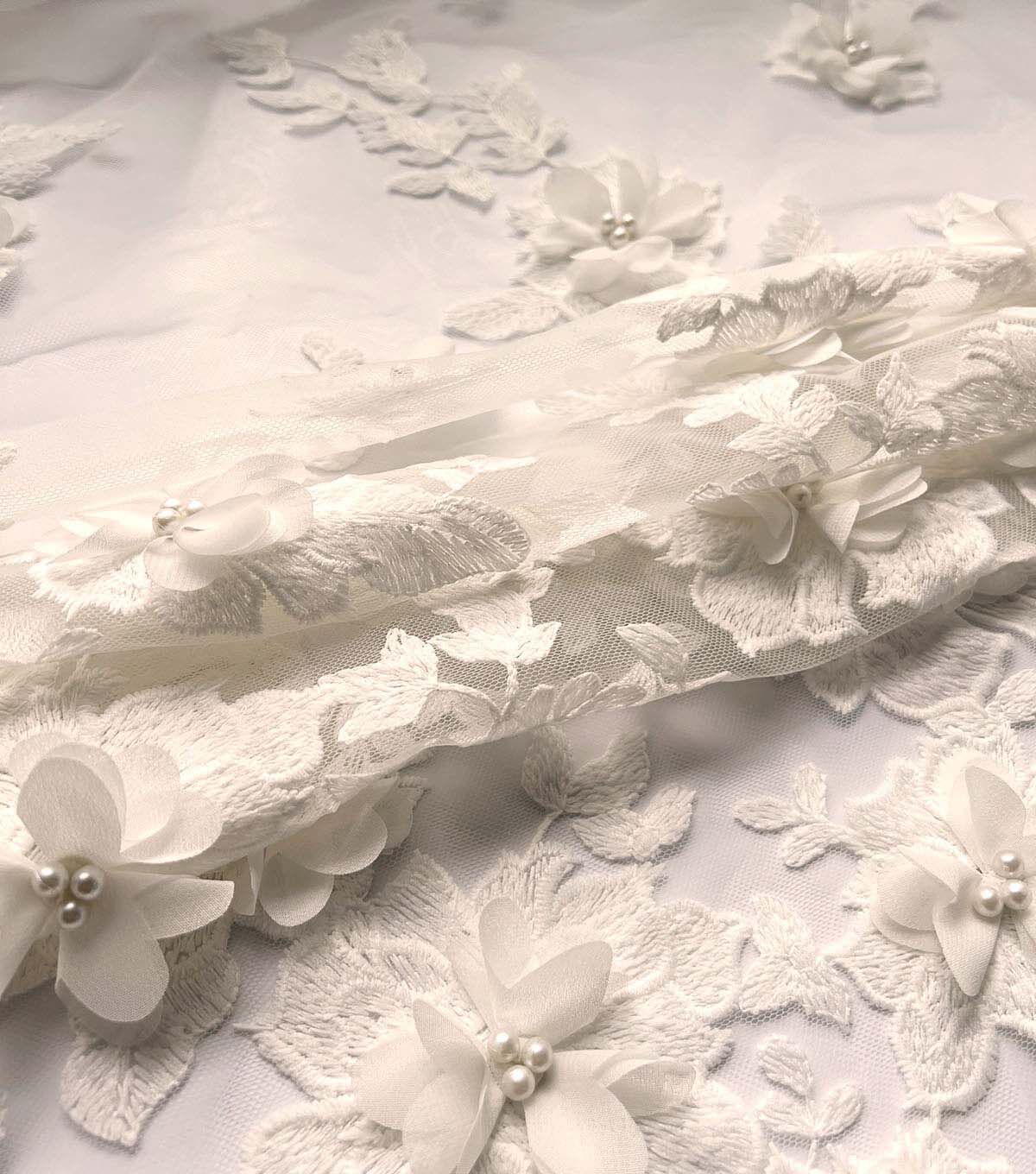 Whether you're a fashion designer or a DIY enthusiast, this fabric is sure to impress. So why settle for ordinary fabrics when you can create something truly extraordinary with our 3D White Floral Embroidered With Pearls Mesh Fabric?
