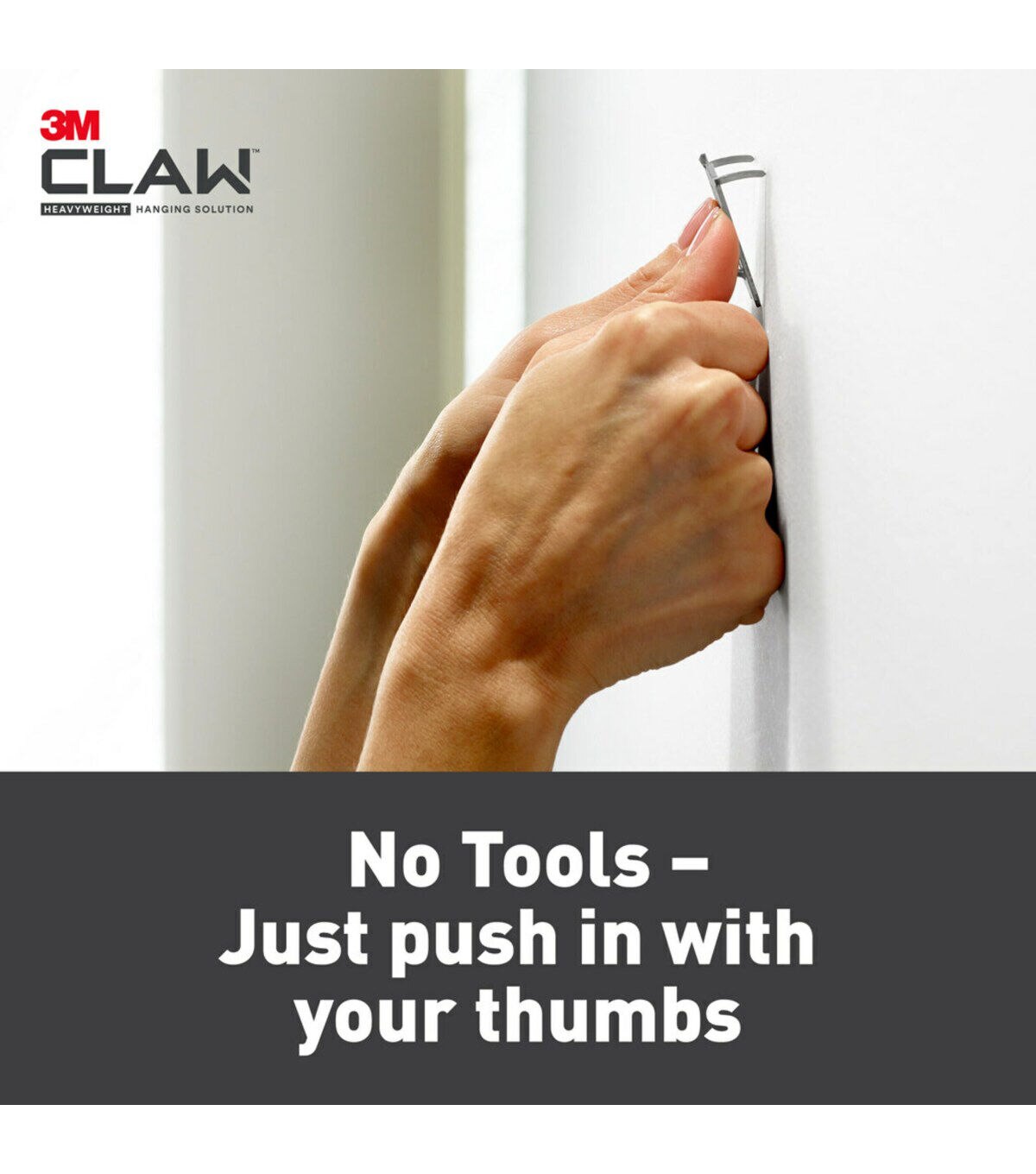 Trust your heavyweight hanging projects to the 3M CLAW Drywall Picture Hanger proven to hold 15, 25, 45 and 65 pounds. Designed specifically for drywall, choose 3M CLAW Drywall Picture Hangers to hang frames, mirrors, wall art and other heavy items. The engineered hardened steel claws lock securely into drywall anywhere – just push, hang and you’re done. No tools, no studs, no regrets.