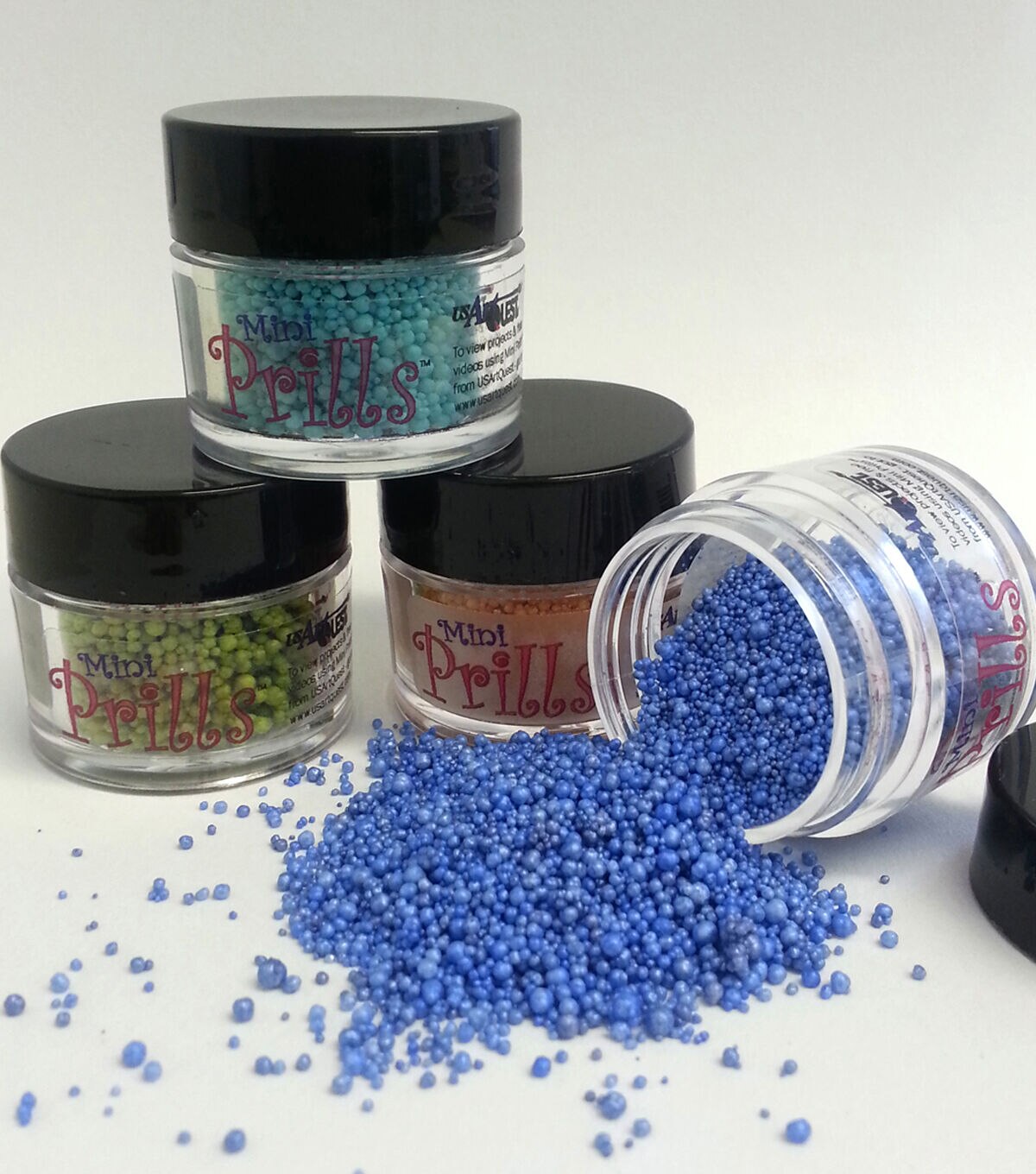 US Artquest-Prills. Small, round, pearl-like accents for all arts and crafts! Adhere with any clear drying adhesive or tape. They provide interesting effects and inclusions for paper arts, as holiday and all occasion embellishments, and for accents in snow, and for vintage-look projects. This package contains one 3oz jar of prills. Comes in a wide variety of colors. Each sold separately. 100% natural, acid-free and non-toxic. Made in USA.