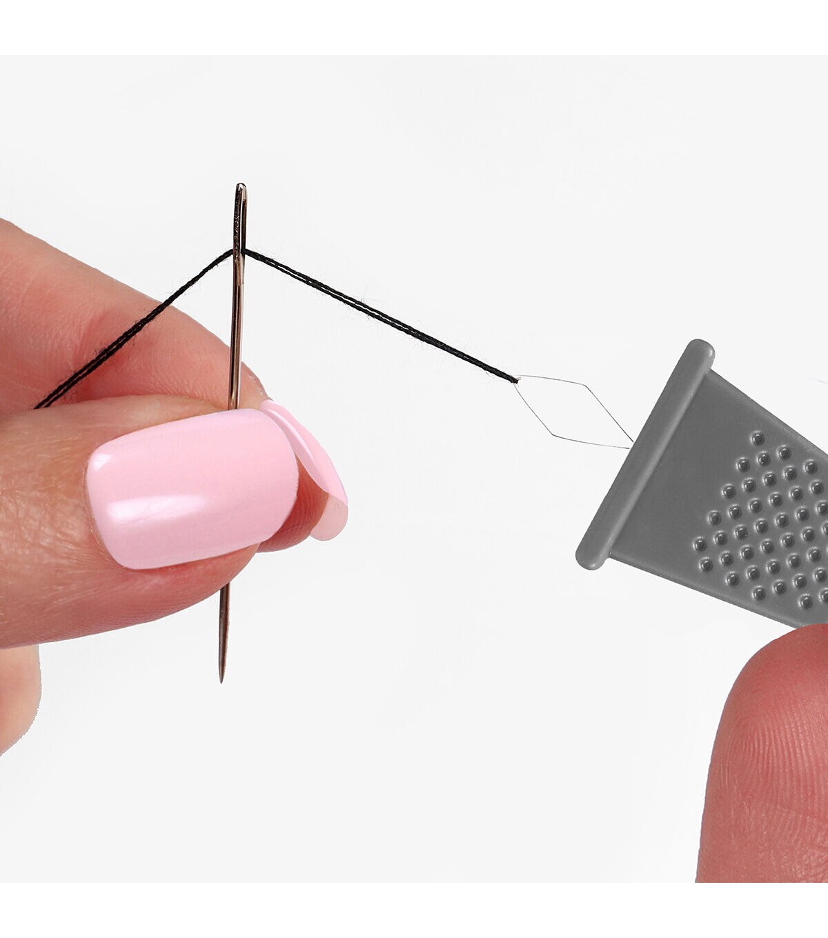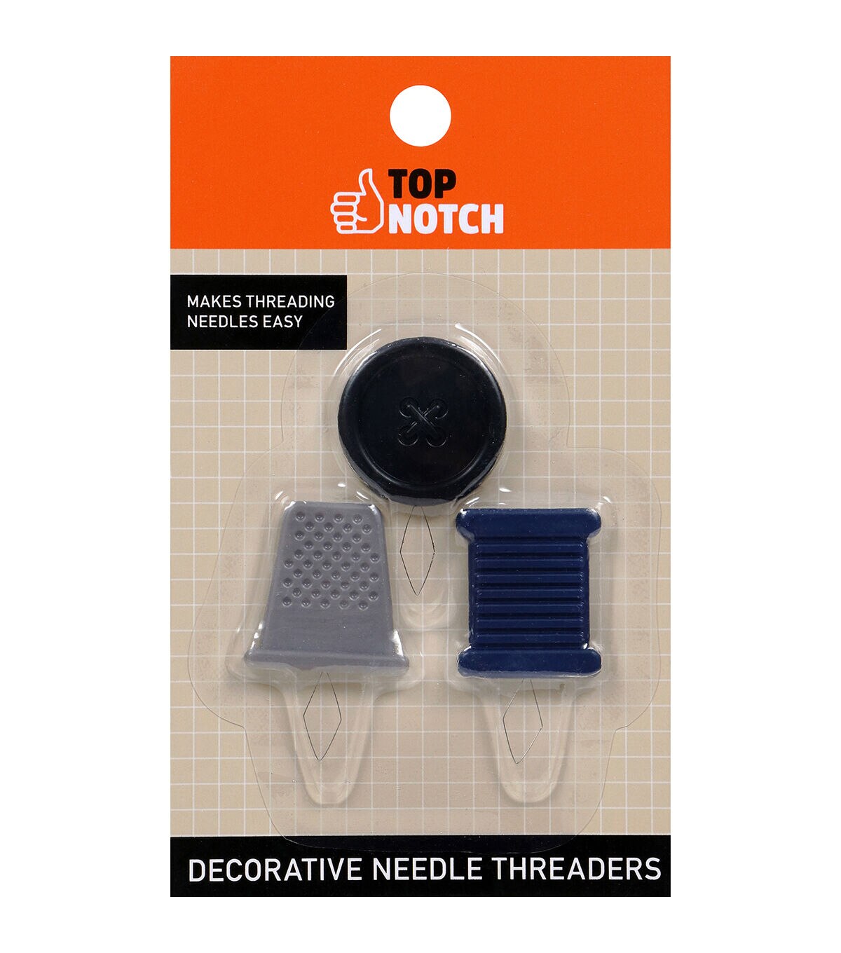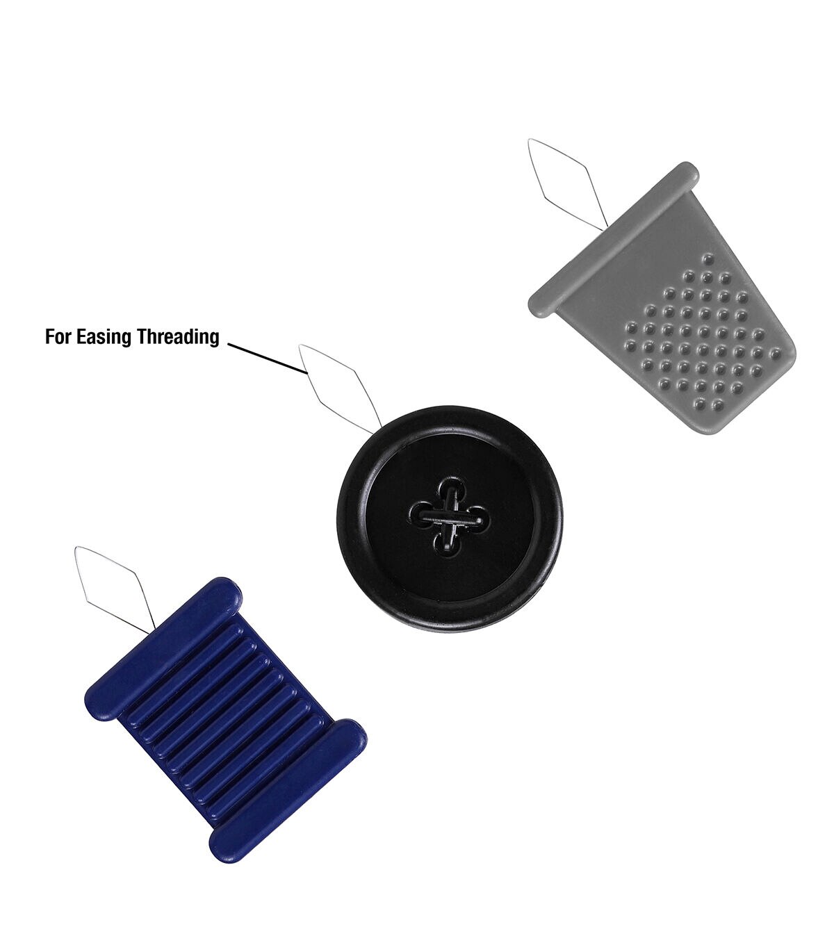 - Why struggle with trying to fit a thread end into a tiny needle eye when you can simply use these versatile sewing tools to thread your needles in a jiffy? The Top Notch Decorative Shaped Threader Set includes three versatile needle threaders that can be used with sewing thread, embroidery thread, or Persian yarn. These needle threaders can be used to easily thread both hand and machine needles. Simply push the wire end through the eye of the needle, add the thread, and easily pull the thread back through the needle. The sewing tools’ bases are made from durable plastic for a solid grip and easy maneuverability. Each set includes three whimsically shaped threaders: a black button, a light gray thimble, and a navy blue thread spool. Keep one in your sewing basket, one in your travel kit, and another by your sewing machine so that you always have one handy when you need to thread a needle.