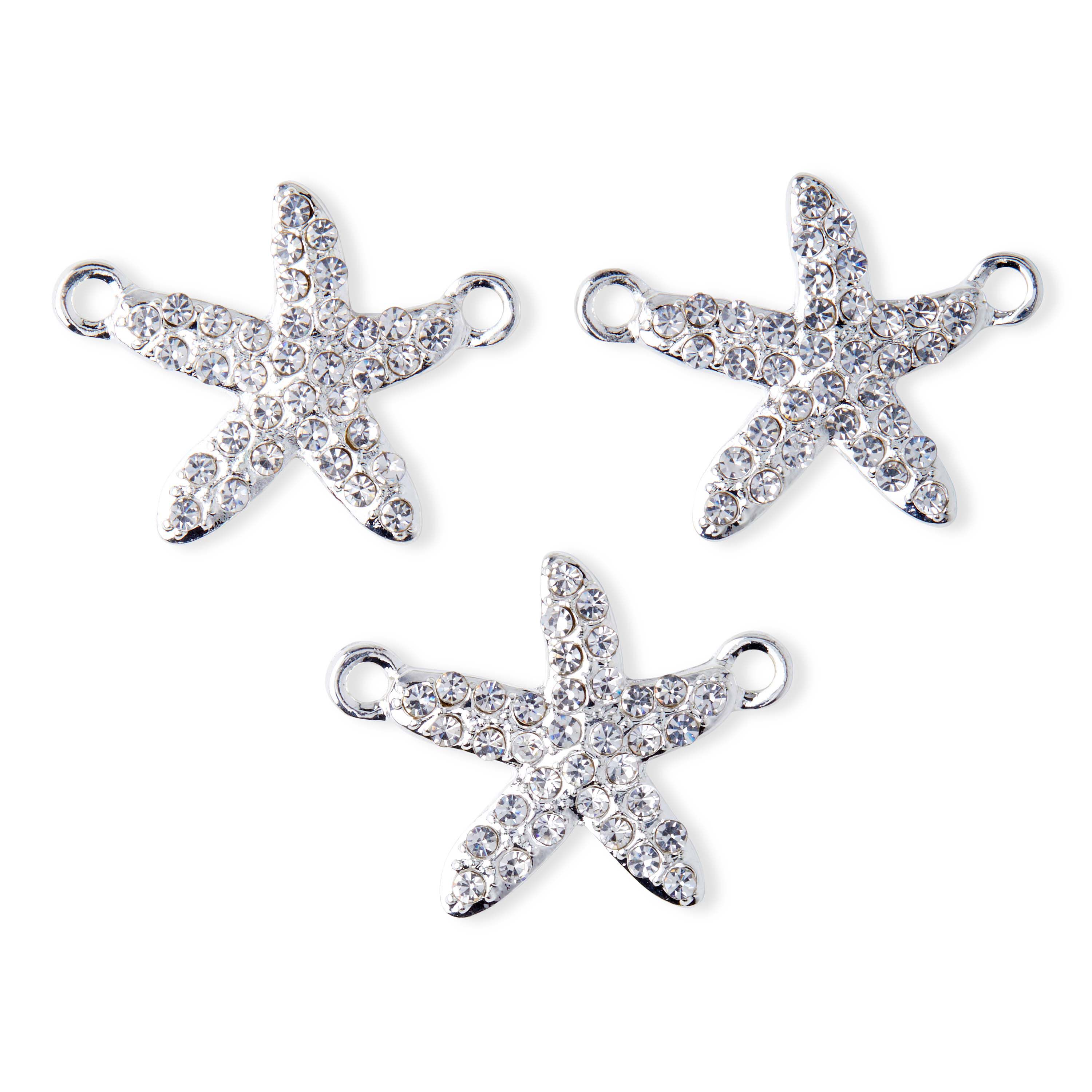 Easily add chains and bead strands into a necklace or other jewelry piece with these bright, highly detailed starfish shaped connectors. Each has a round connector on each side for attaching chains or jump rings. Decorative links that will add brightness and depth to a variety of designs. 3 pc/pkg. Color: Silver