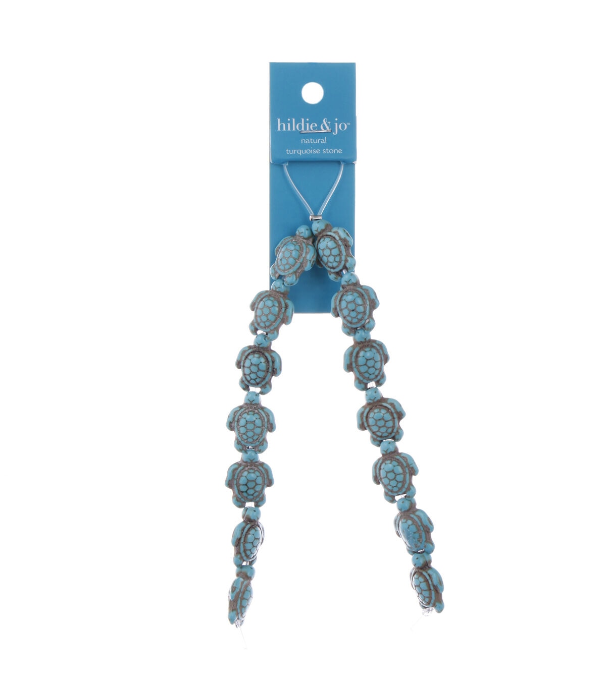 Give a fun and quirky vibe to your jewelry-making projects with the hildie & jo Faux Turquoise Stone Turtle Strung Beads. This pack contains a strand of reconstituted, turquoise stone beads shaped like small turtles. Pair them with coordinating metal and glass beads to create unique handmade beading and DIY pieces for your friends and family.