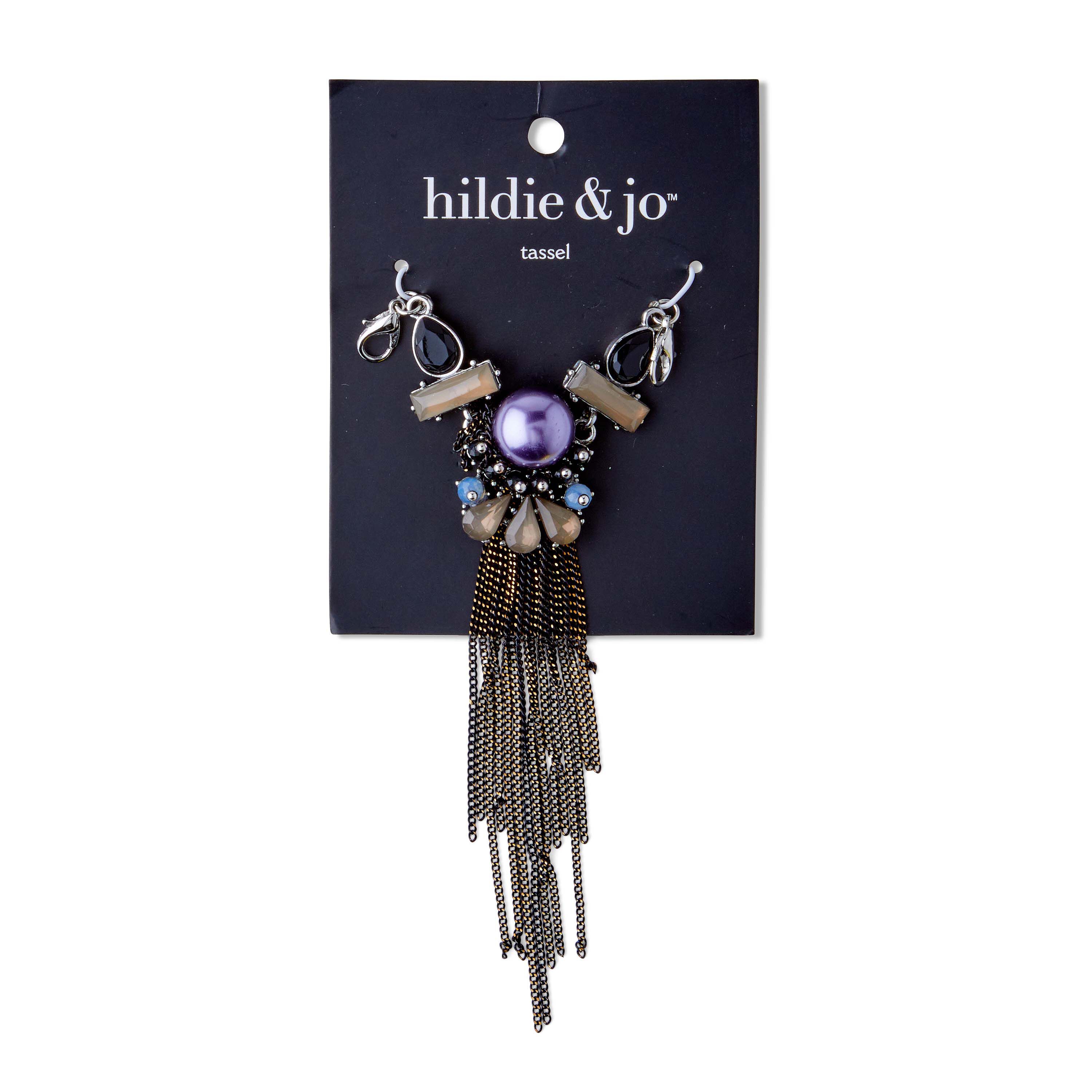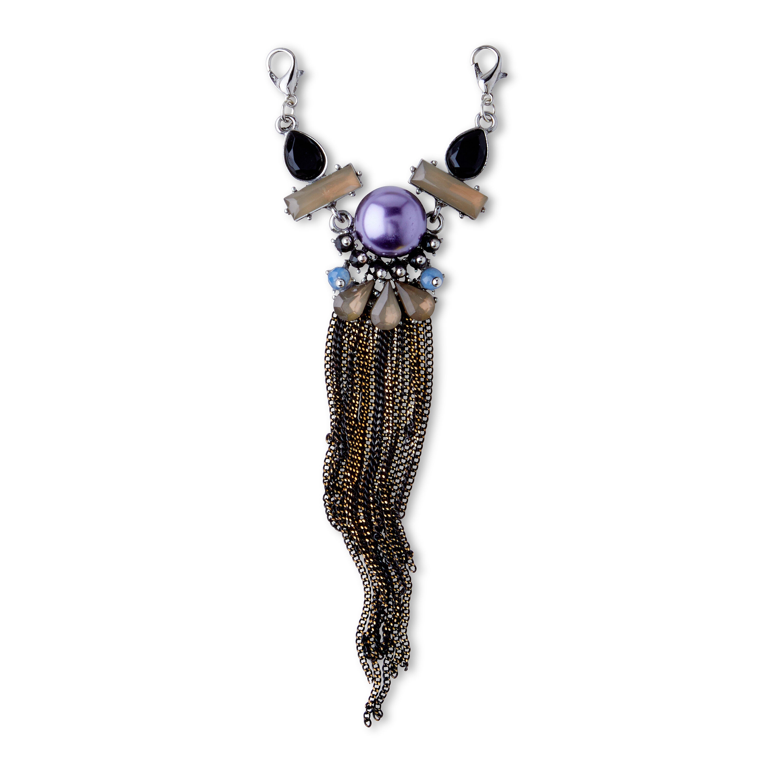 Make trendy jewelry designs by using the hildie & jo Effortless Charm Silver Collar Beaded Chain. The collar consists of stones in black, purple green and white hues in a variety of shapes. For a visually striking look, there are antique gold chains of various lengths that dangle at the bottom. There is a lobster clasp on each end for easy attachment.
