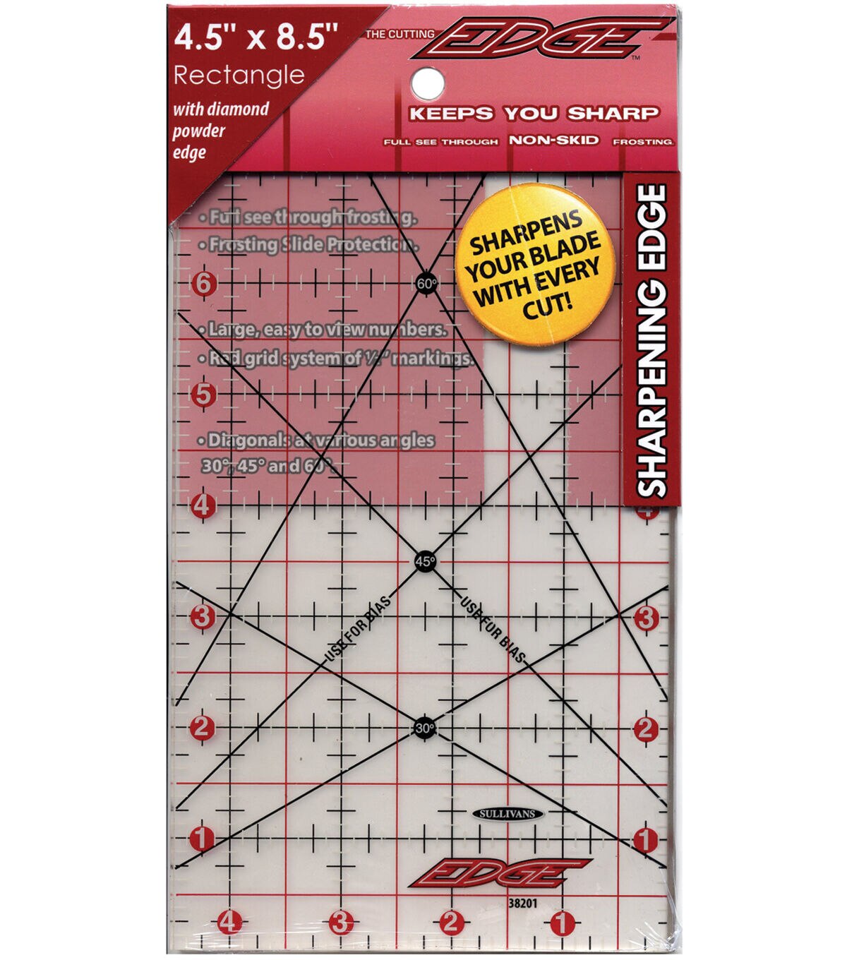 Square up blocks or cut squares on your fabric effortlessly using the Sullivans The Cutting Edge Non-skid Frosted Ruler. This frosted ruler measures 4.5 x 8.5 inches and includes a diamond powder edge that maintains the sharpness of your rotary blade as it spins. The frosted finish of the ruler prevents sliding and makes it light enough to see your fabric through. It is designed with a unique red grid system that highlights the 0.5-inch markings and large number markings for easy visibility. The light marking of 0.12-inch does not distract when using the most common 0.25 markings.