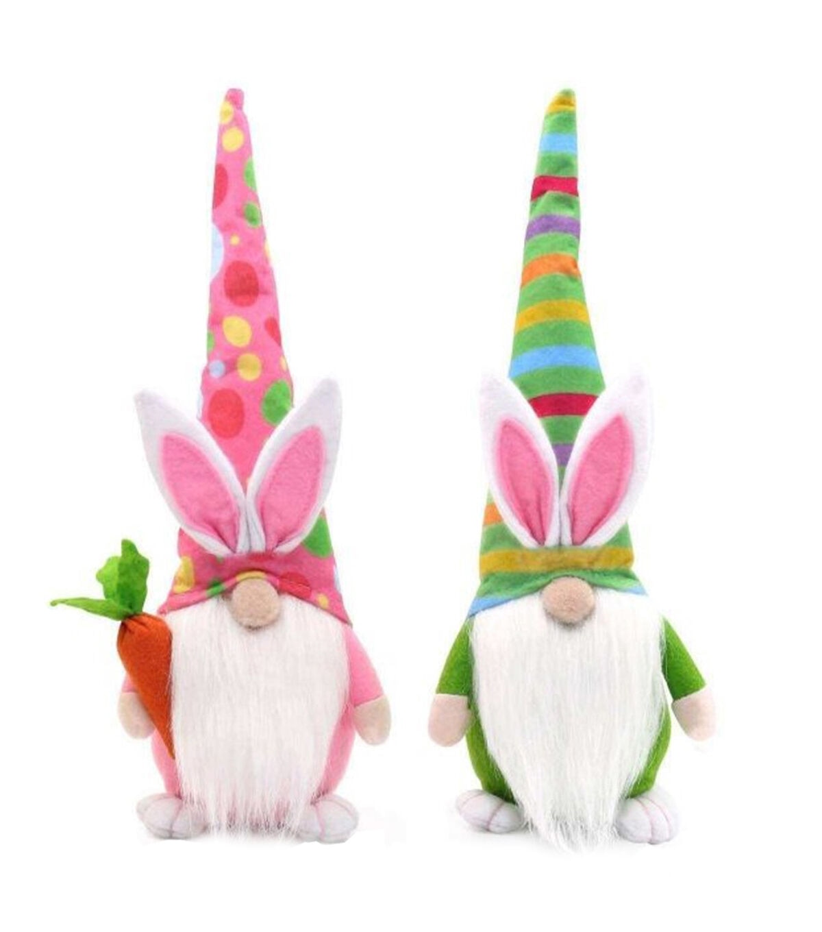 That fuzzy creature with the big ears and whiskers hopping around your yard on Easter Sunday might not be a rabbit. And if you're missing a few colored eggs after your Easter egg hunt, now you know why! These two gnomes, dressed in their holiday best with whimsical polka dotted and striped hats, will sit securely and add a festive touch to any windowsill or end table. Soft and cuddly, this beautiful hand sewn set of two 14" Easter Gnomes will provide many seasons of pleasure.5x5x14