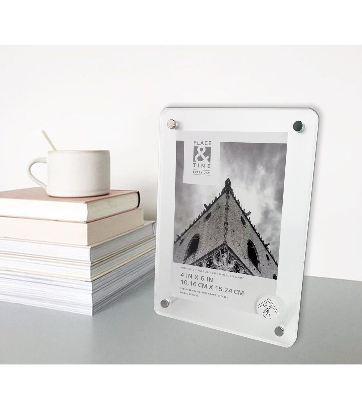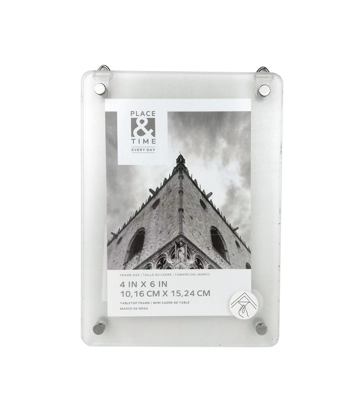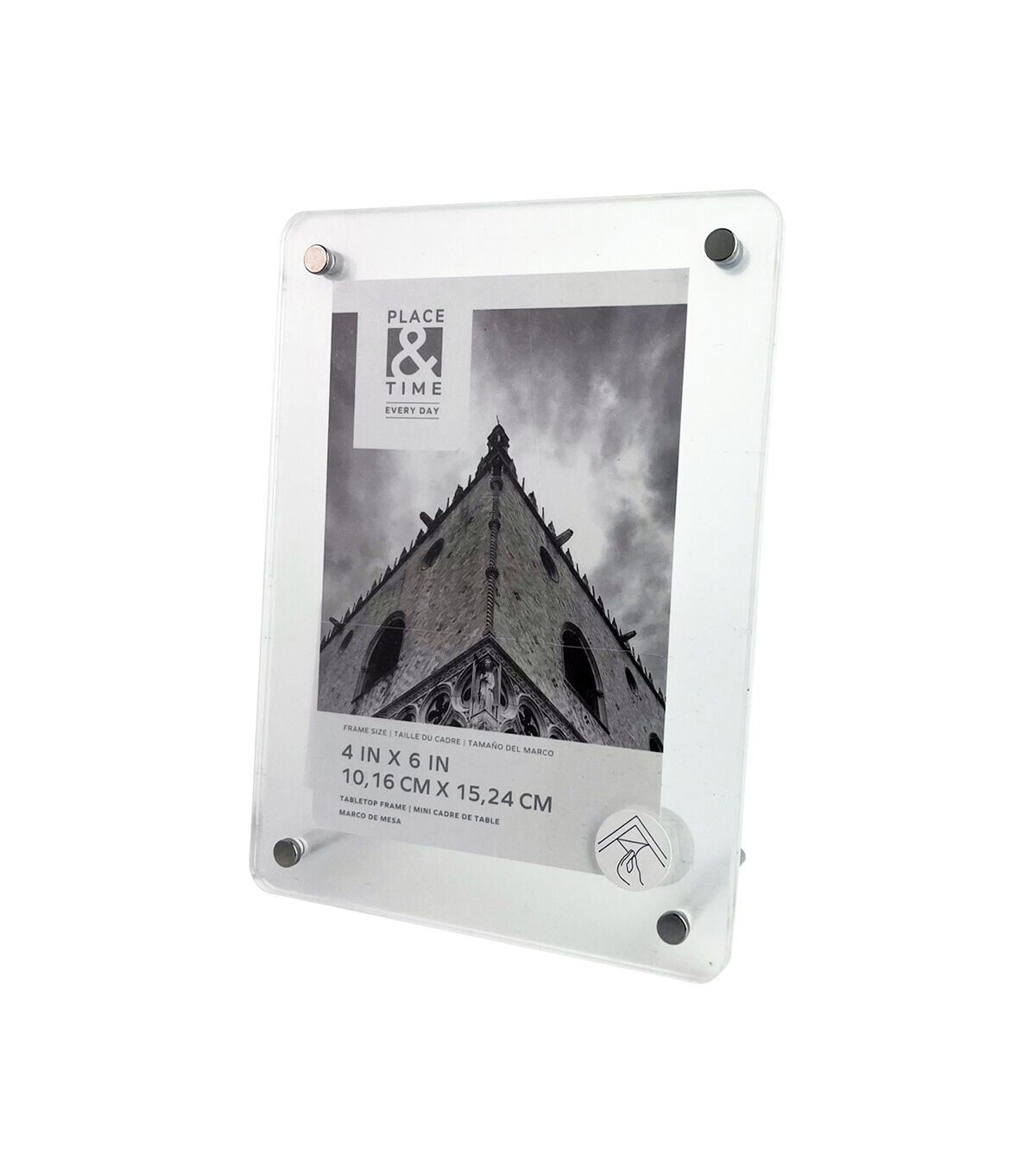Simple in design and elegant, the Clear Acrylic Tabletop Frame With Metal Legs by Place & Time is just what you need to enhance your existing home decor. Insert a cherished moment in this acrylic tabletop frame and showcase it on a ledge in the bedroom or living room. It comes with metal legs on the back for easy display. You can also gift it to someone moving into their new home.