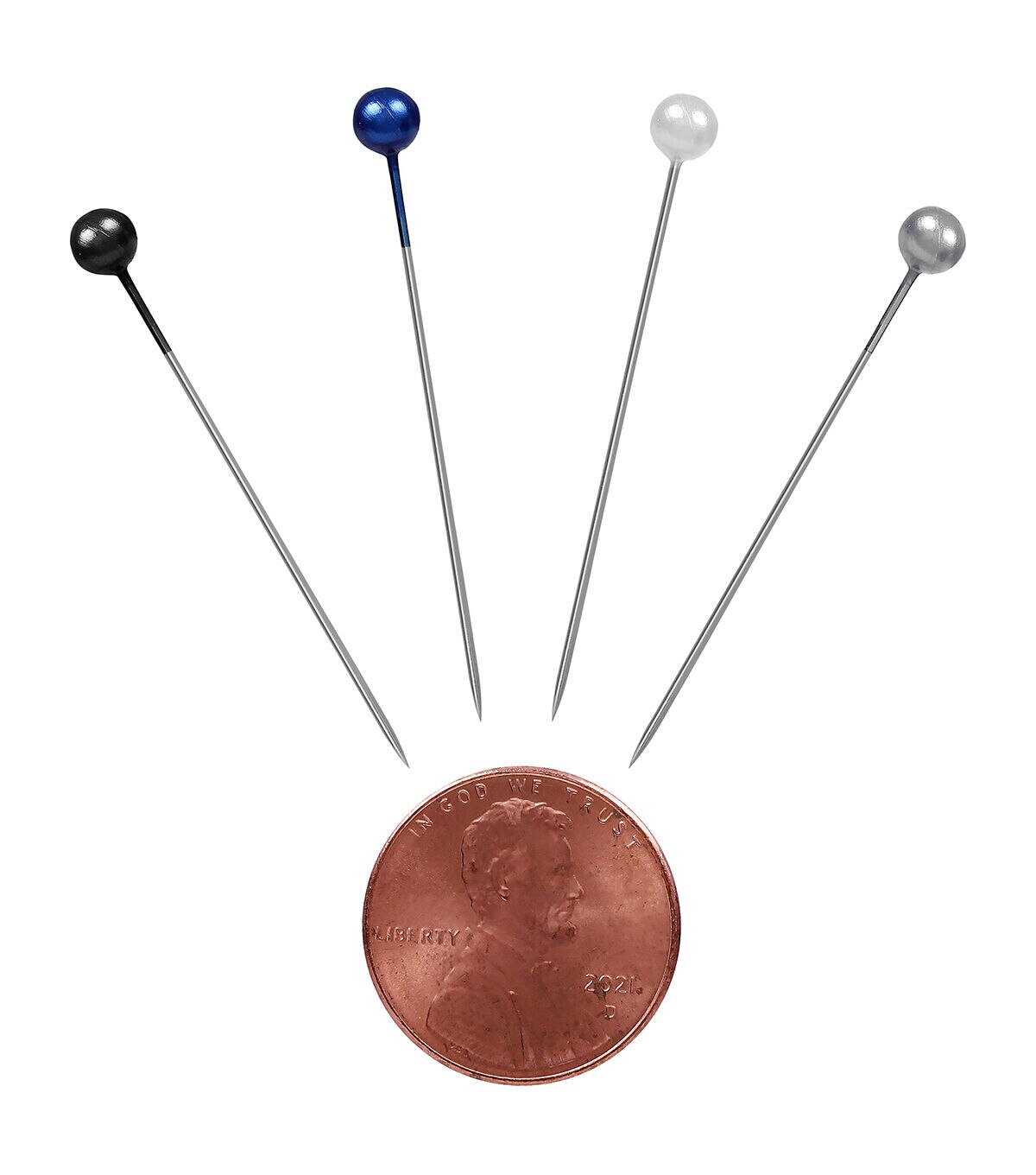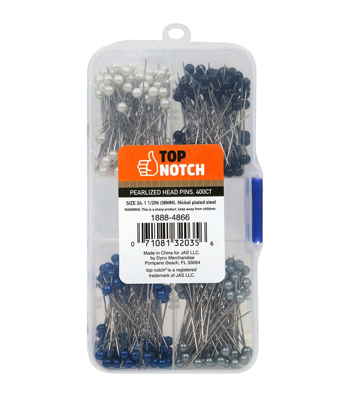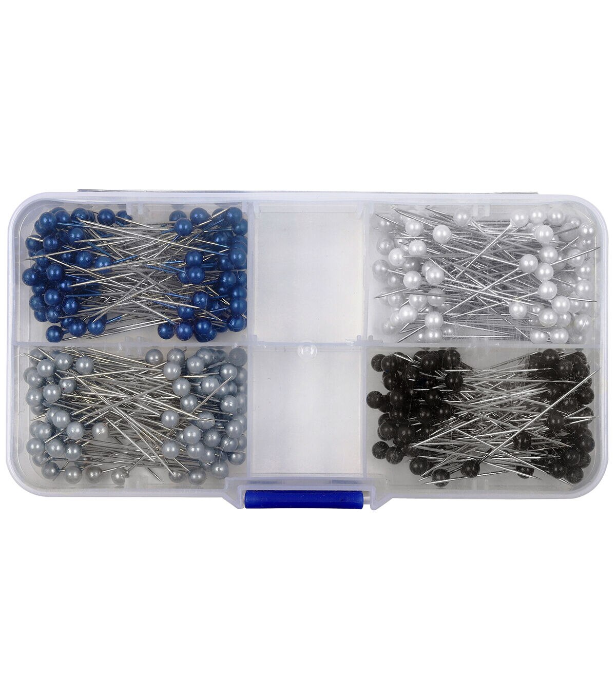 - The Top Notch Pearlized Ball Head Pins in Compartment Storage Case with Assorted Colors is a set of 400 ball headed pins in a handy storage container. Larger than traditional straight pins, these size 24 quilting pins measure 1 1/2” in length and feature a pearlized head in four colors. The set includes 100 each of pearlized navy, black, white and gray, so you’re sure to have a color that’s easy to see against most fabric colors. Crafted from durable nickel-plated steel, these ball head dressmaking pins are very sharp, making them the perfect choice for general sewing and dressmaking. Keep all pins and needles away from children for safety. The shiny, pearlized ball heads on these quilting pins give a shiny and colorful appearance, making them perfect straight pins to add glimmery accents to many crafts and decorative projects. The reusable storage case is made from clear polypropylene plastic and measures 2.5” by 5” and .875” deep. Four compartments help you keep all your pins neat and organized. As functional as it is stylish, this set of fashionable quilting pins is a great addition to any sewing kit.