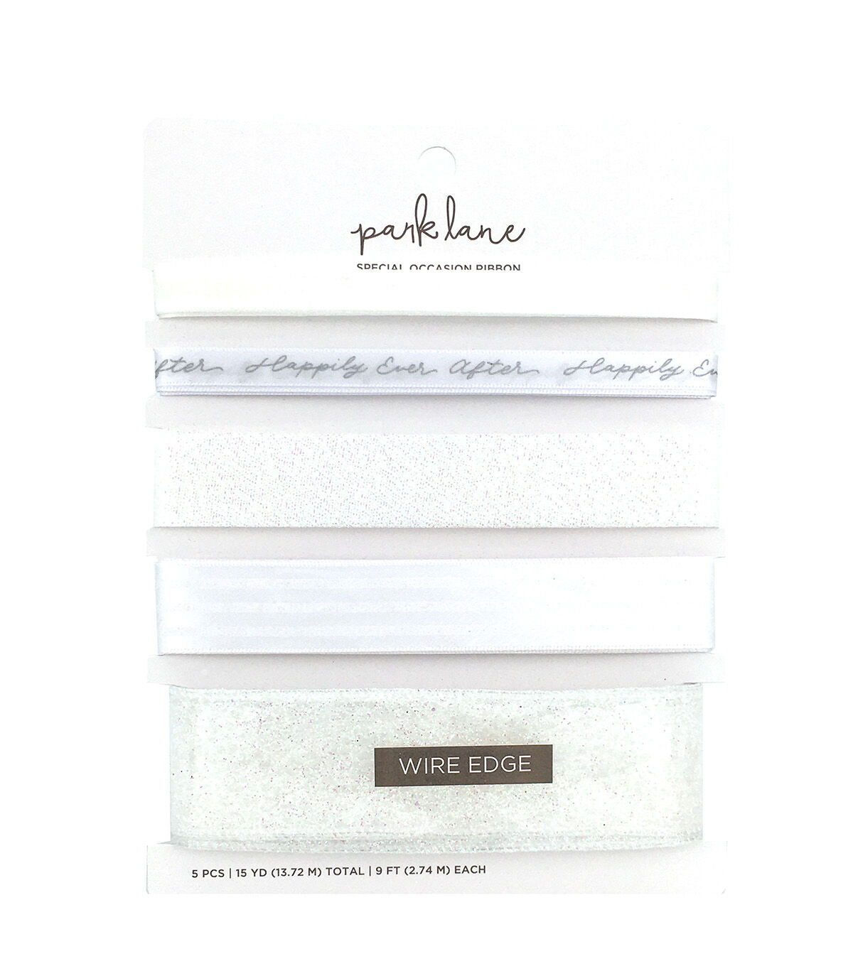 The Park Lane Carded Ribbon will make a welcome addition to your wedding craft or decor supplies. This pack consists of five ribbons sporting different shades of white. Two ribbons sport a glitter finish and one of the ribbons flaunts the phrase ‘Happily Ever After.’ Out of the remaining two ribbons, one is plain and the other displays a striped pattern. You can use them to decorate bouquets, trim dresses or make them part of your wedding decor.