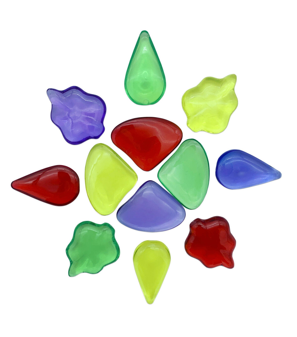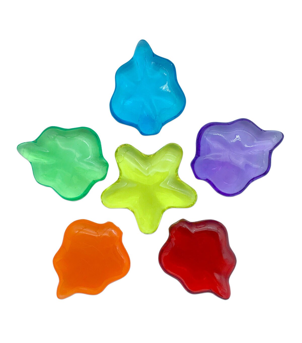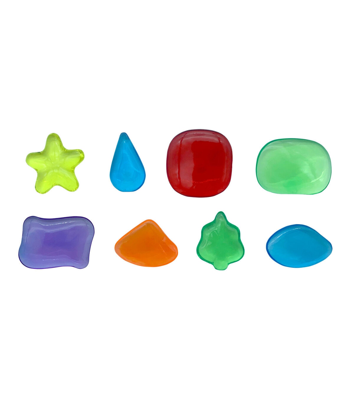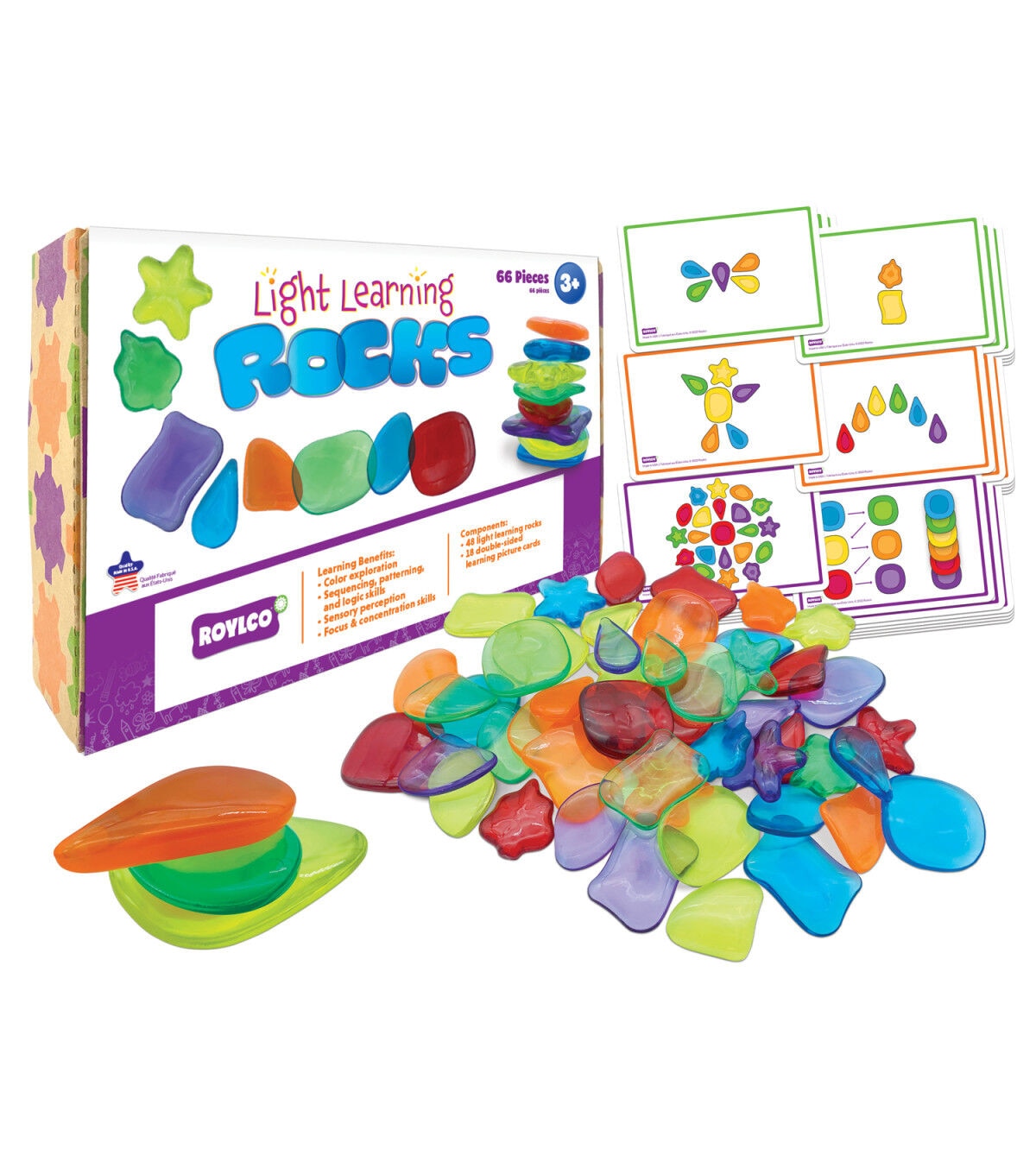 Roylco's Light Learning Rocks collection features 8 different nature-inspired shapes across 6 colors, produced in a durable, transparent plastic to promote color learning & sensory exploration in a beautiful way. These gems have also been designed to function as tools for mindfulness and concentration building as their smooth curved edges and weight can create a calming effect. As an added bonus, the set of 48 rocks includes a card deck of 36 pictures and patterns, sequences and stacking challenges that range in difficulty. Standalone or with a light table, these rocks bring magic into the classroom or home. This product promotes: Color & light learning, STEM logic skills, Fine motor skills, Mindfulness, and Basic sequencing. This set features: 48 light learning rocks (8 different shapes in 6 different colors up to 2 x 2" (5 x 5 cm)), 18 easy, medium, and difficult combination cards, and a storage box. For ages 4+.