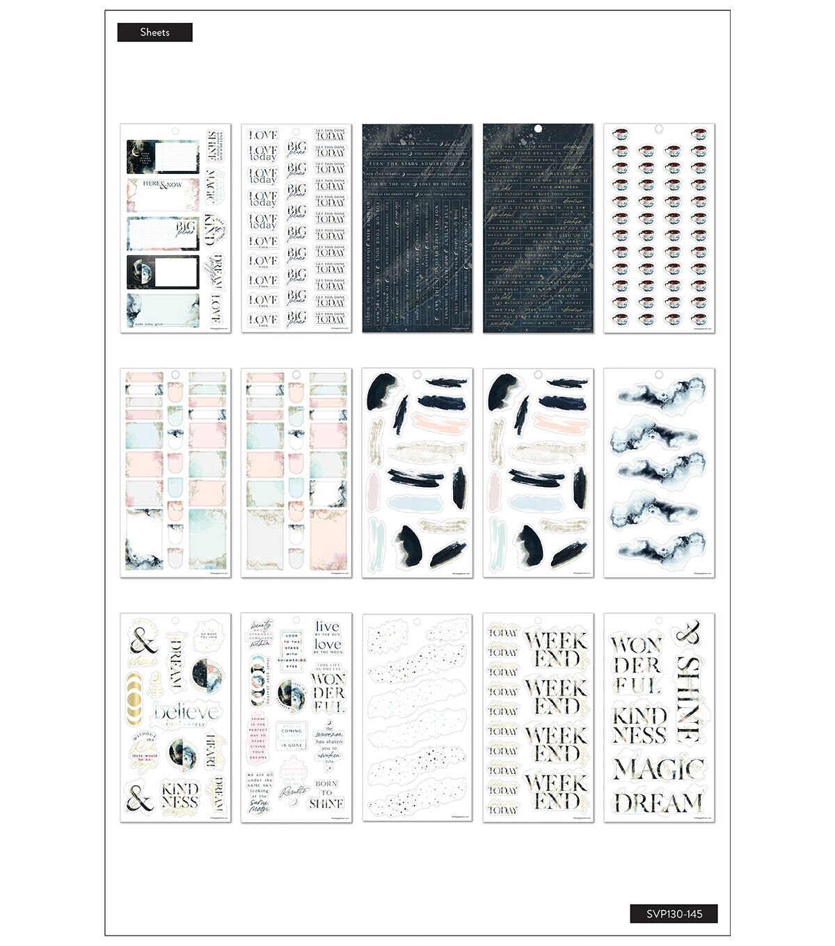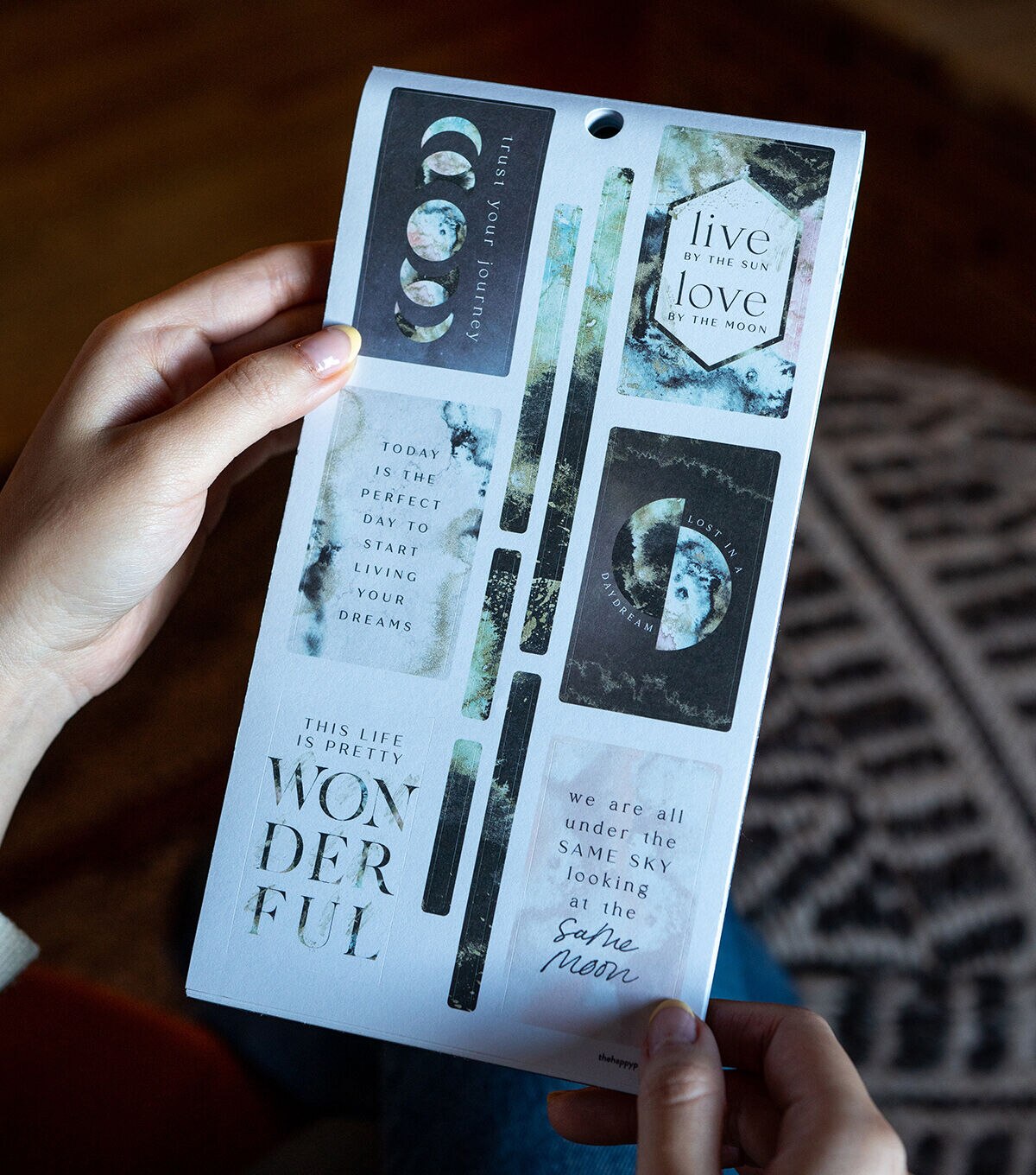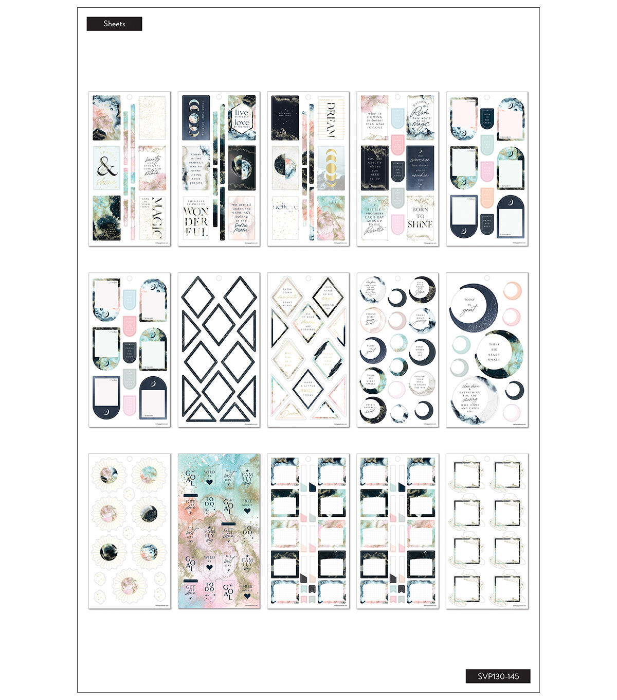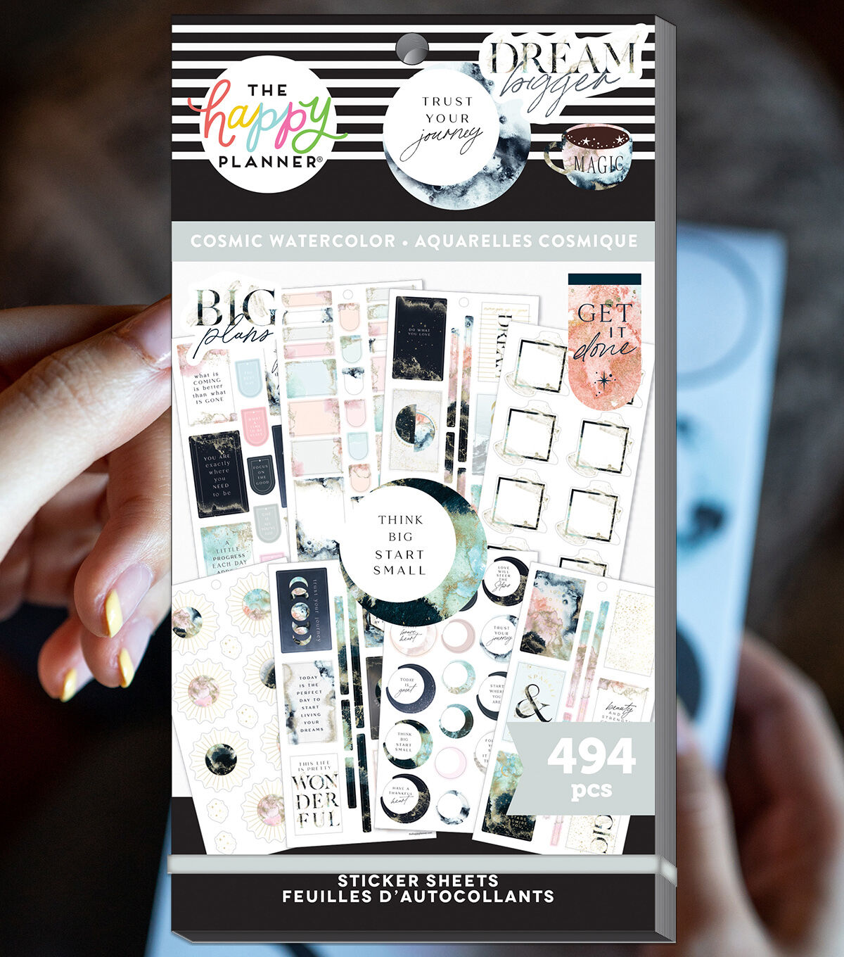 Dream it, do it. This Value Pack Sticker Book has 30 sheets with 494 stickers. This celestial sticker book includes cosmic watercolor designs, transparent stickers, phases of the moon, and productivity stickers.