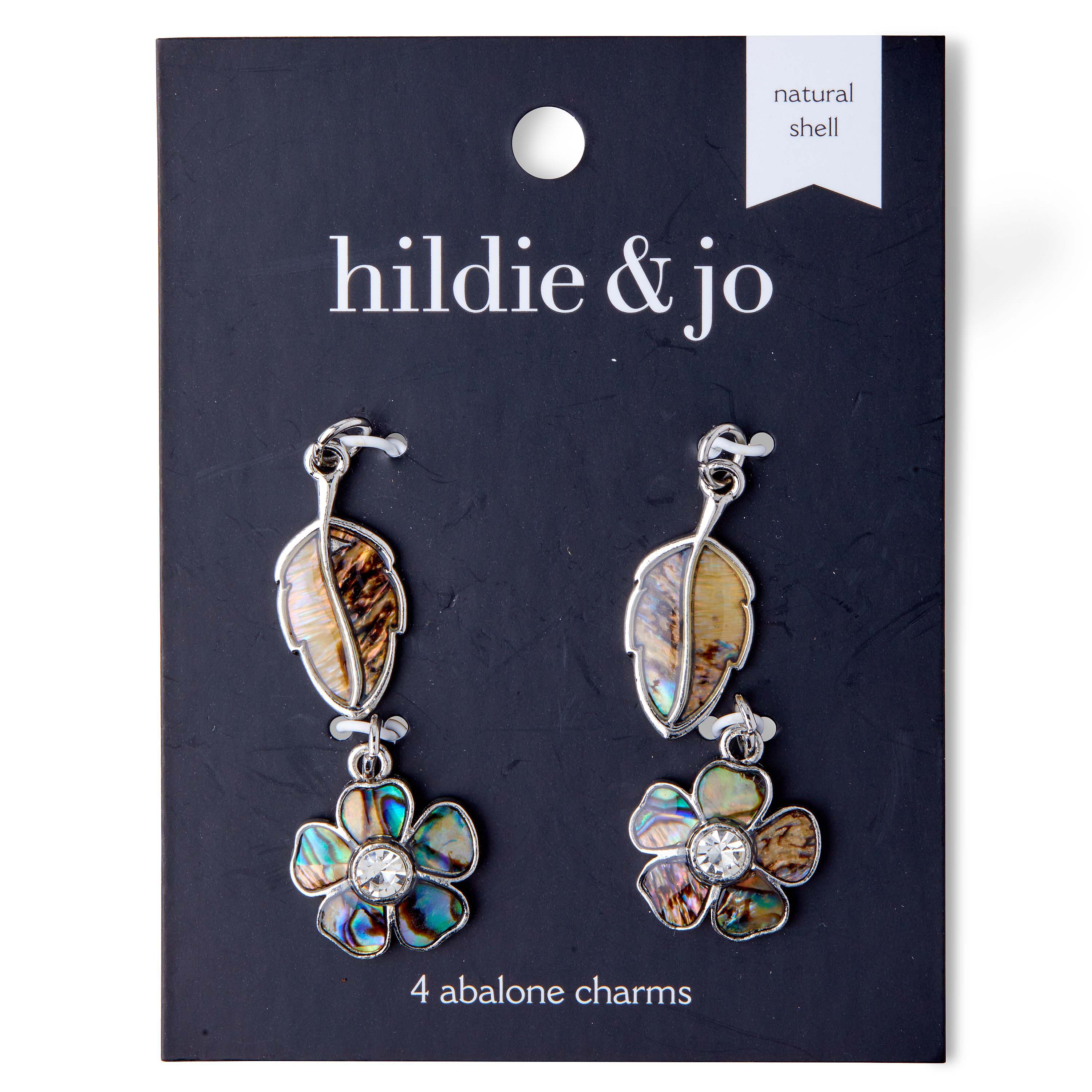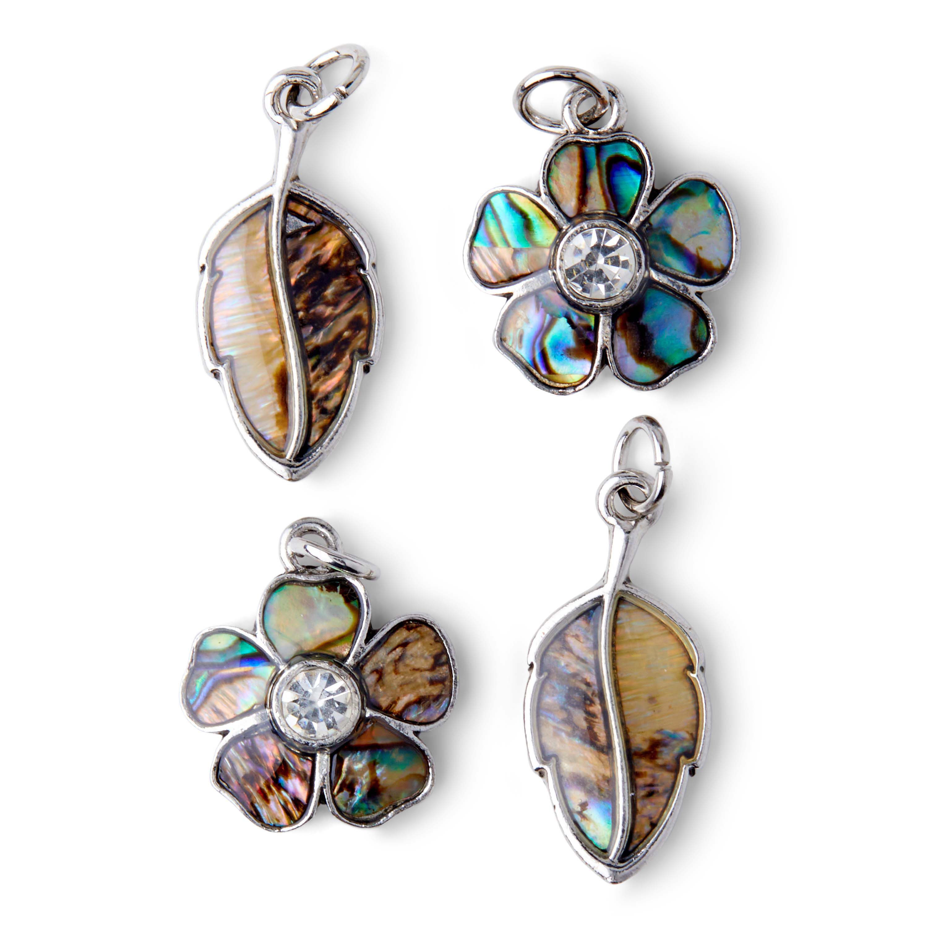 Create unique jewelry designs with the hildie & jo Abalone Leaf & Flower Charms. This pack comes with four charms, two of them are shaped like flowers and the other two like leaves. All the charms come inlaid with abalone shells making them unique and eye-catching. You can use them to create earrings and neckpieces.