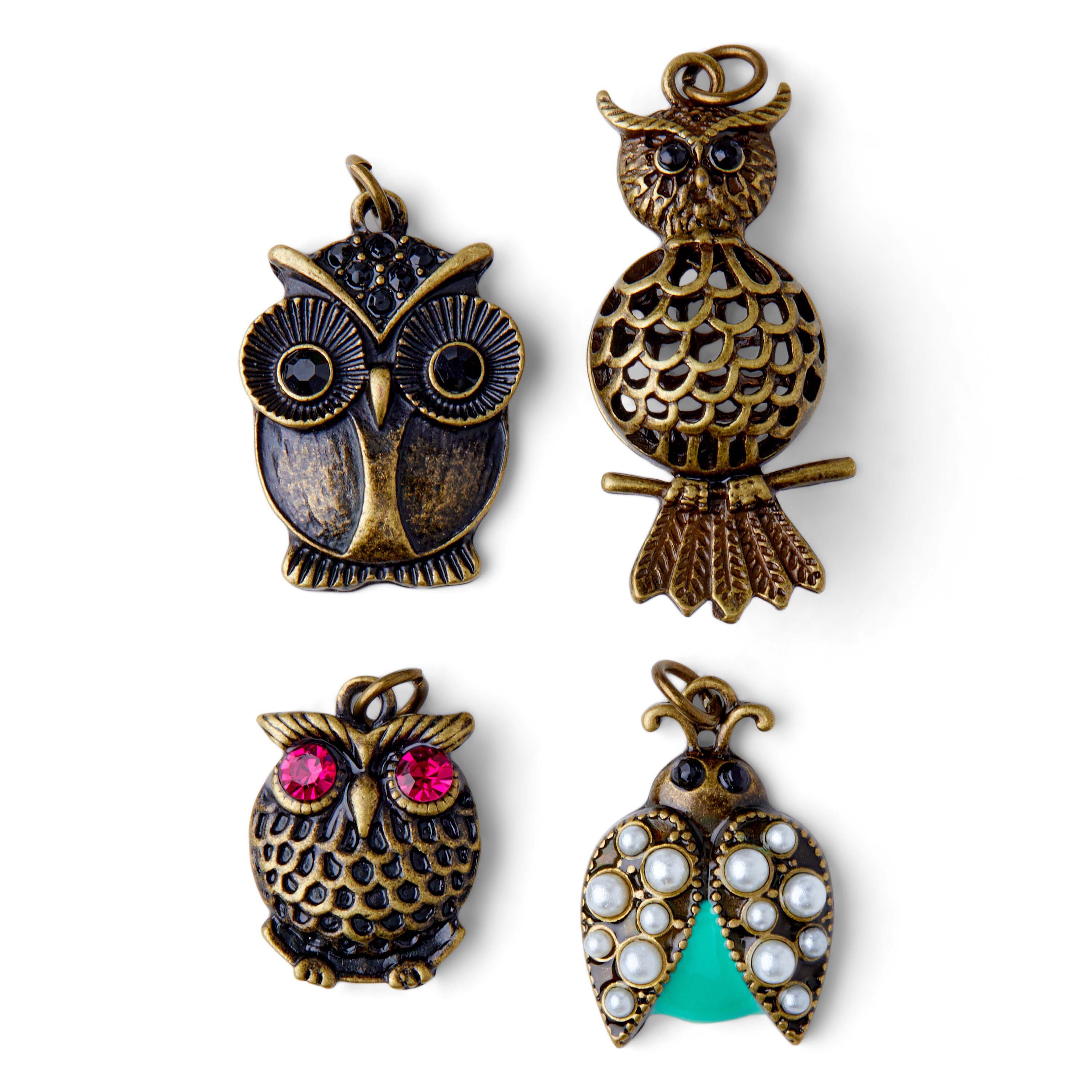 Customize your jewelry projects with these adorable hildie & jo Owl & Bug Antique Gold Charms-Pearls. This pack consists of a bug and three owl charms made of zinc alloy, glass, acrylic and enamel. Designed in antique gold, each charm features a distinct pattern that'll enliven your DIY craft and jewelry-making projects. You can attach them to your necklaces, bracelets, key chains and more with the attached jump ring.