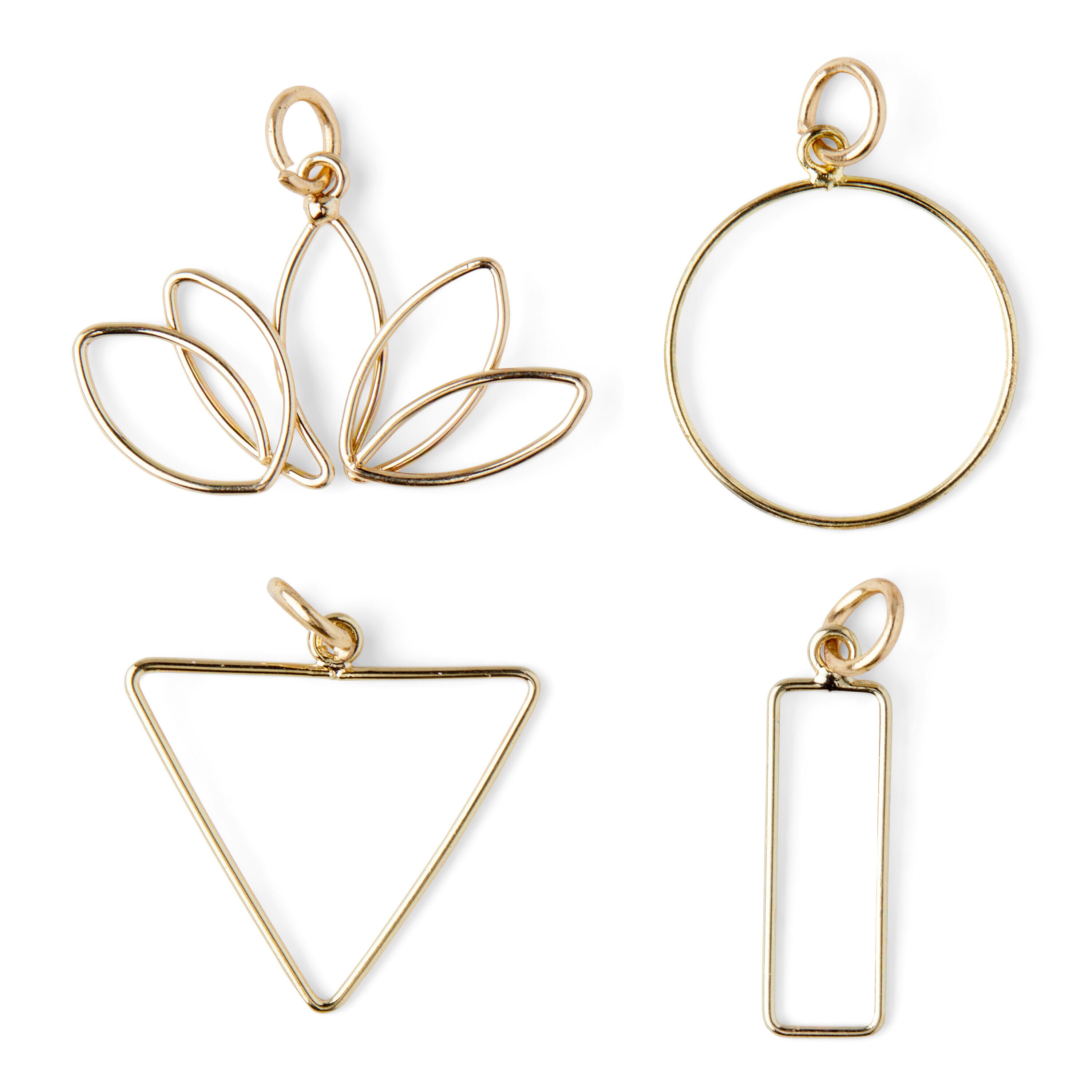 Add a personalized touch to your DIY jewelry and craft projects with these hildie & jo Iron Charms-Gold. This pack includes four unique charms in smooth gold. There is an open circle, an open triangle, an open lotus flower and an open rectangle. Add these to bracelets, necklaces, keychains and more.
