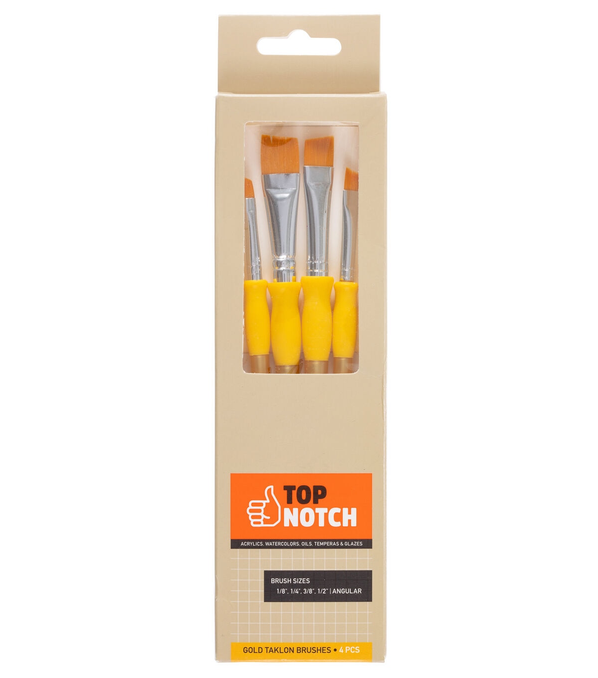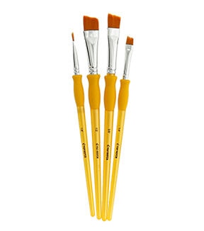 The Gold Taklon Angular Brushes by Top Notch will make a great addition to your art supplies. This set includes four angular brushes designed with gold Taklon bristles. They can be used with watercolor, tempera, oil and acrylic paint as well as glazes. Use them for filling color in small areas and corners of painting surfaces.