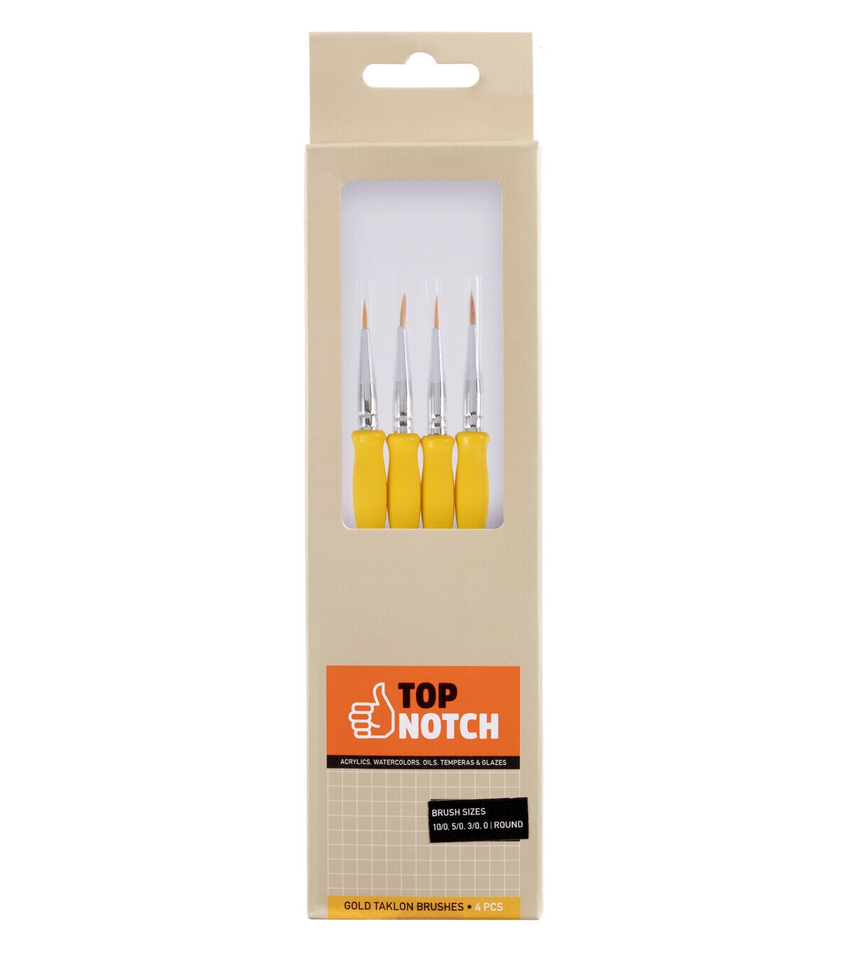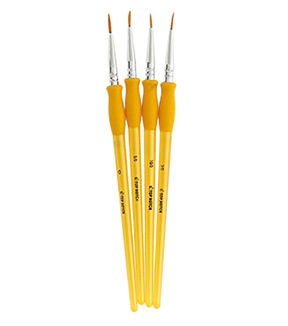 You will love to paint with the Gold Taklon Detail Round Brushes by Top Notch. These four round brushes come in different sizes and are designed with gold-toned Taklon bristles. They can be used for painting with watercolors, acrylics, oil paints, glazes and tempera. Add outlines, fine details and more using them.