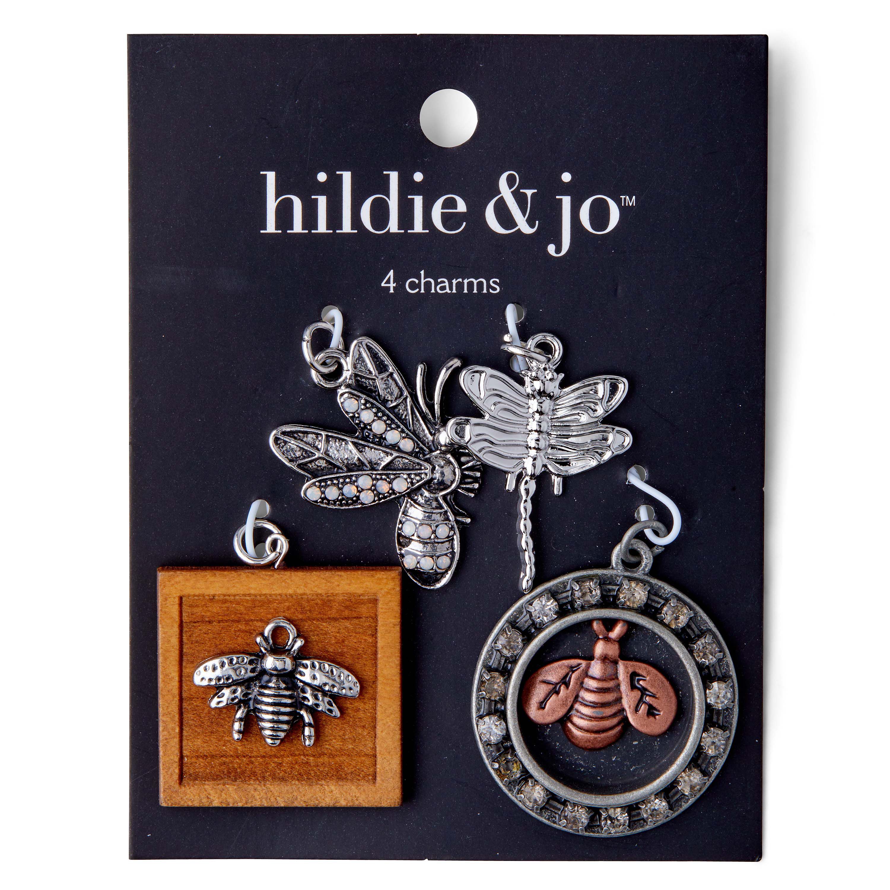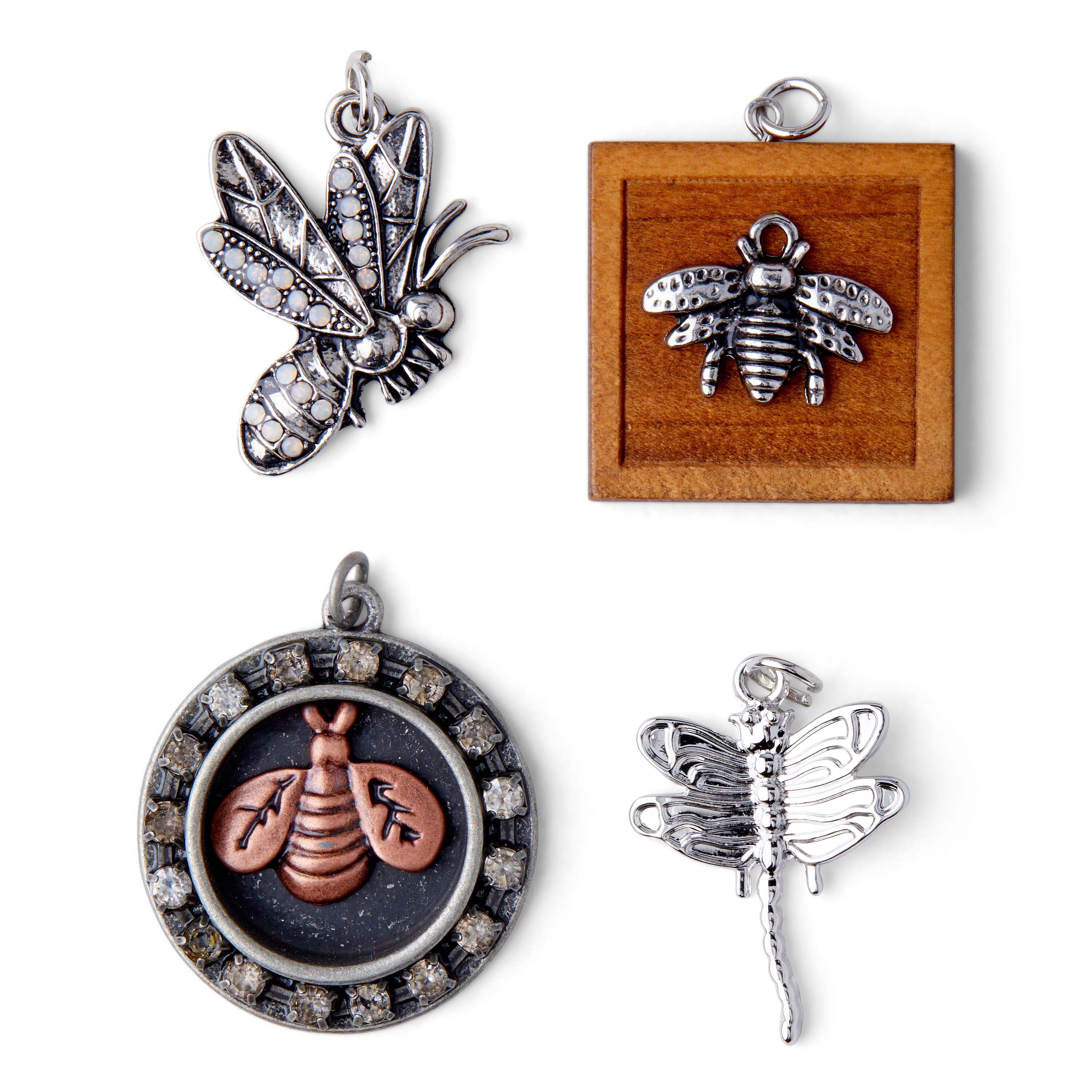 Create a unique piece of custom jewelry by using these hildie & jo Bugs Silver Charms. Designed in silver, each charm is unique. There is a silver butterfly with round, white stone detailing, a silver dragonfly with wing detailing, a silver bee on a wooden background, and a circular charm with a bronze bee in the center. Add these charms to bracelets, necklaces, key chains and more.