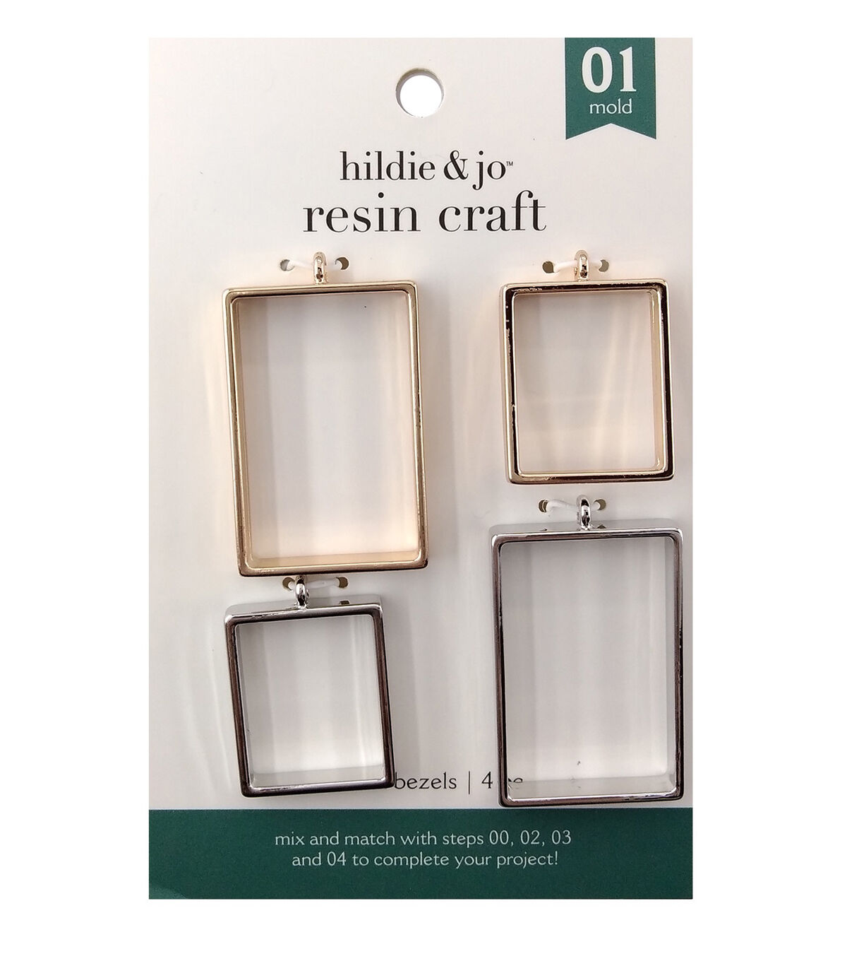 Start your resin craft using these classic metal bezels. There are four bezels in all two in silver and two in gold. Each is the shape of a rectangle, one is small and one is large. They have an open back and rim around the edges. Each has a hanger loop at the top. Use these to customize your resin craft. Resin crafts have four easy steps: select mold, pour resin, customize, cure. Create your own unique piece!