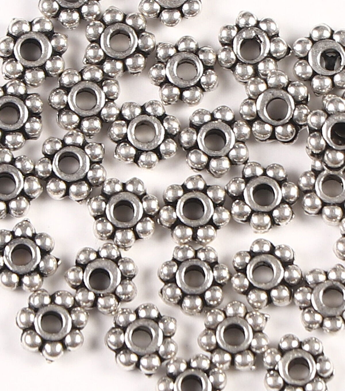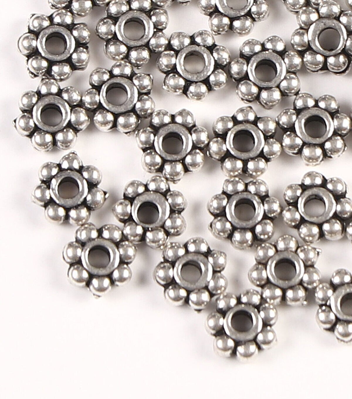 The hildie & jo Cast Metal Flower Spacer Beads - Antique Silver will make your handmade jewelry pieces stand out. This pack contains 31 cast metal spacer beads that are shaped like small flowers. Pair them with colorful glass and metal beads, cords and chains to design necklaces, danglers, anklets and more.