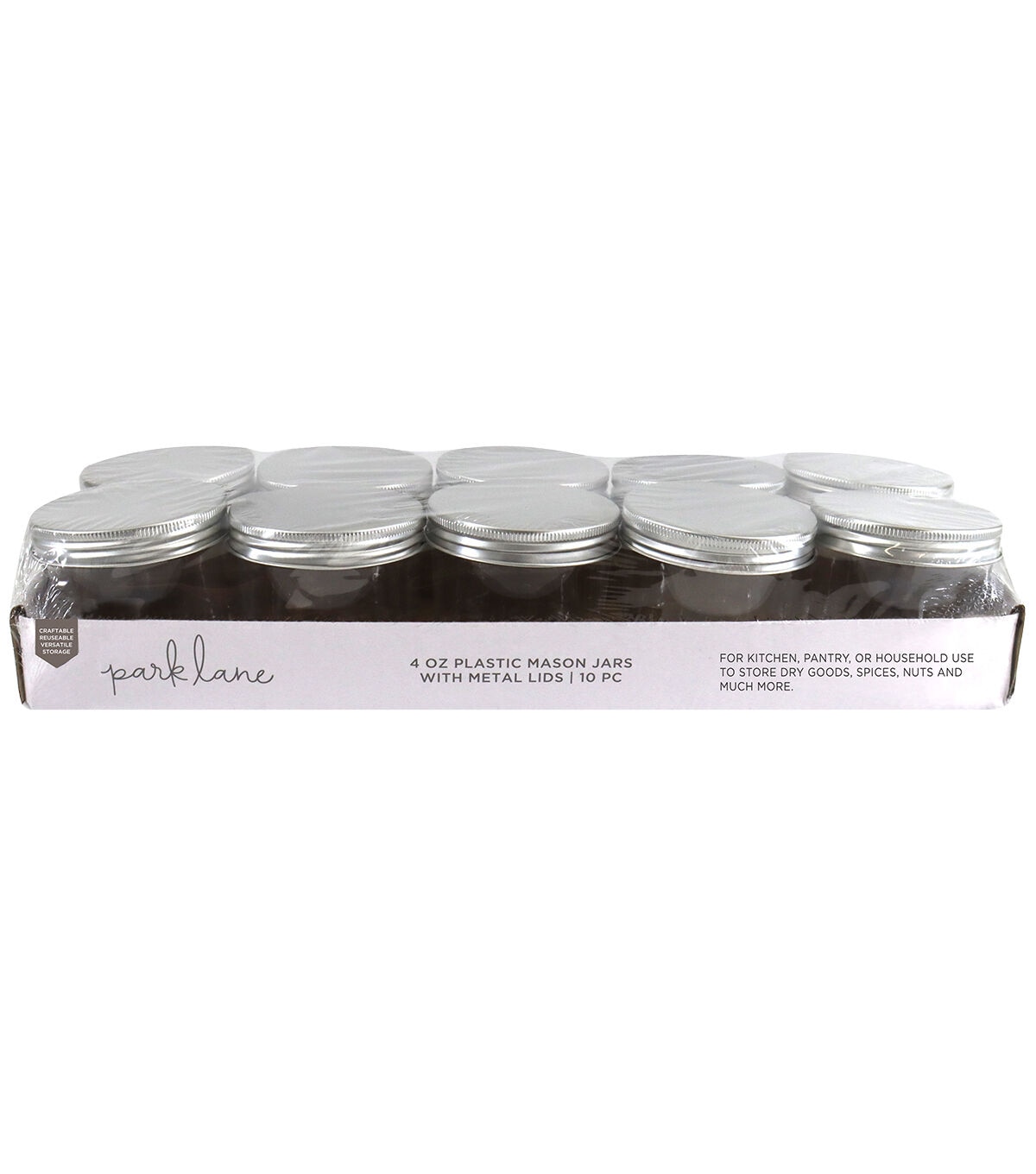 Get inspired and convert the simple Park Lane Plastic Mason Jars with Metal Lids into a unique creative project. This pack includes 10 mason jars. Paint them, wrap them with ribbon or fabric, or cover them with glitter. You can also use them for packing homemade gifts. They are perfect for storing wrapped candies, chocolates and more.