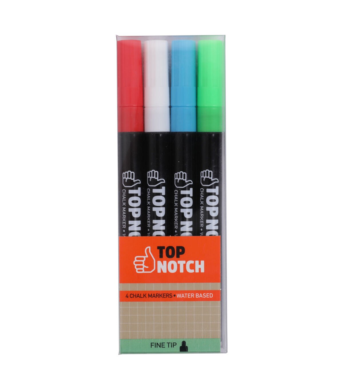 The Top Notch Fine Tip Chalk Markers - Primary are a must-have in your craft supplies. These chalk markers in green, blue, white and red are designed with a fine tip and are perfect for adding your creative streaks to glass, metal and wood surfaces besides chalkboards. You can use them to create personalized chalkboard signs or draw intricate designs on mason jars, wine bottles and more.
