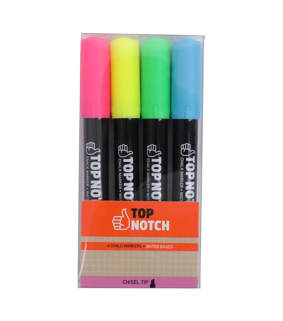 Add colors to your artwork using the Top Notch Chisel Tip Chalk Markers - Neon. This pack comes with four chalk markers designed with chisel tips and in neon pink, yellow, green and blue shades. The water-based ink is non toxic. You can use these markers to create unique signs and labels. They will also come in handy to decorate gift boxes and bags.