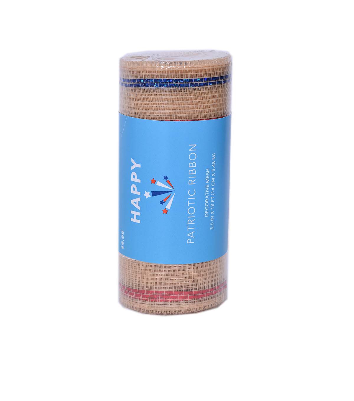 Add a touch of patriotism to your home decor projects with Happy Patriotic 5.5" x 18' Natural Red Striped Metallic Decorative Mesh. This versatile ribbon is perfect for gift baskets, bows, wreaths, and wrapping presents. Its unique design and metallic finish will make your decorations stand out on any occasion.