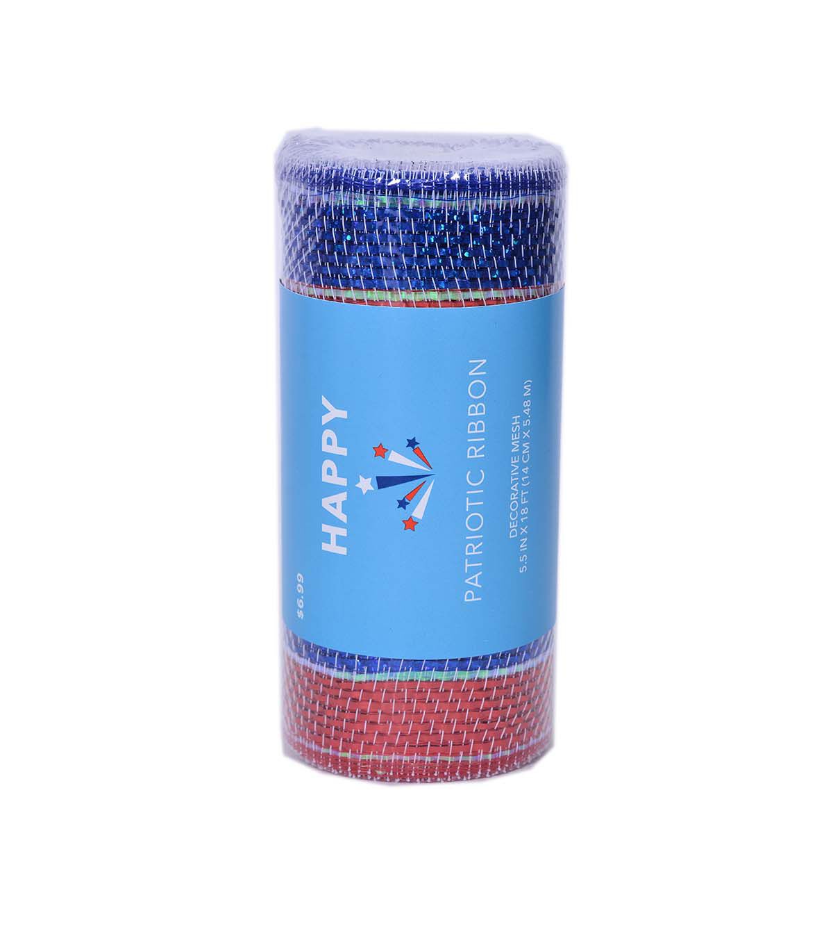Elevate your crafting game with Happy's Patriotic 5.5" x 18' Red & Blue Metallic Decorative Mesh. This versatile ribbon can be used for gift baskets, bows, wreaths, and wrapping presents to make them truly unique and patriotic. The vibrant red and blue colors will add a pop of color to any project, making it perfect for 4th of July, Memorial Day, or any other patriotic occasion.