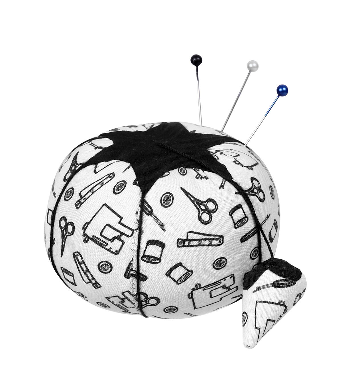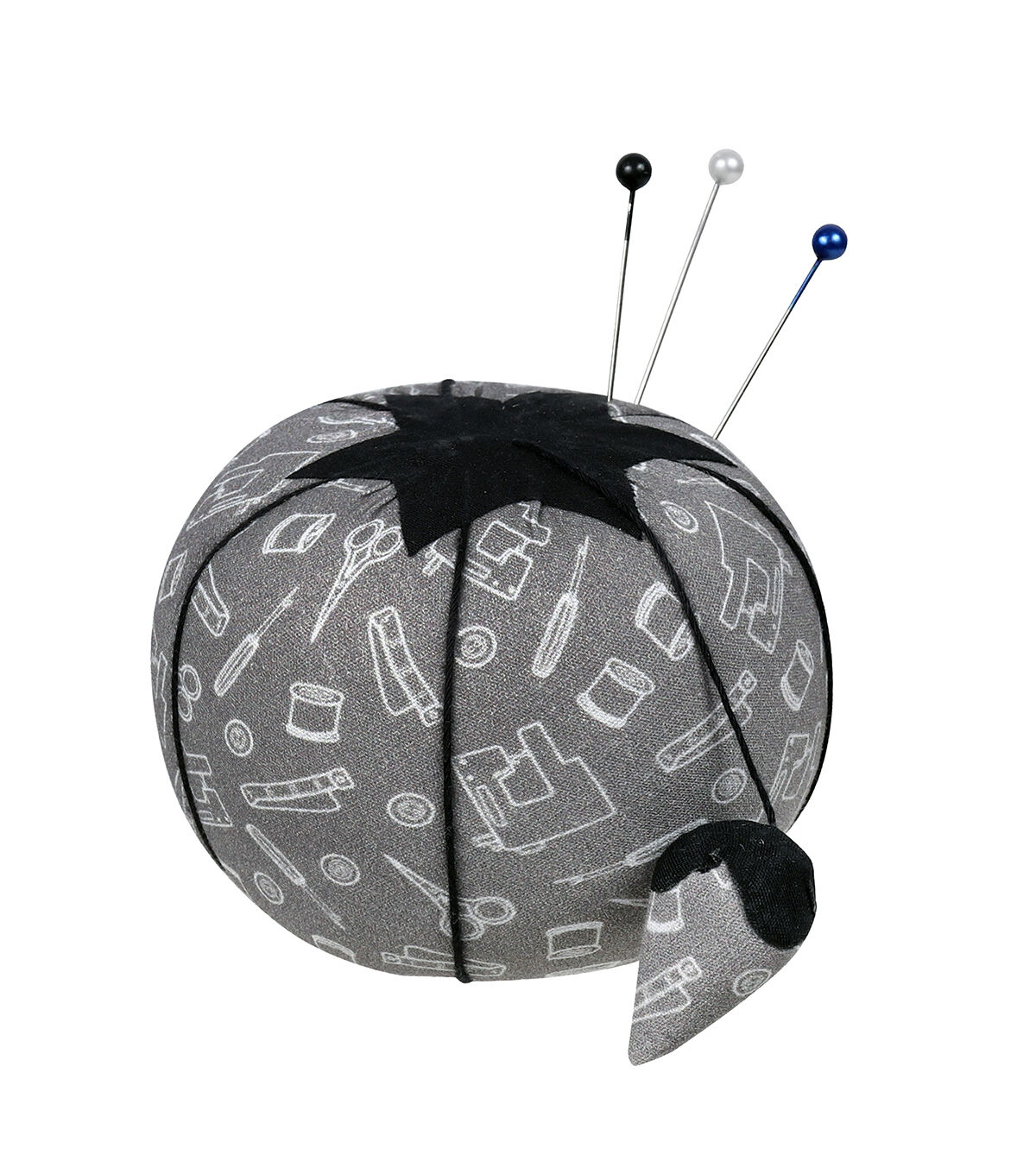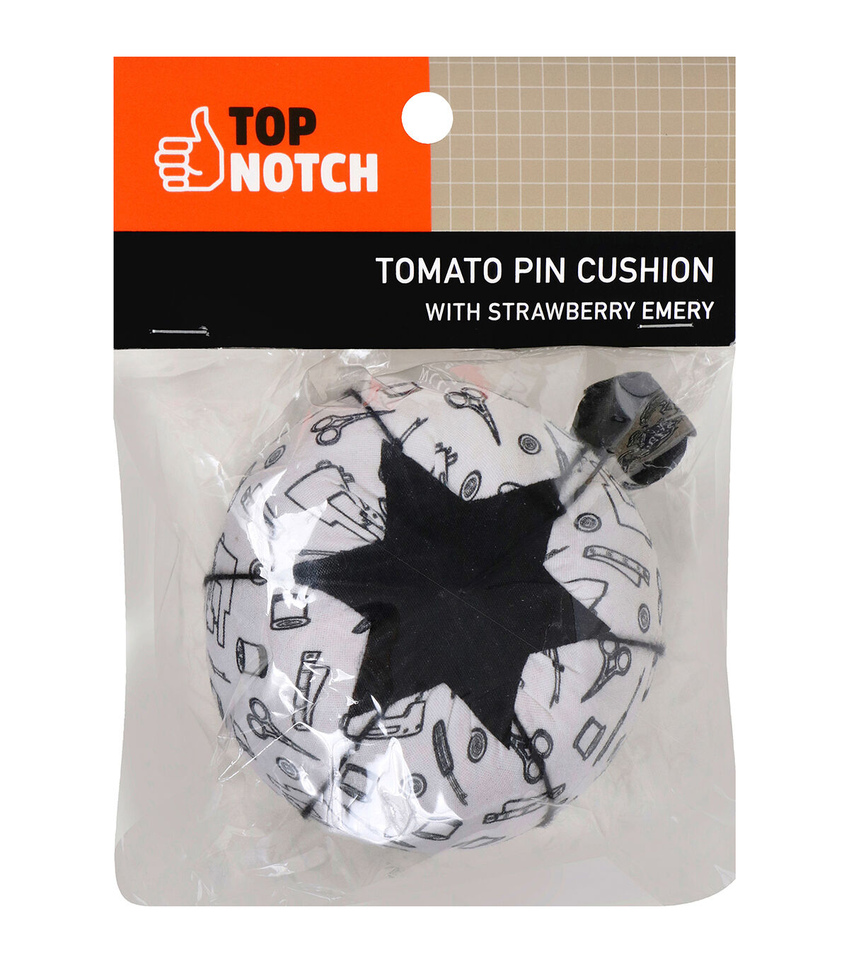 The Top Notch Fashion Tomato Pin Cushion in Gray is a functional and attractive tool to help you store, maintain, and transport your sewing pins and needles. Shaped like a traditional tomato pin cushion with an attached strawberry emery, this attractive pin cushion gives a stylish twist to the well-known sewing accessory. Both the pin cushion and emery are covered in a fun print fabric that features tiny white sewing accessories such as scissors, buttons, and spools on a gray background. Black thread accents, black fabric leaves, and a black tether string to hold the tomato and strawberry together complete the look. Use the larger pin cushion to store needles and pins when not in use or to safely carry multiple pins and keep them within easy reach when hemming garments or dressmaking. Use the smaller emery to clean and sharpen pins and needles so they stay well maintained for years to come. These unique and functional sewing accessories make a great addition to any collection of sewing supplies.