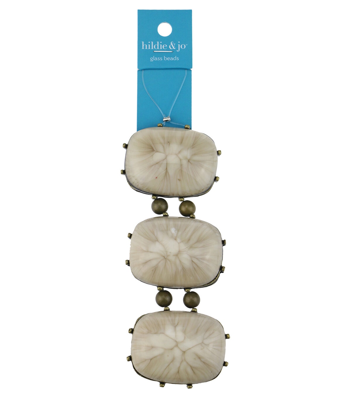 Explore your creativity by designing fashion accessories using the hildie & jo Rectangular Glass Bead Strand - Ivory & Antique Gold. This strand sports large rectangular stones with rounded edges in an antique gold tone. The ivory stones flaunt a marbled finish in brown. Each of the beads is surrounded by an antique gold tone with a dot pattern on the edges. Use them to design anything from a choker and bracelet to craft projects and more.