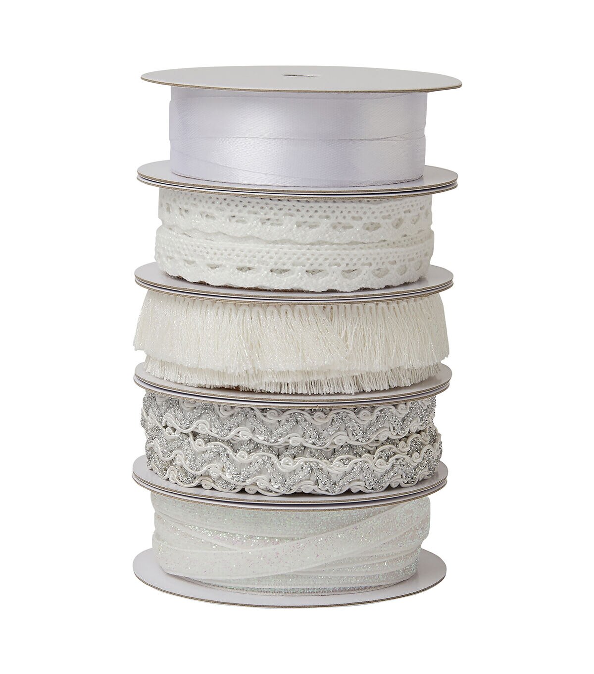 • POLYESTER AND METALLIC WHITE, OFF WHITE AND SILVER METALLIC ASSORTED TRIMS