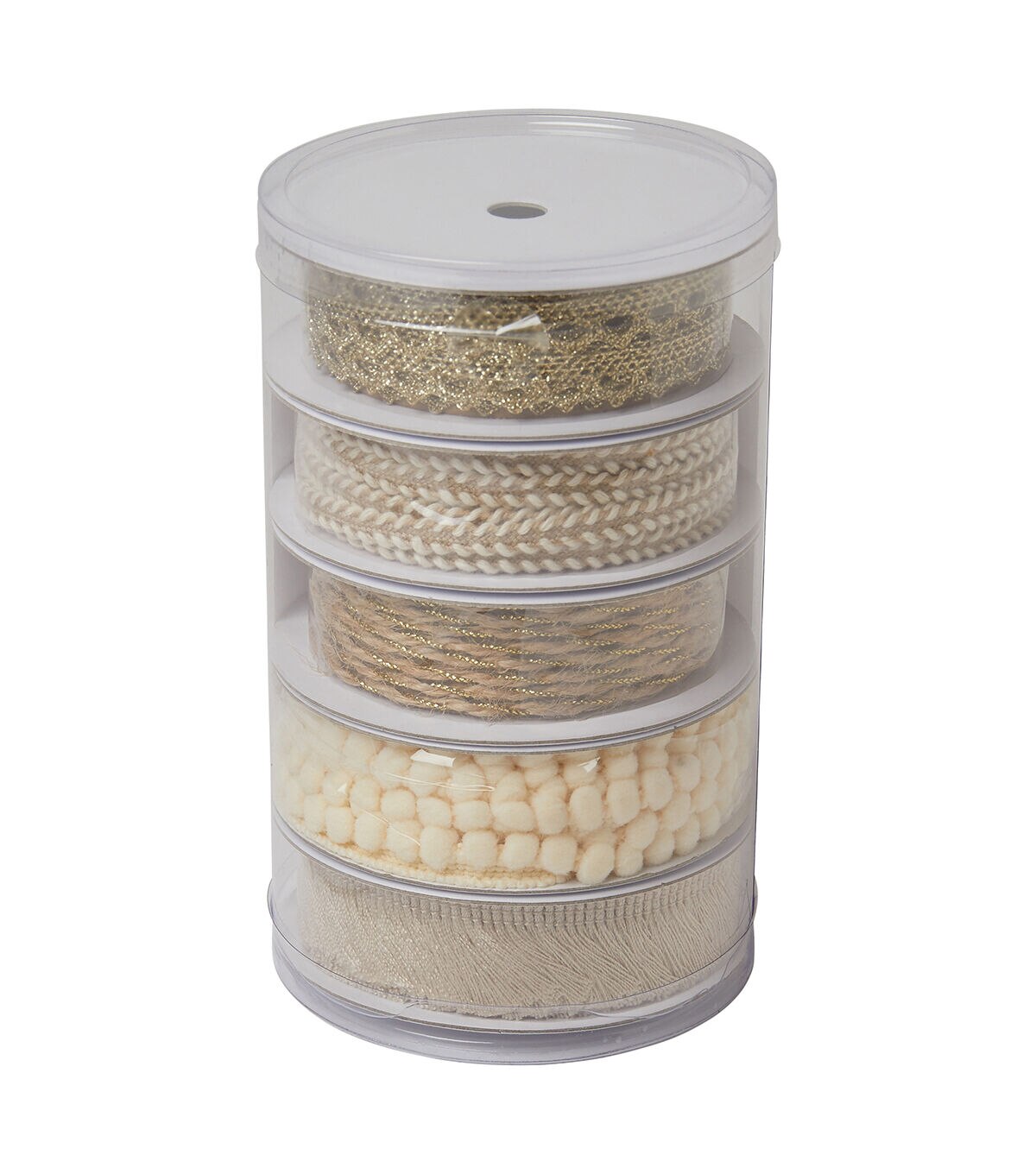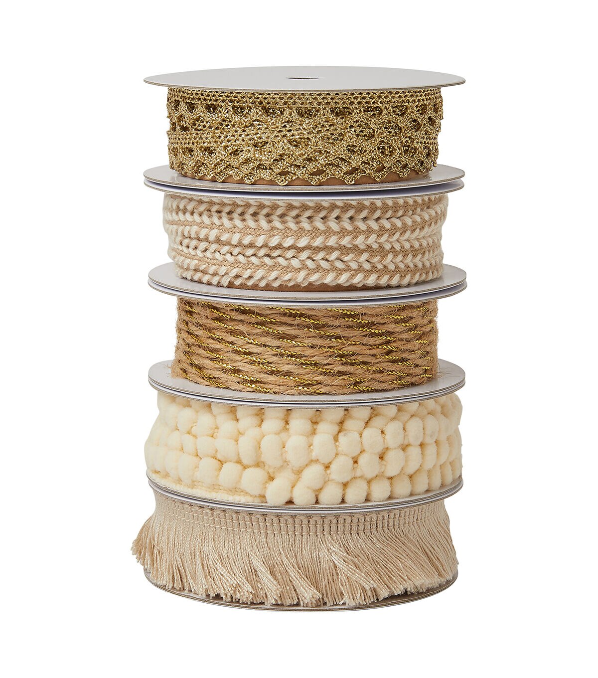 • POLYESTER AND METALLIC NATURAL JUTE, CREAM AND GOLD METALLIC COLORED ASSORTED TRIMS