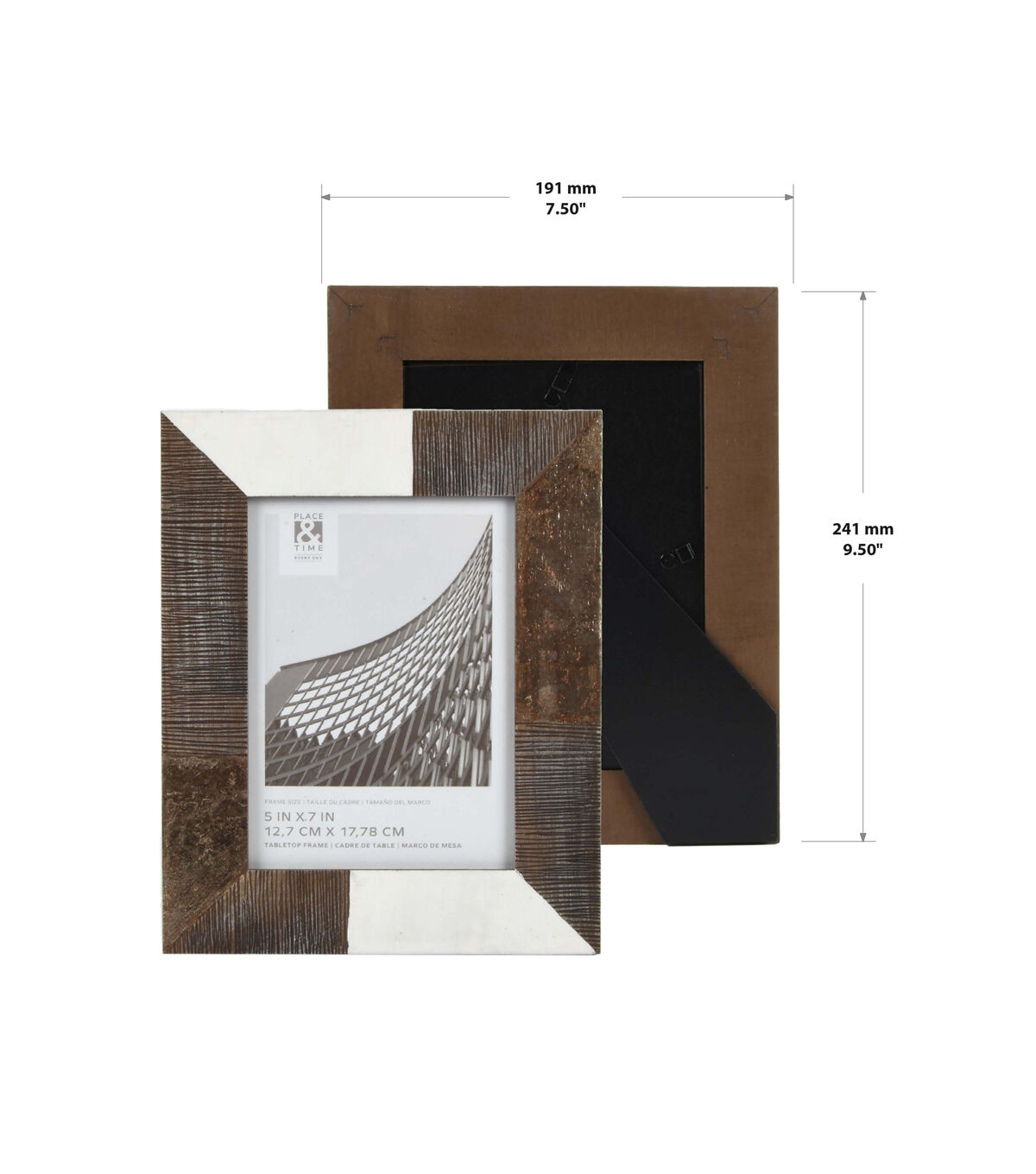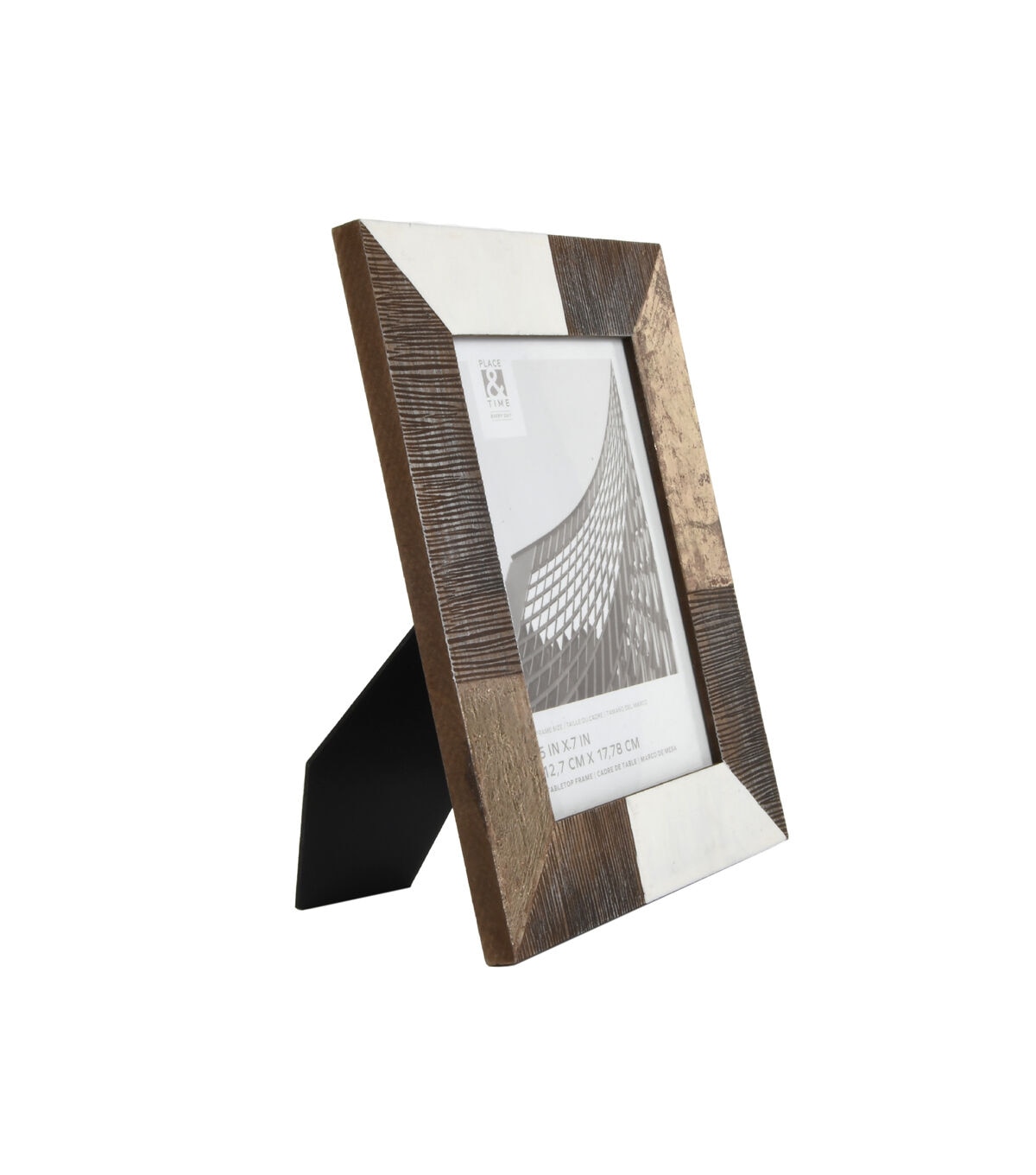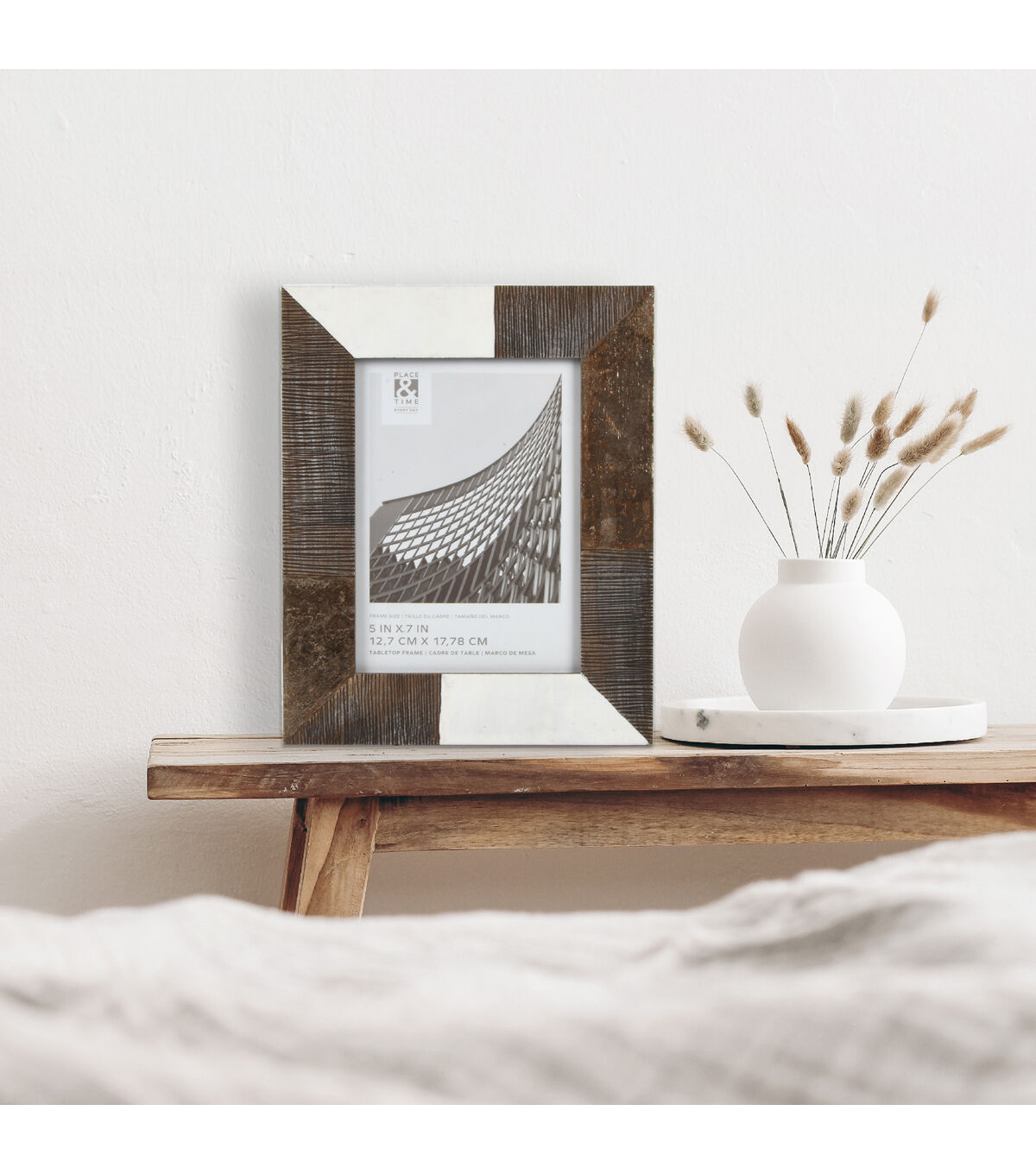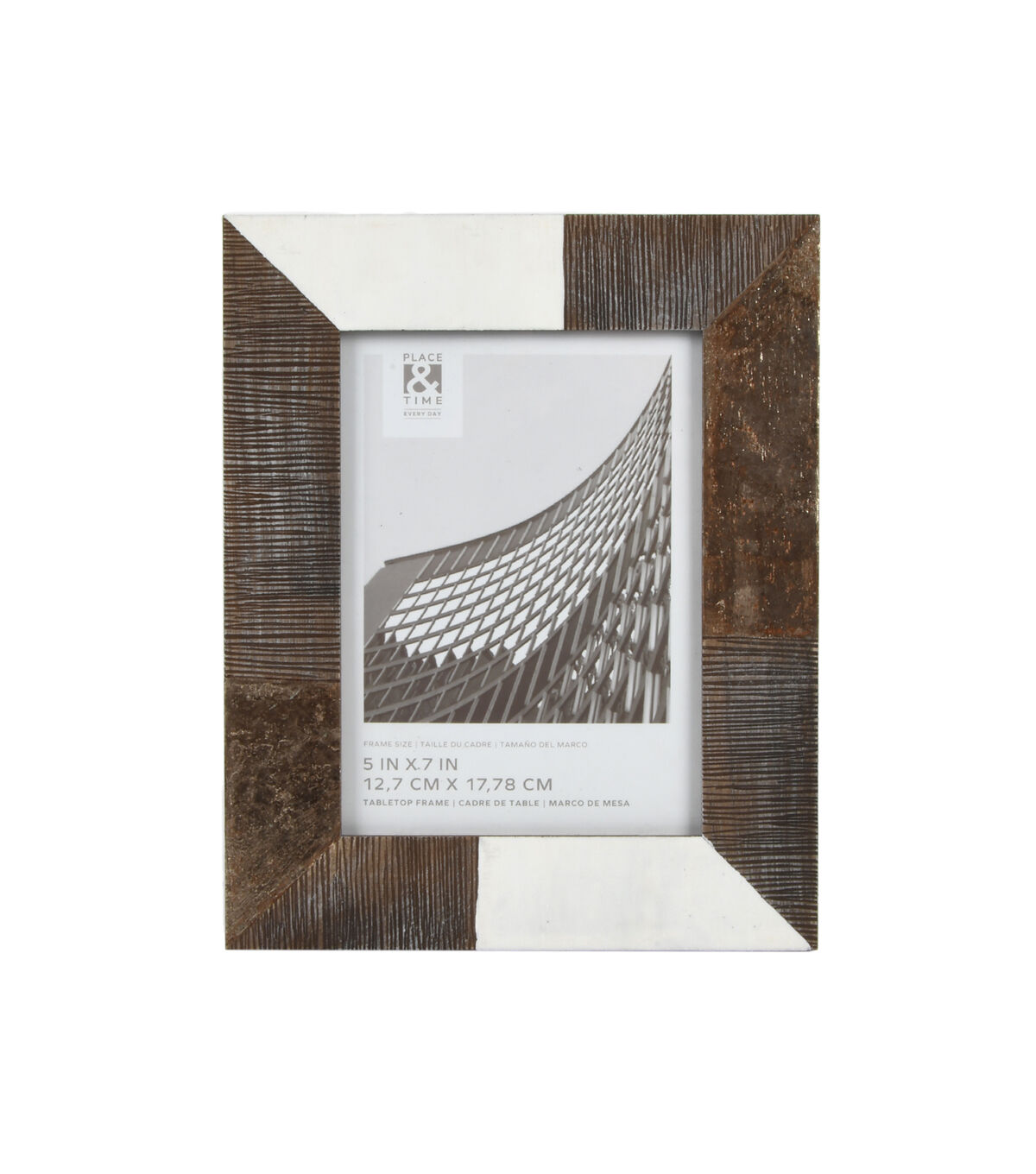 You’ll adore this striking, metallic gold, dark brown and white Pierced Foil 5x7 picture frame. The frame is a beautiful addition to any modern, boho, or transitional home decor scheme and stylishly displays cherished photographs and memories. A study backboard, with easy opening tabs, keeps your photos firmly in place while the clear glass front protects and preserves your photographs. Hang the photo frame on the wall or use the easel-back to display it standing upright on a desk or bookshelf.