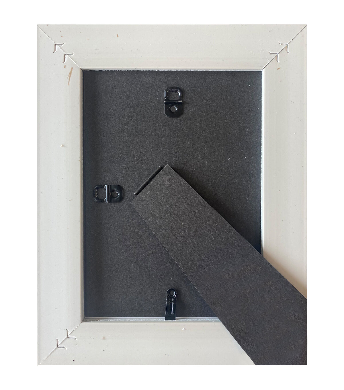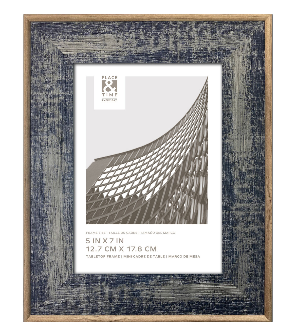 Textural elements shine in our Rowan tabletop frame. Featuring a distressed navy finish and natural colored outer piping, this frame adds visual interest to any space. The glass face ensures that your treasured photos and art are protected. Delivers ready to hang or display on your mantle or table with the included easel.