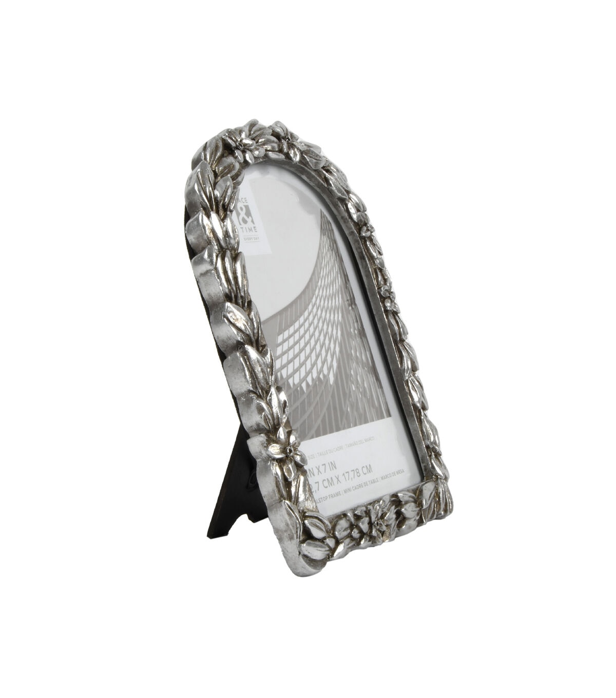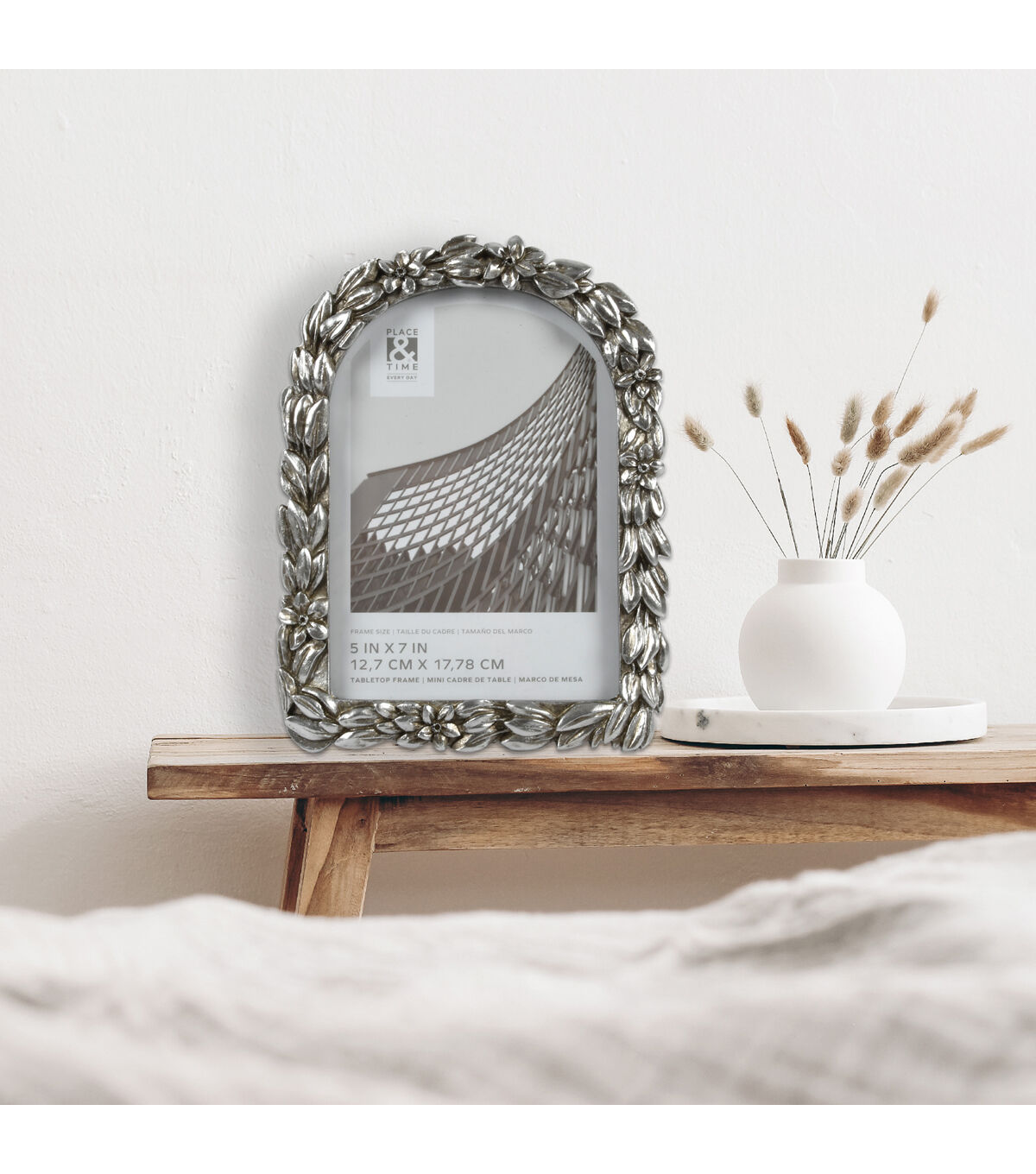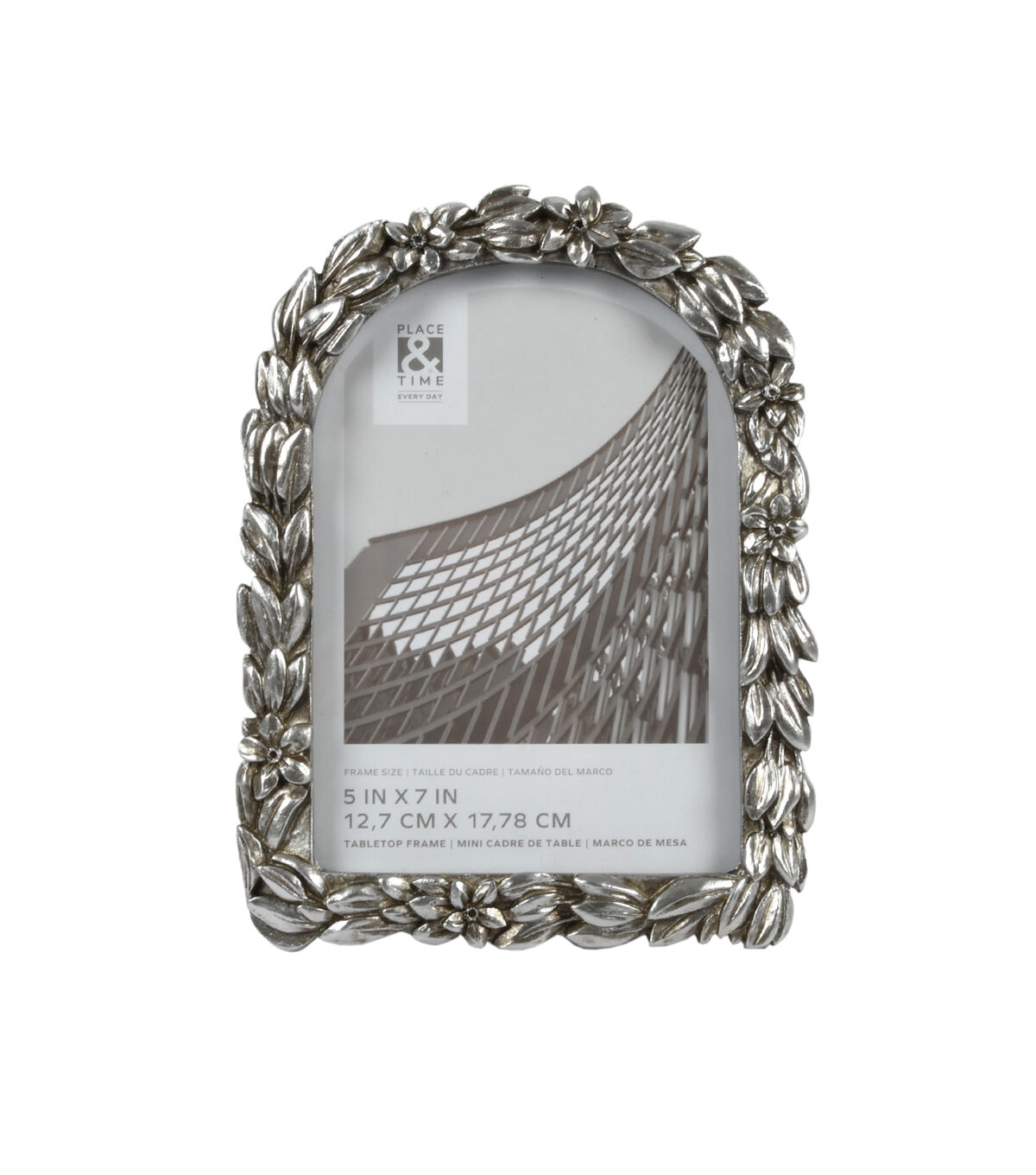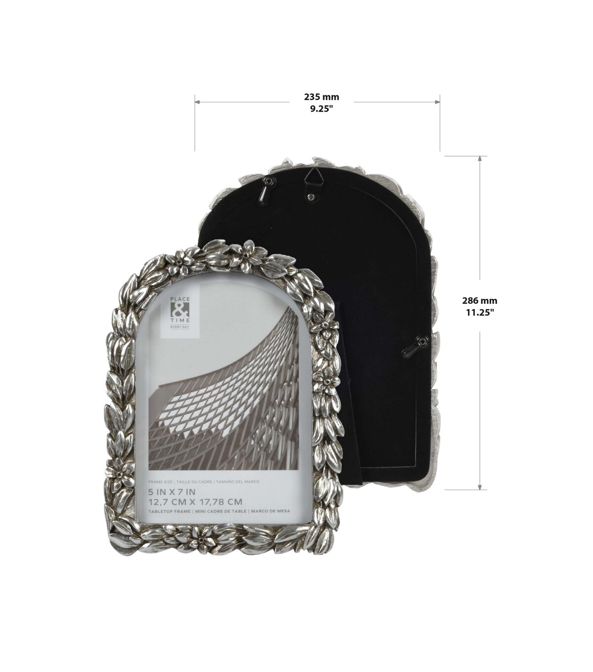 Transform your cherished memories into a work of art with the 5" x 7" Silver Sculpted Leaf Tabletop Picture Frame by Place & Time. This stunning picture frame is designed with textured leaf and floral details that add a touch of vintage appeal to your home decor. Whether you have a glam, eclectic, or vintage style, this charming photo frame is the perfect finishing touch to your living space. It's also an ideal way to highlight a wedding or other romantic photograph.