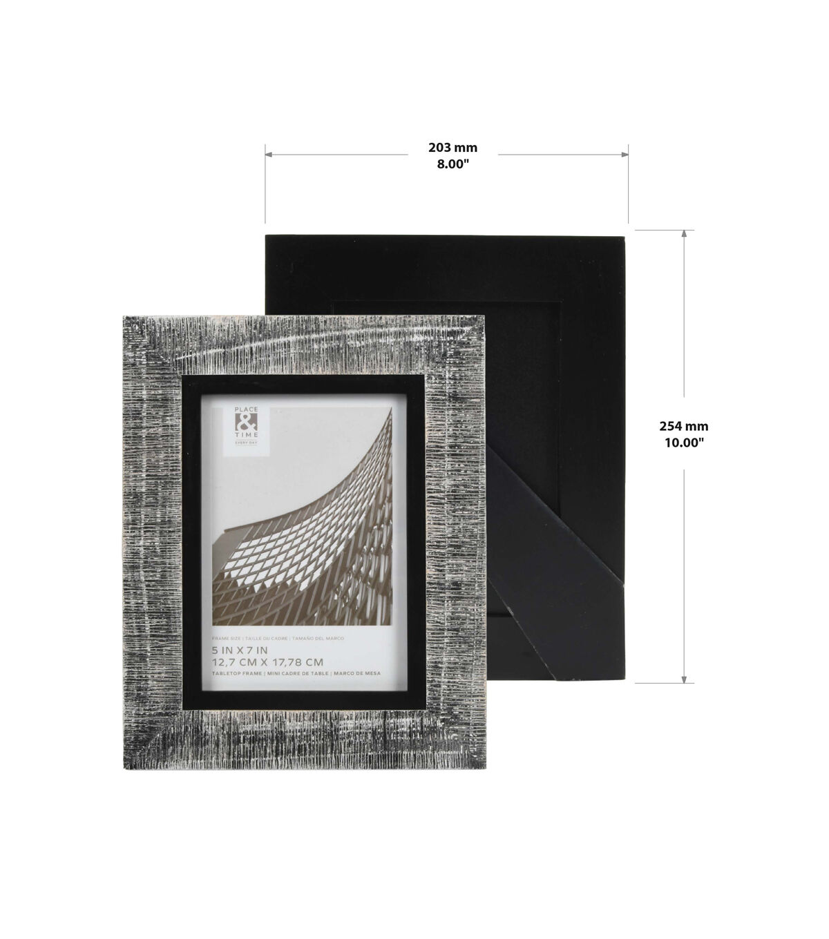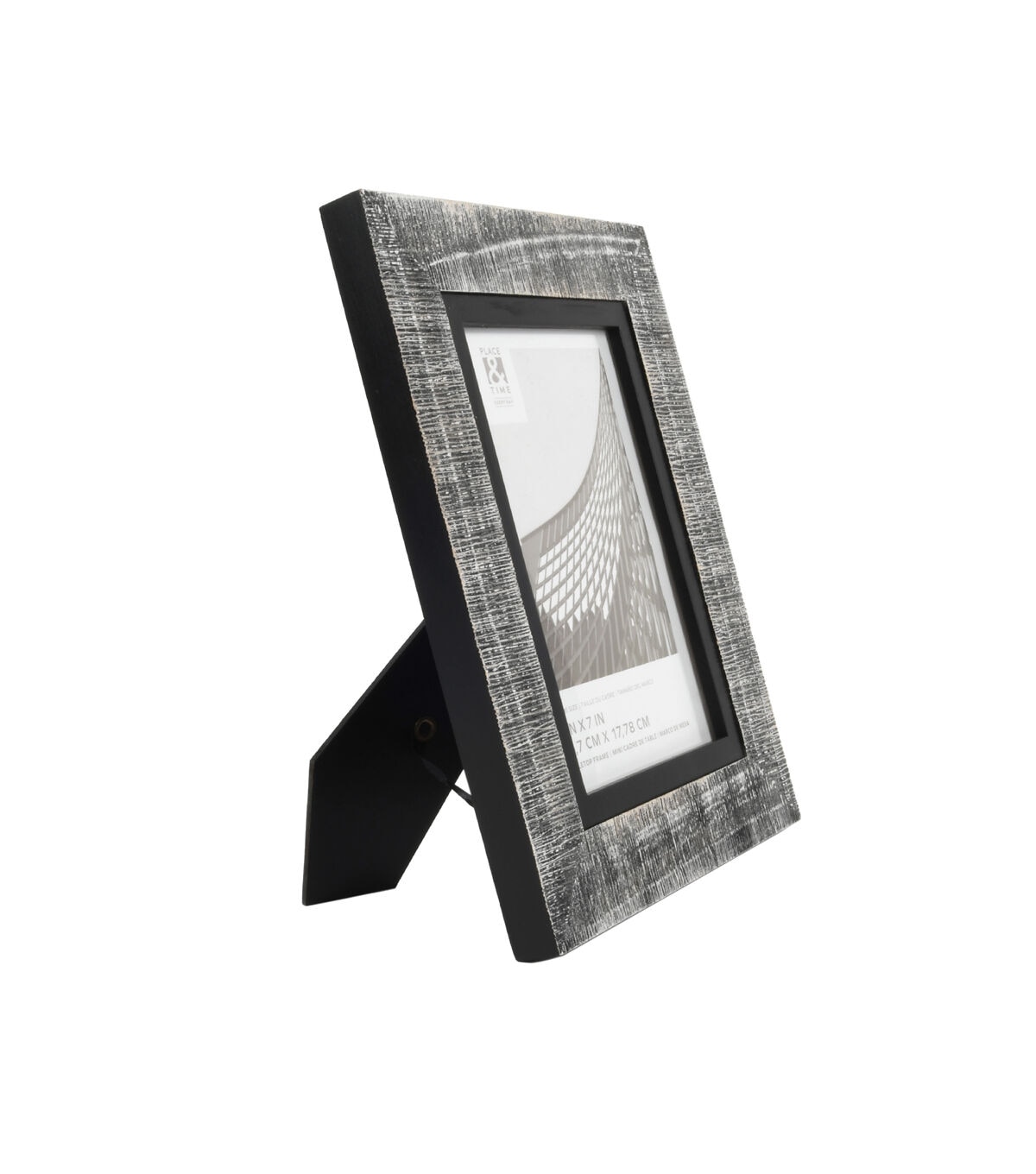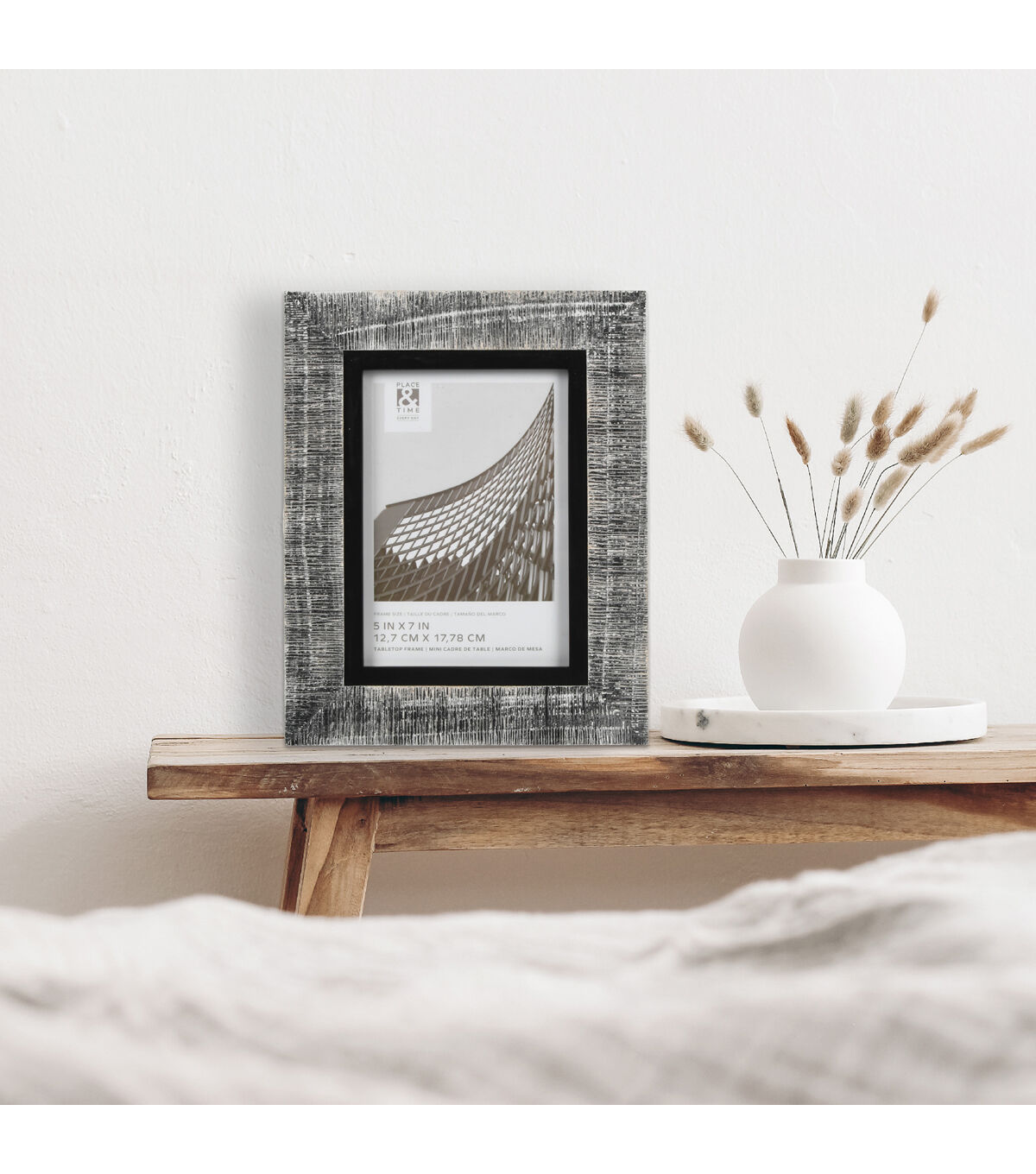 Showcase cherished memories with this striking boho chic 5x7 wood picture frame. Made from natural wood finished in a textured black-white pattern with a contrasting black fillet to highlight a favorite photograph or print. A sturdy backboard with easy opening tabs keeps your photos firmly in place, while the clear glass front protects and preserves your photographs from dust and damage. Designed for wall hanging or tabletop presentation with a multi-directional easel for vertical or horizontal display. Perfect for your home or office, or makes a thoughtful gift.