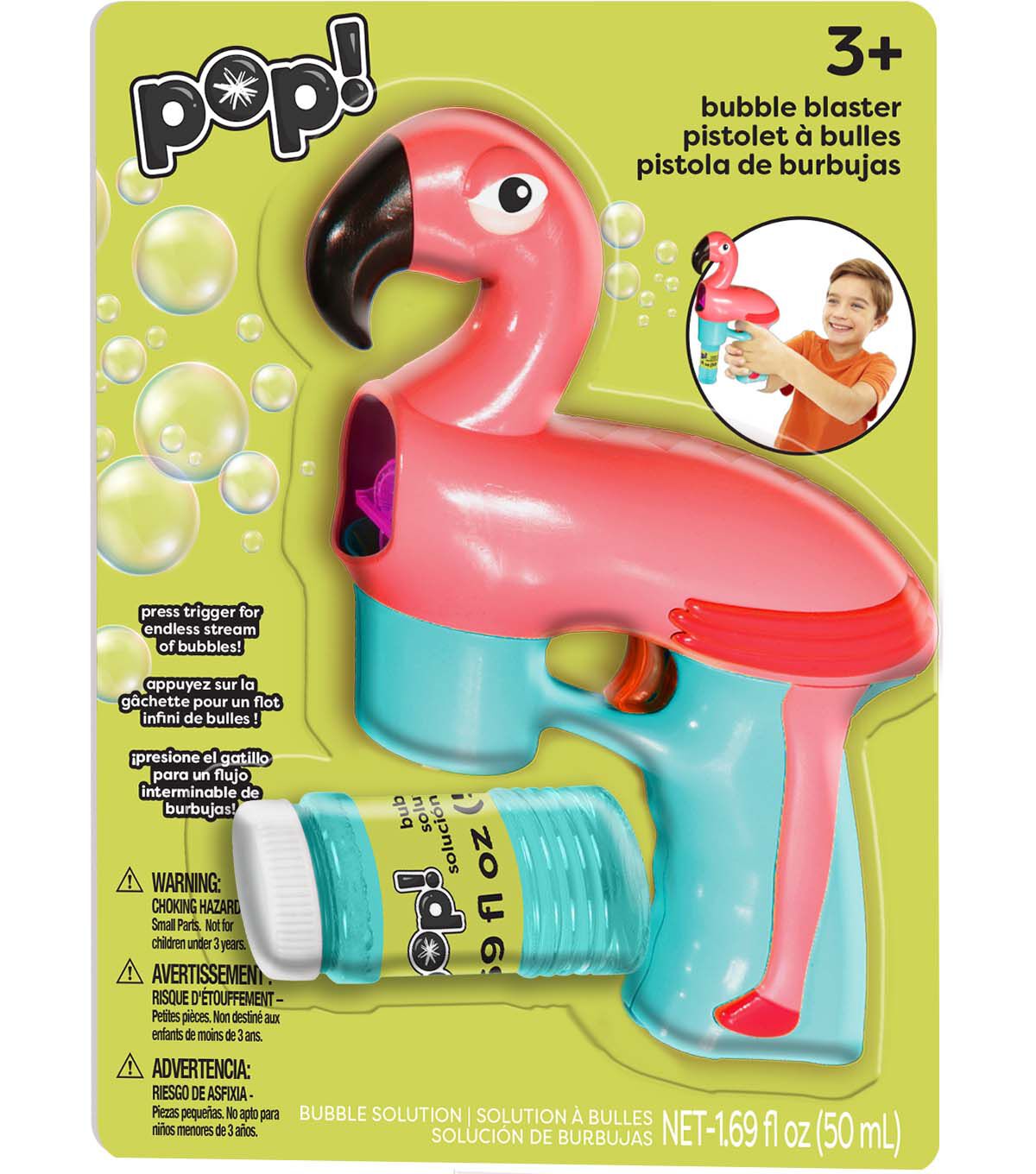 Get ready for tons of bubbles! Our Flamingo Bubble Blaster is great for summer fun! This toy is made for children 3+ with an easy pull button and no spill fun Flamingo design! Requires 3 AAA batteries.