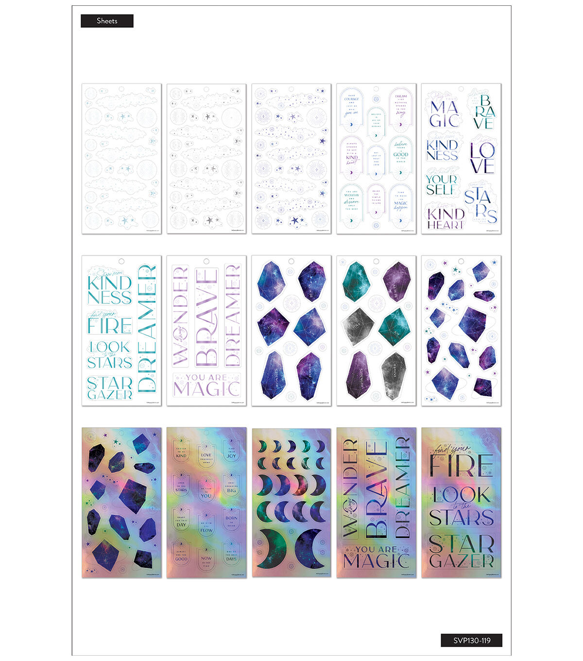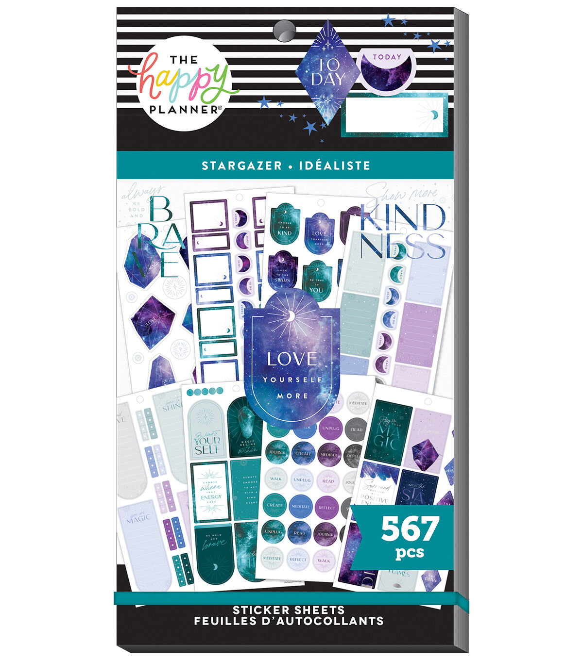 Follow the stars. This Value Pack Sticker Book has 30 sheets with 567 stickers. This celestial sticker book includes transparent designs, iridescent stickers, lots of crystals, and productivity stickers.
