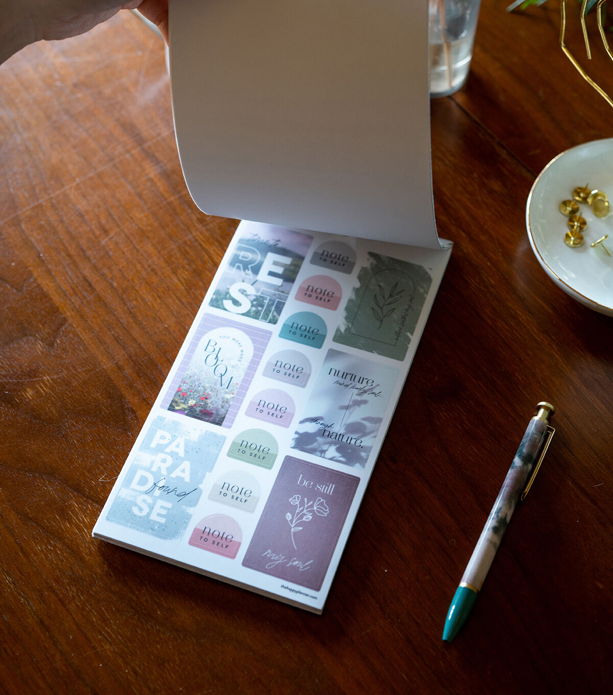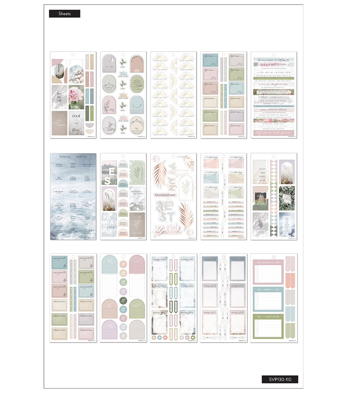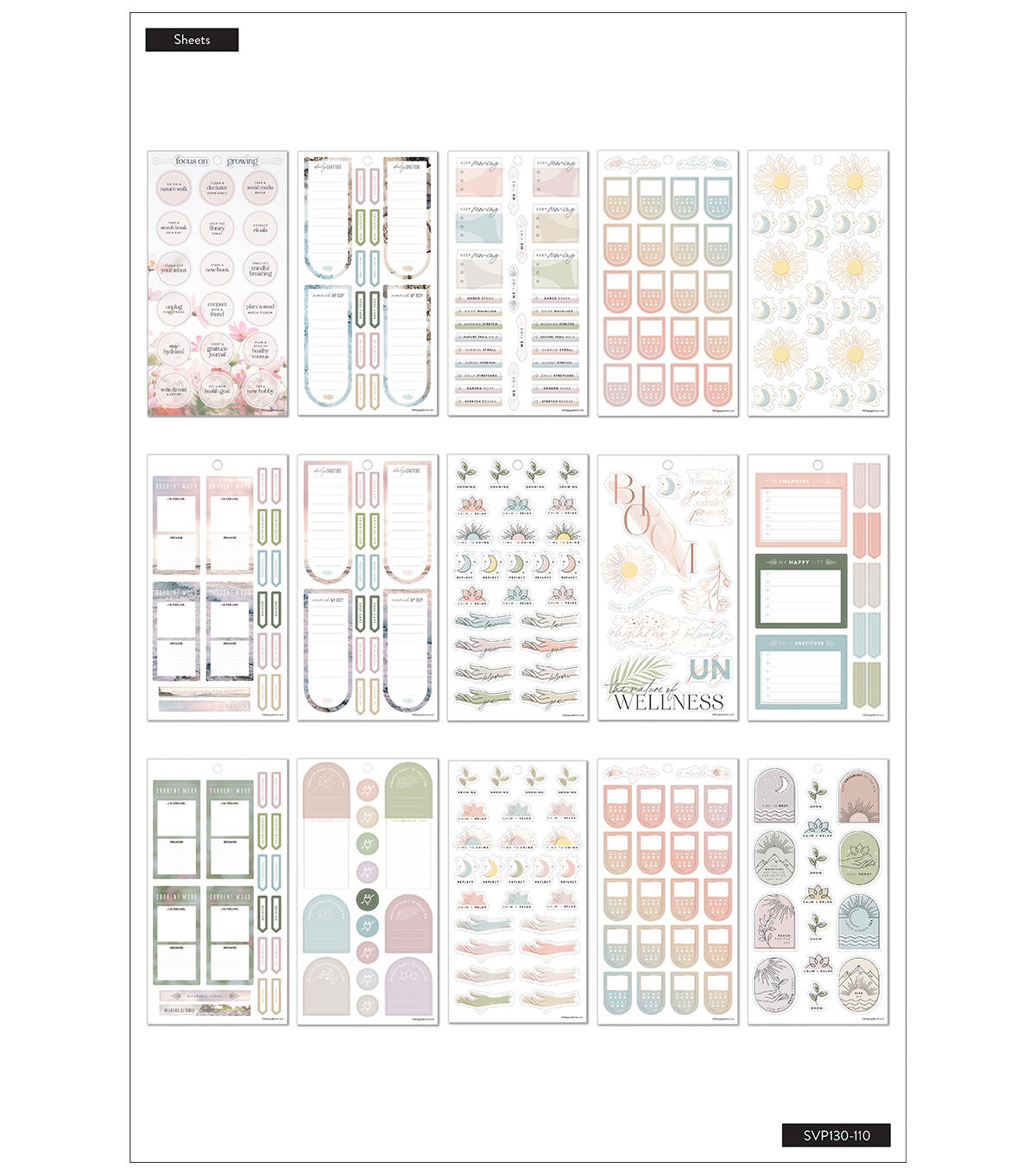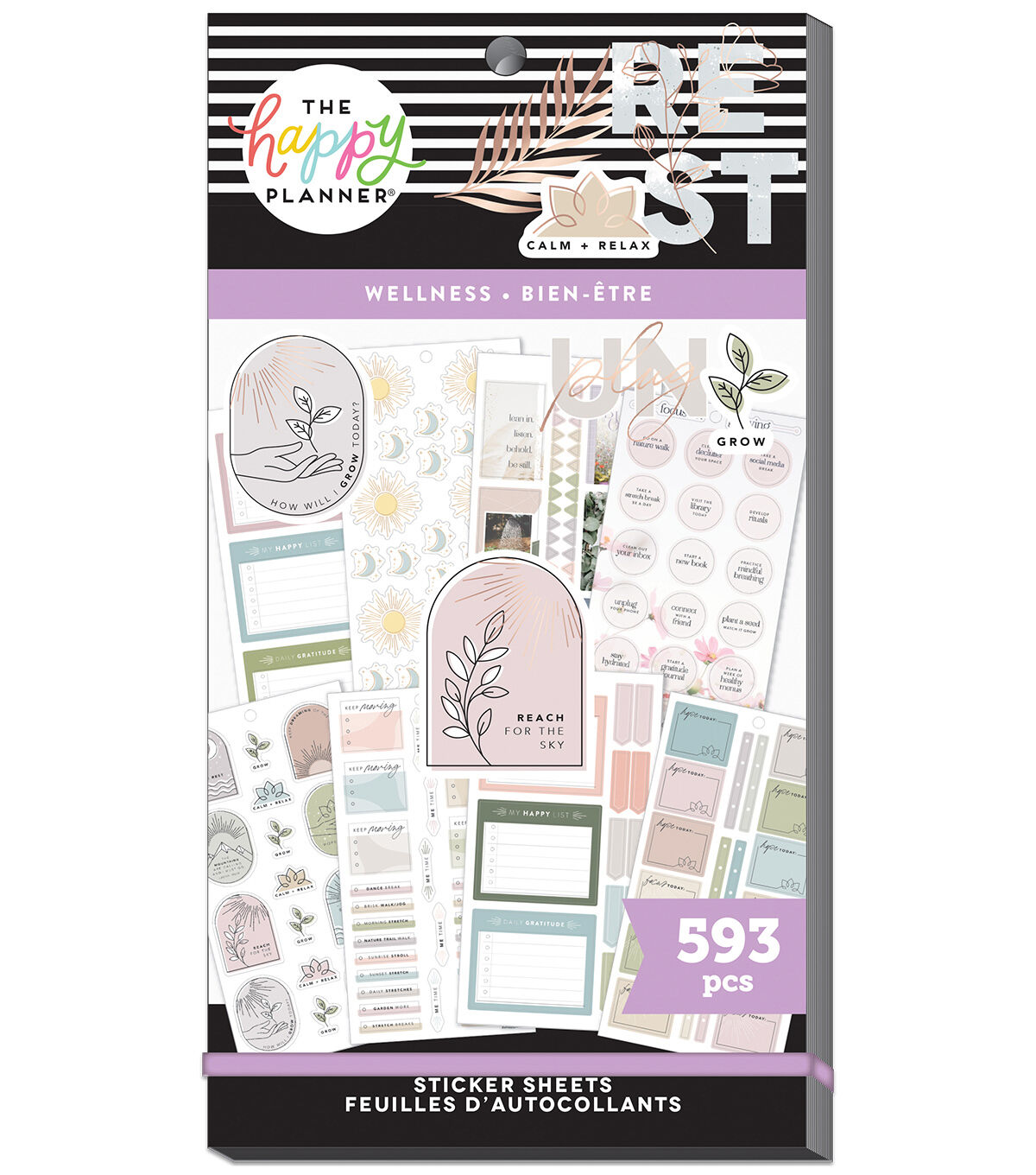 Don't forget to take care of yourself. This Value Pack Sticker Book has 30 sheets with 593 stickers. This wellness themed sticker book features muted pastels, colorful boxes, prompts for reflection and gold foil stickers.