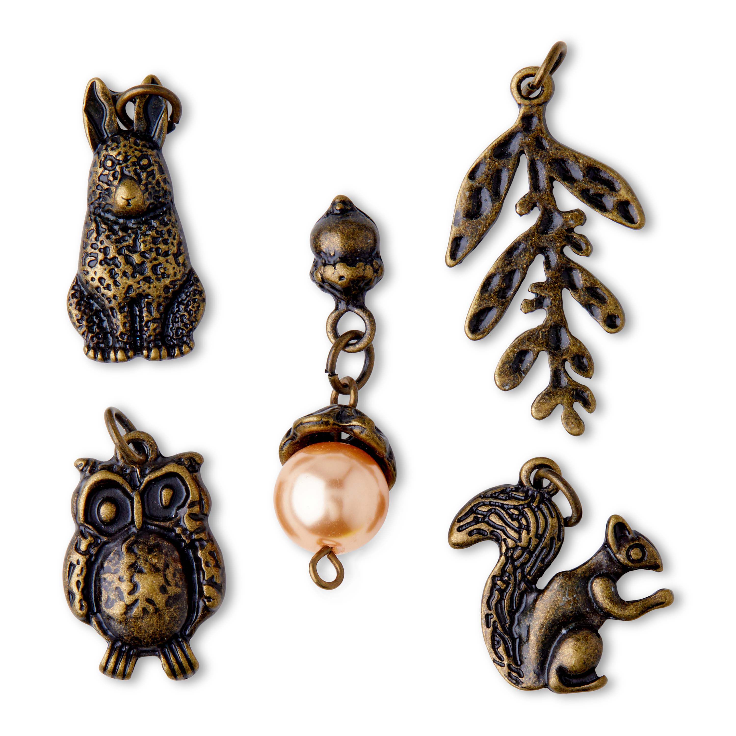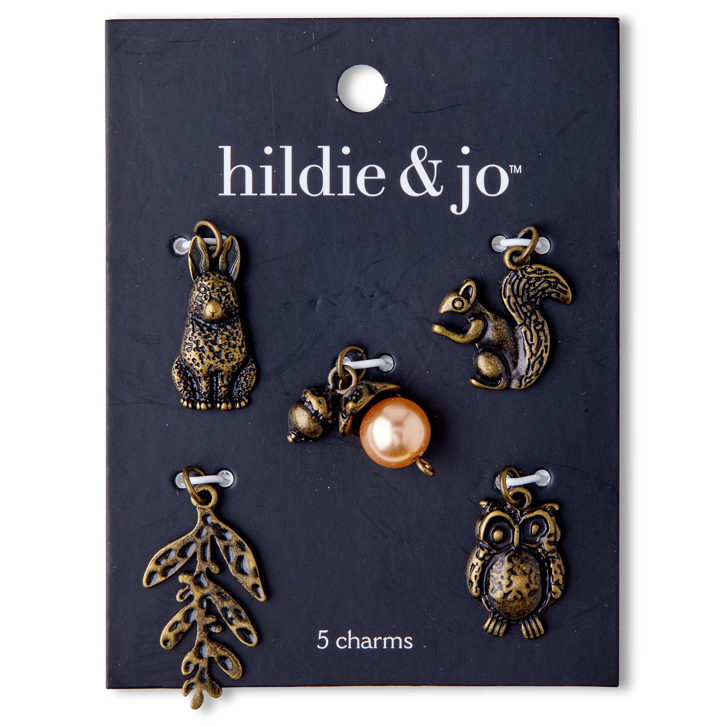 Design beautiful pieces of jewelry using the hildie & jo Animal Charms - Antique Brass. These charms sport an antique brass tone and each one is unique. They are shaped like a squirrel, owl, rabbit and leaf stem. The last charm in this set is designed with a bead and acorn-shaped accent. Use them to make necklaces, bracelets and more.