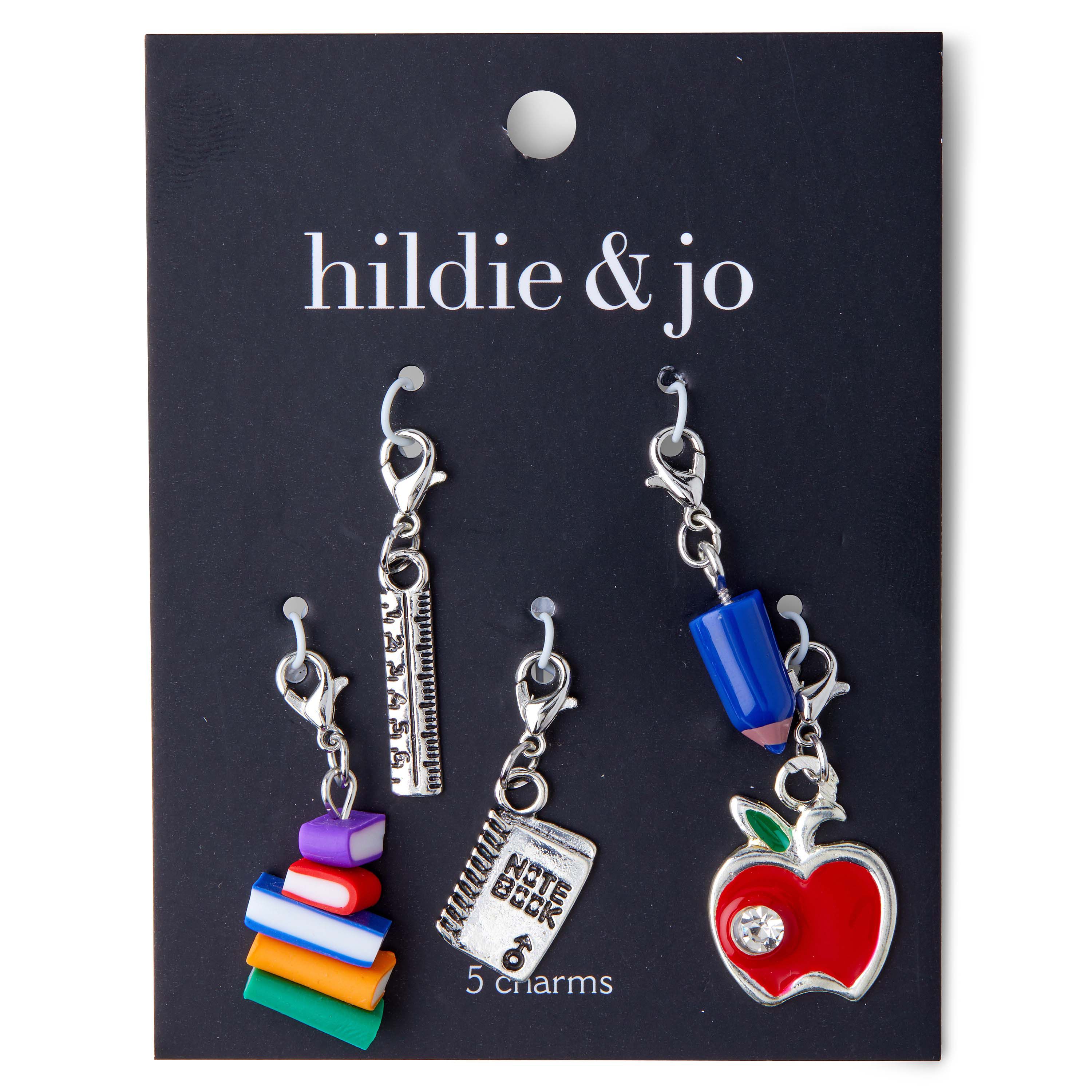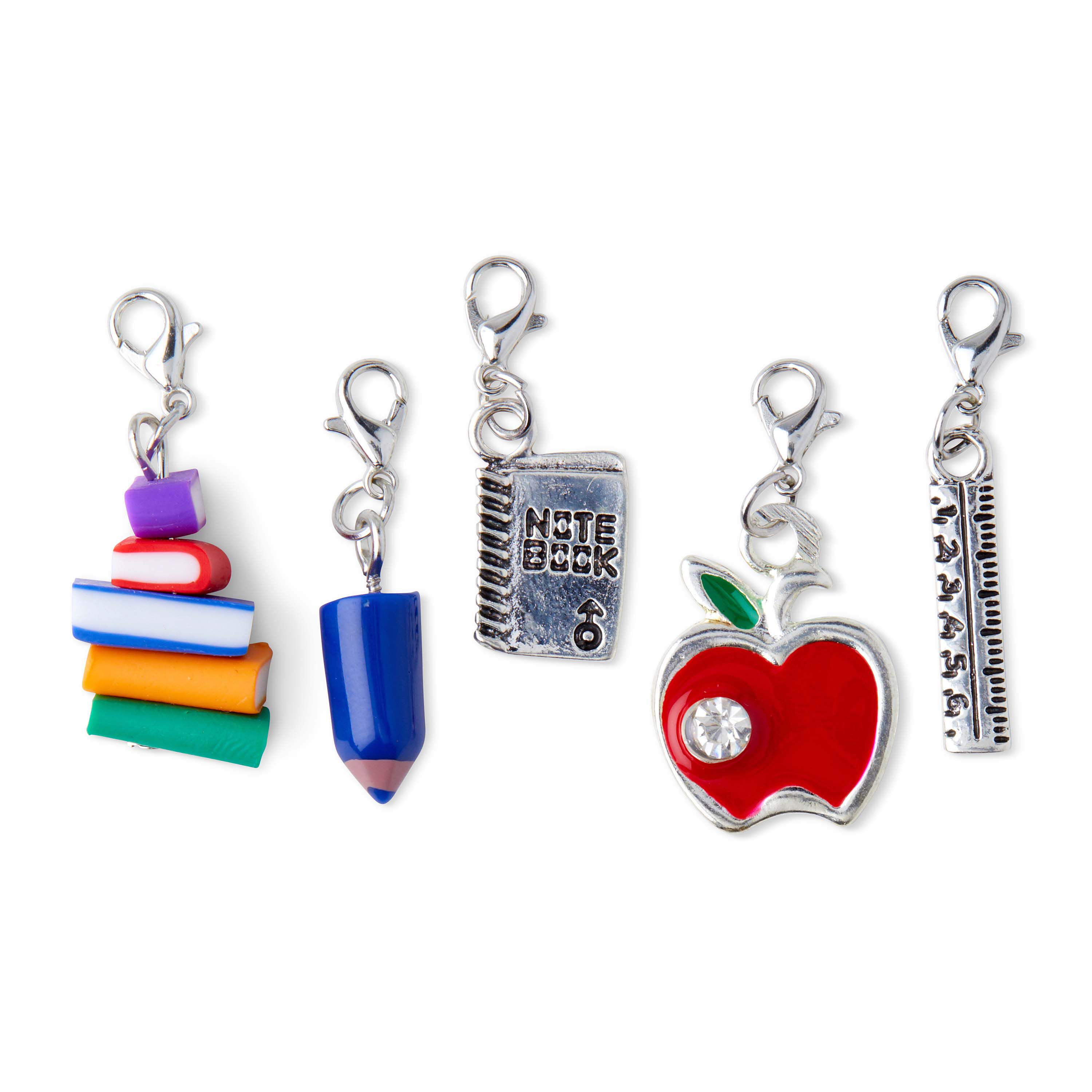 Create jewelry for your favorite teacher using the hildie & jo Teacher Charms - Multi. This pack includes five charms. One of the charms is shaped like a notebook and another resembles a pencil. The third one in this set is shaped like an apple and studded with a stone, the fourth one resembles a stack of books and the last one is shaped like a ruler. Each of them comes with a lobster clasp and can also be attached to keychains or backpack zippers.