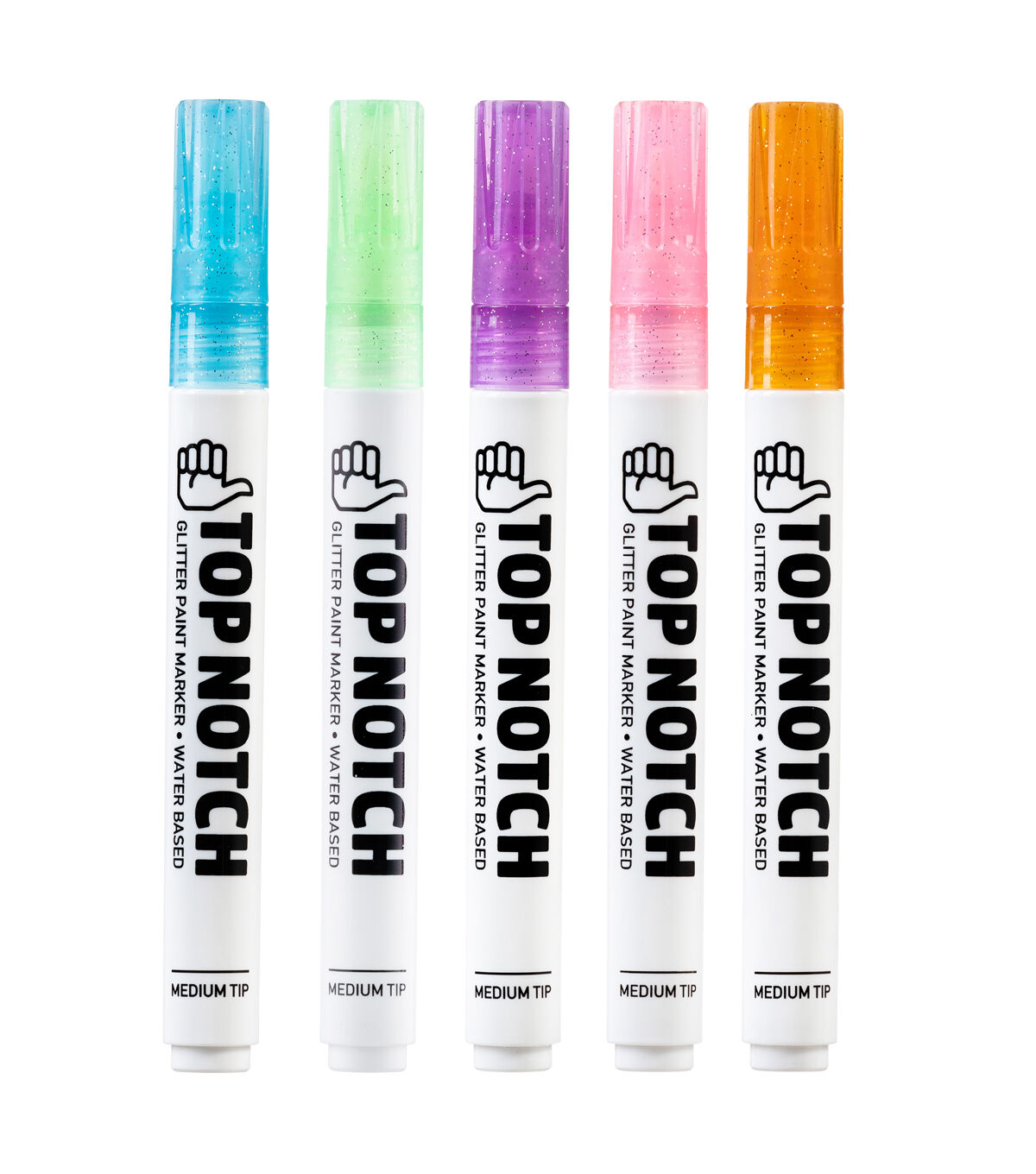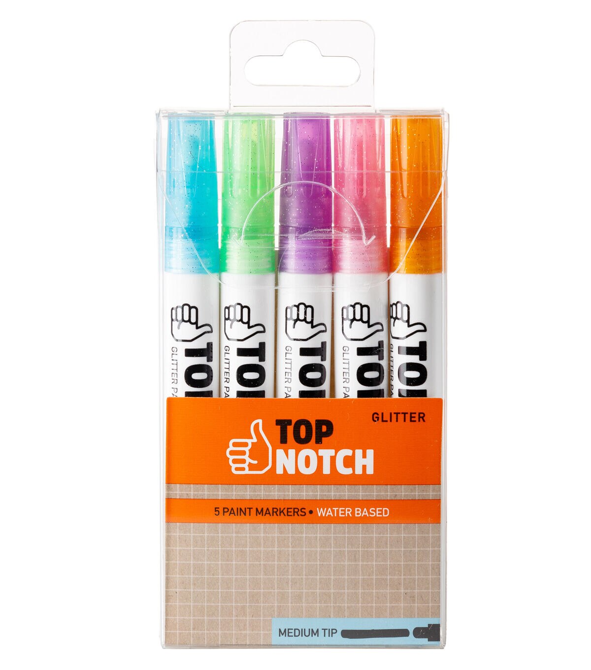 Lend the perfect finishing touch to your DIY craft projects with the Top Notch Medium Tip Water Based Glitter Paint Markers - Pastel. These water-based paint markers in glitter pastel hues have a medium tip. Use them to draw sparkly stripes and geometric patterns on a variety of surfaces. This pack consists of five markers.